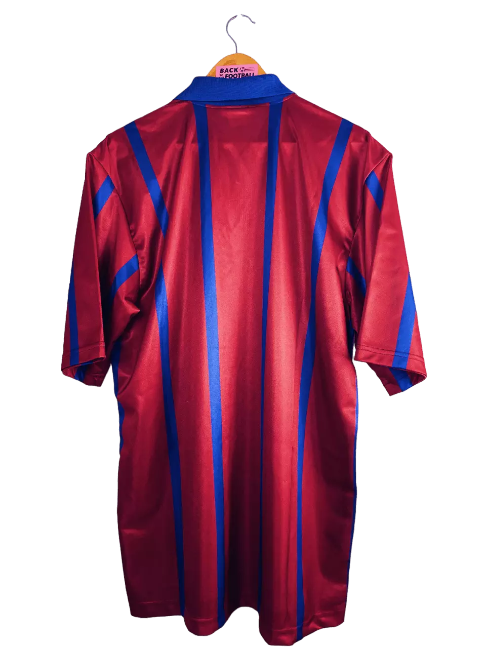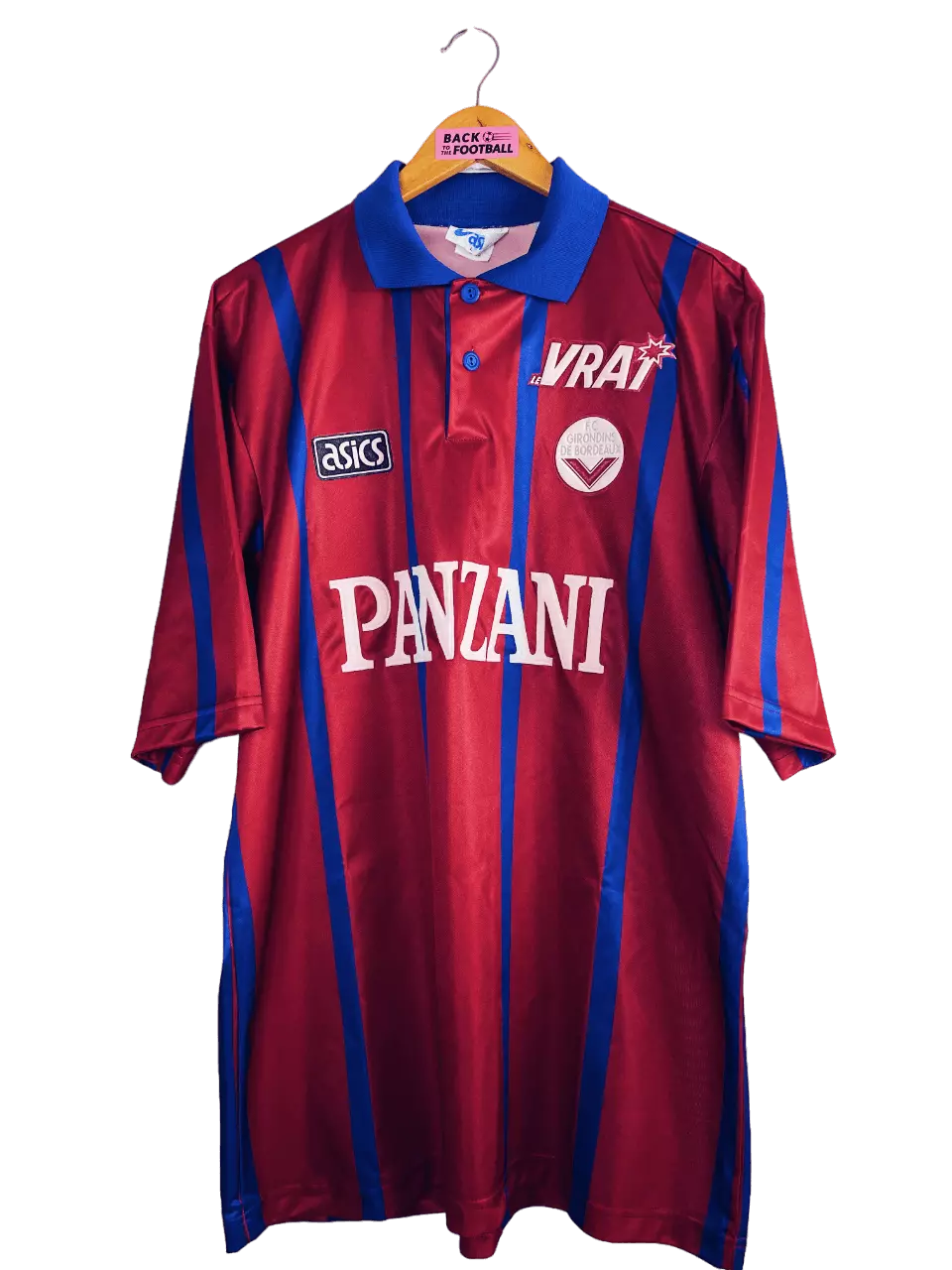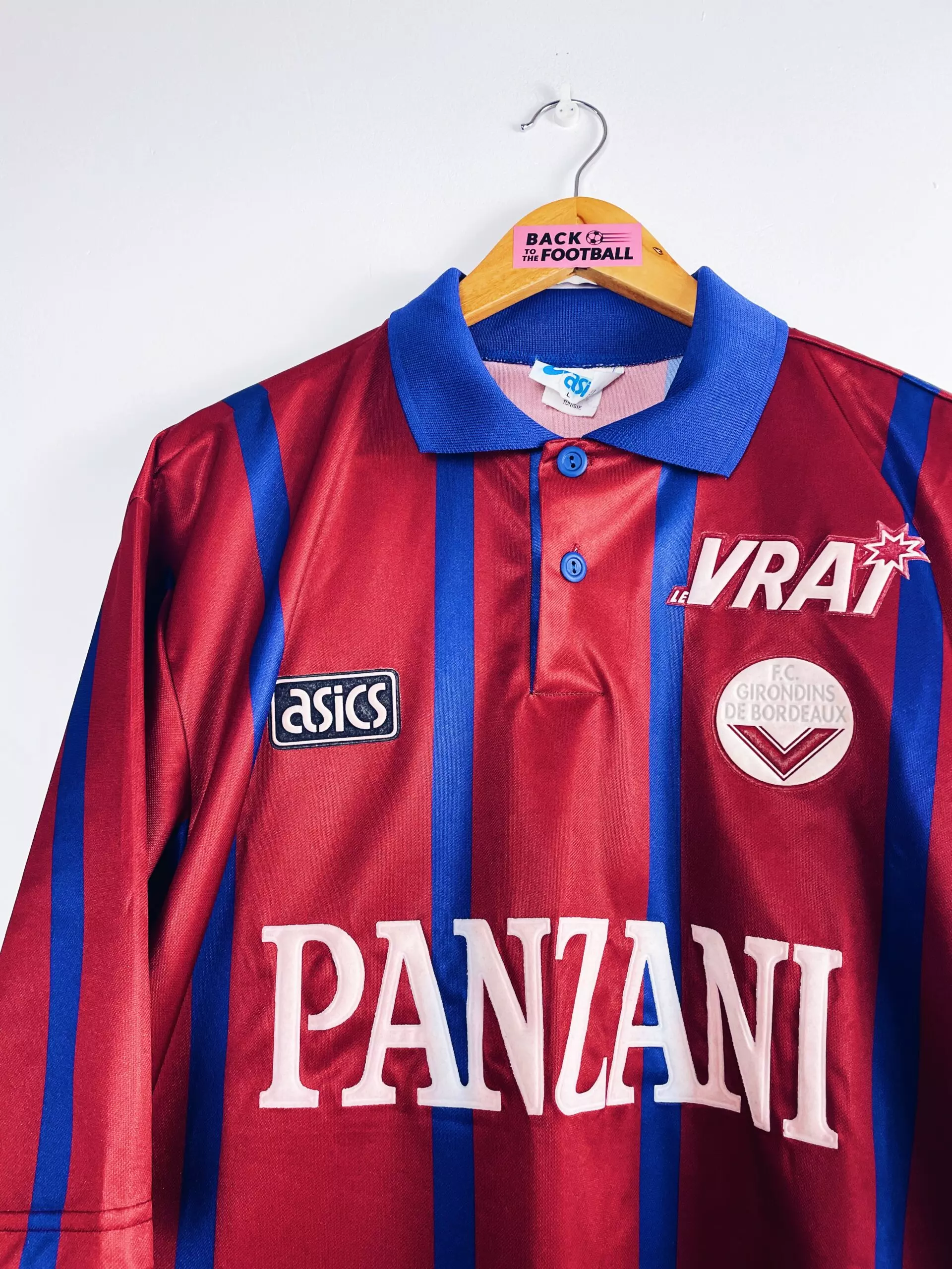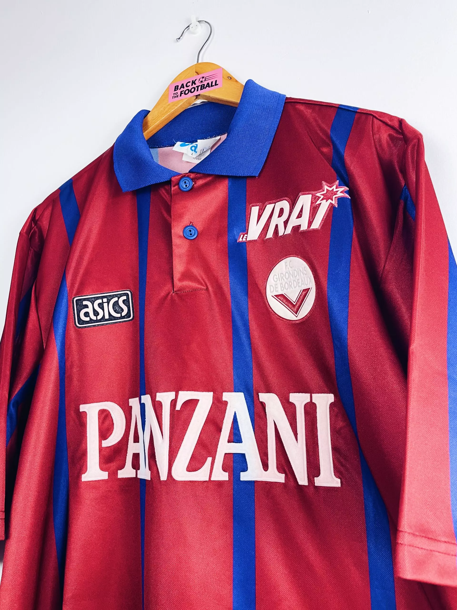 Taille : L Etat : 8/10, très bon état, la feutrine est très légèrement délavée par endroit (voir photo) Le maillot : maillot vintage domicile des Girondins de Bordeaux 1994/1995, époque Zidane, Lizarazu, Dugarry… L’ancien écusson des Girondins est en feutrine, le logo Asics et les sponsors Panzani et le Vrai aussi. Très beau maillot rétro des Girondins ! Histoire : les Girondins terminent 7èmes du championnat. En Coupe UEFA, ils iront jusqu’en 16èmes mais seront éliminés par Katowice. Et les bordelais iront jusqu’en quart de Coupe de France, battus par Strasbourg. Quelques joueurs : Zidane, Bixente Lizarazu, Dugarry, Fournier,…
