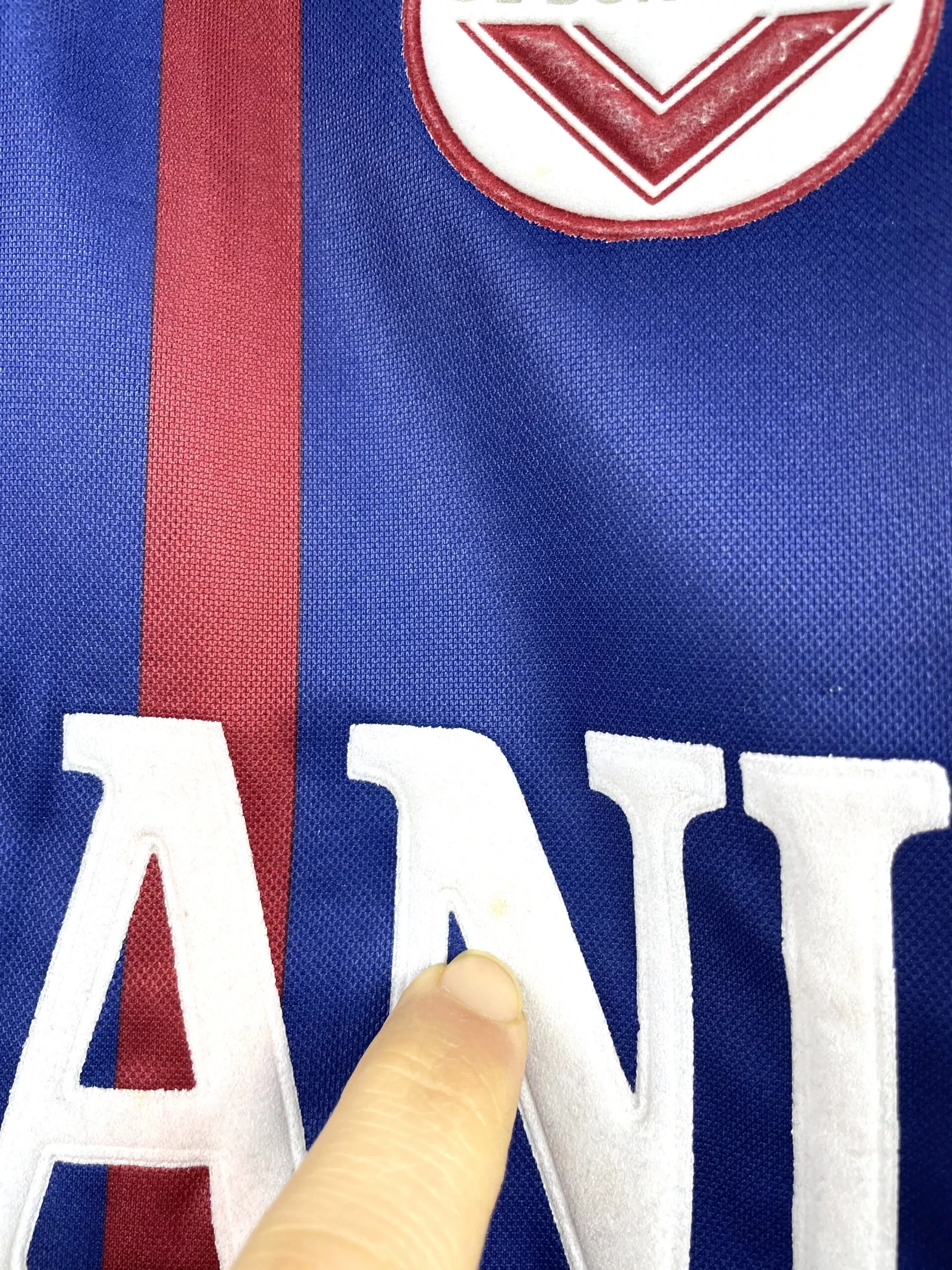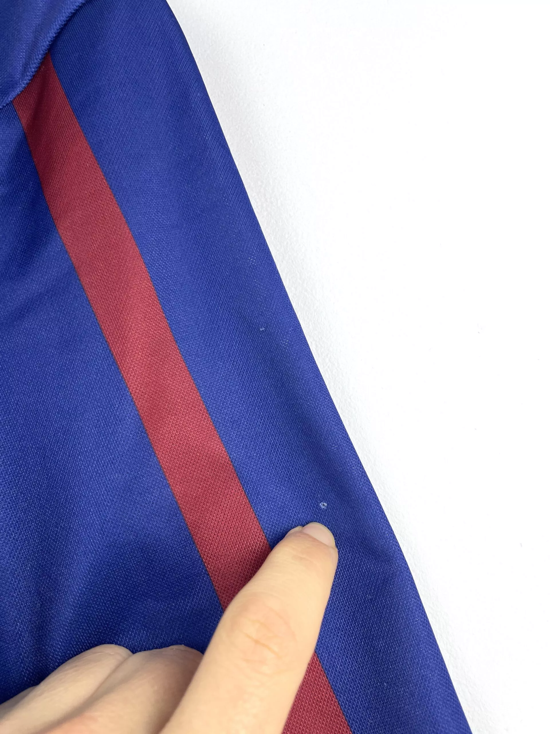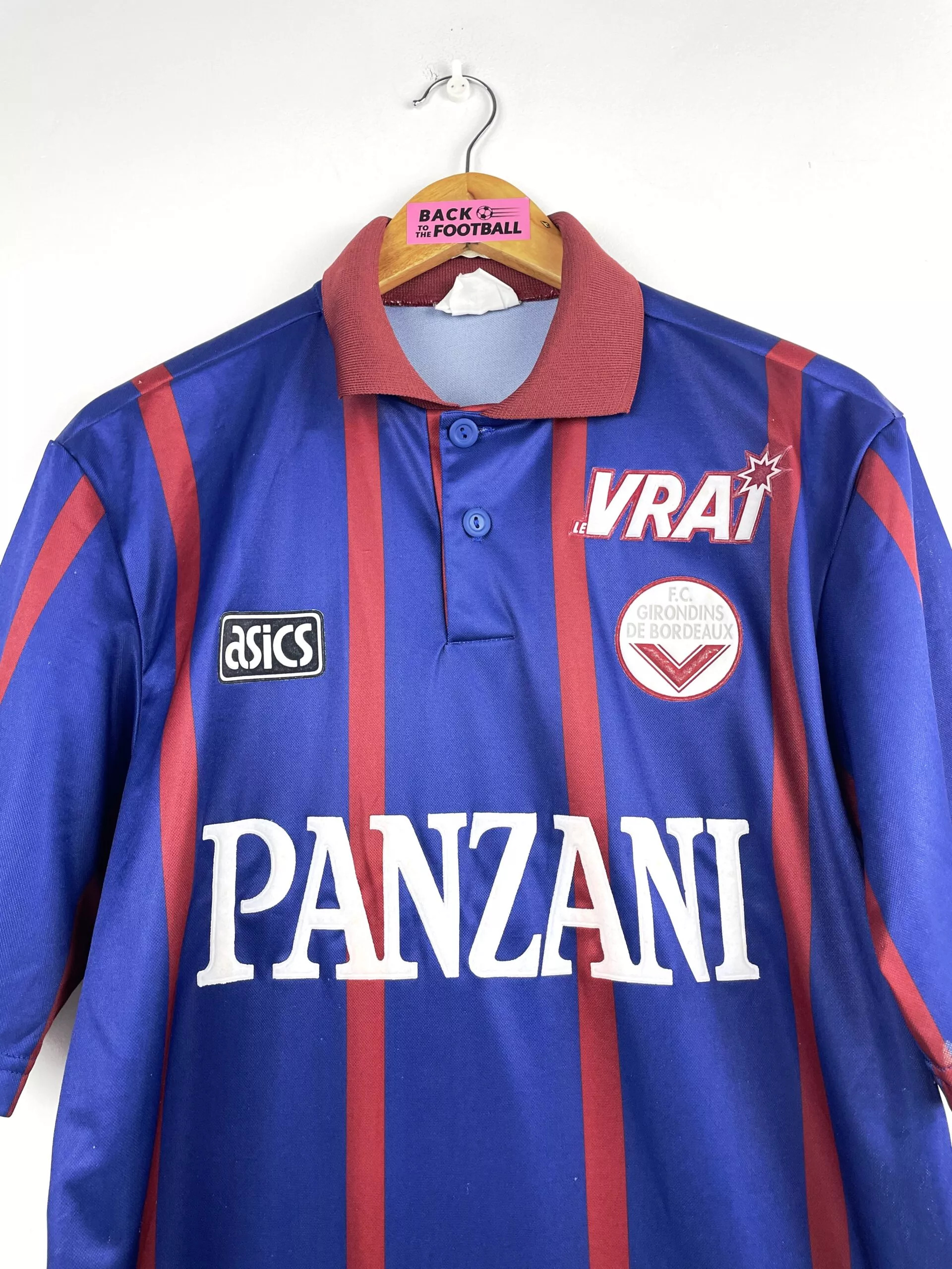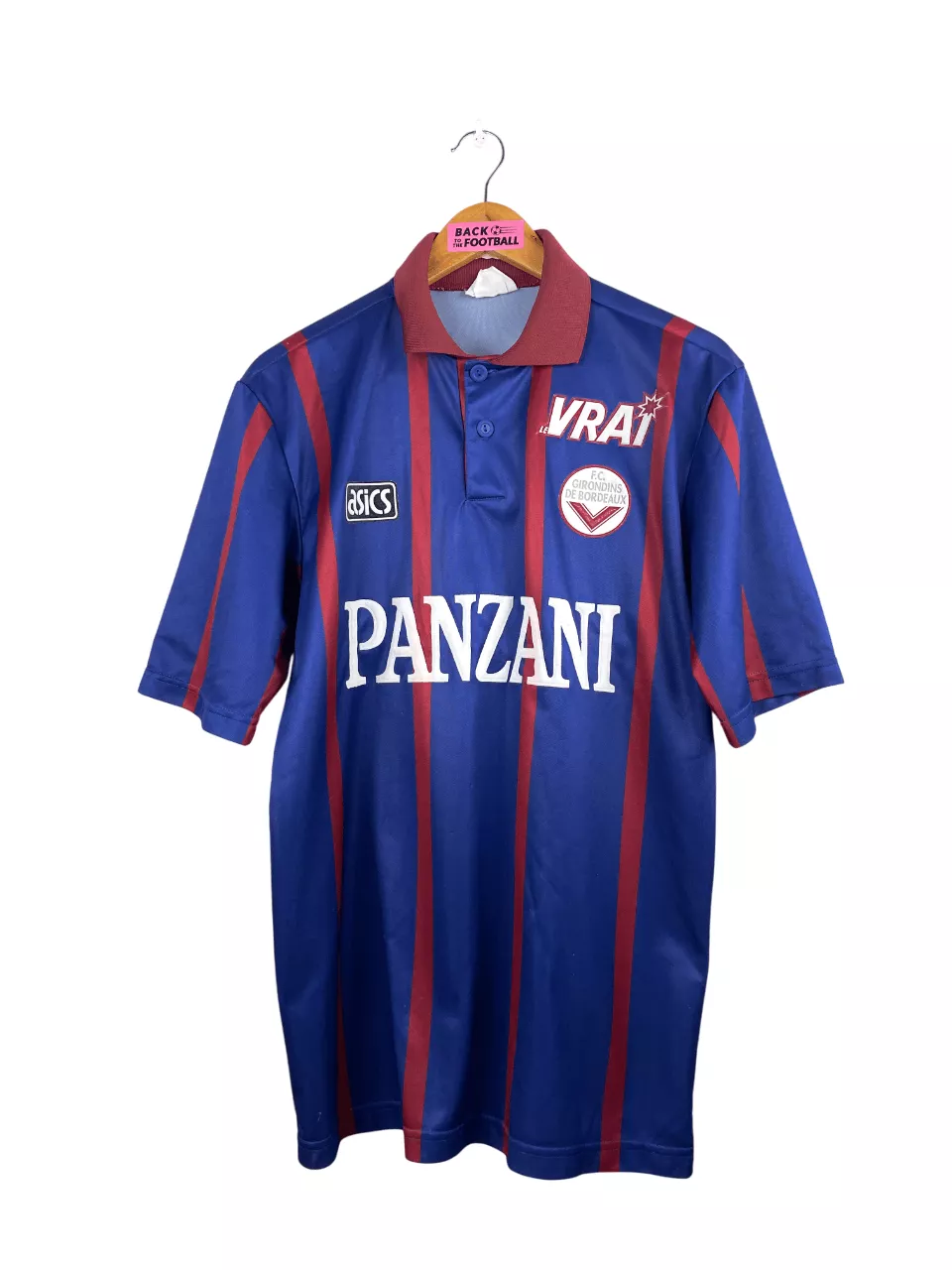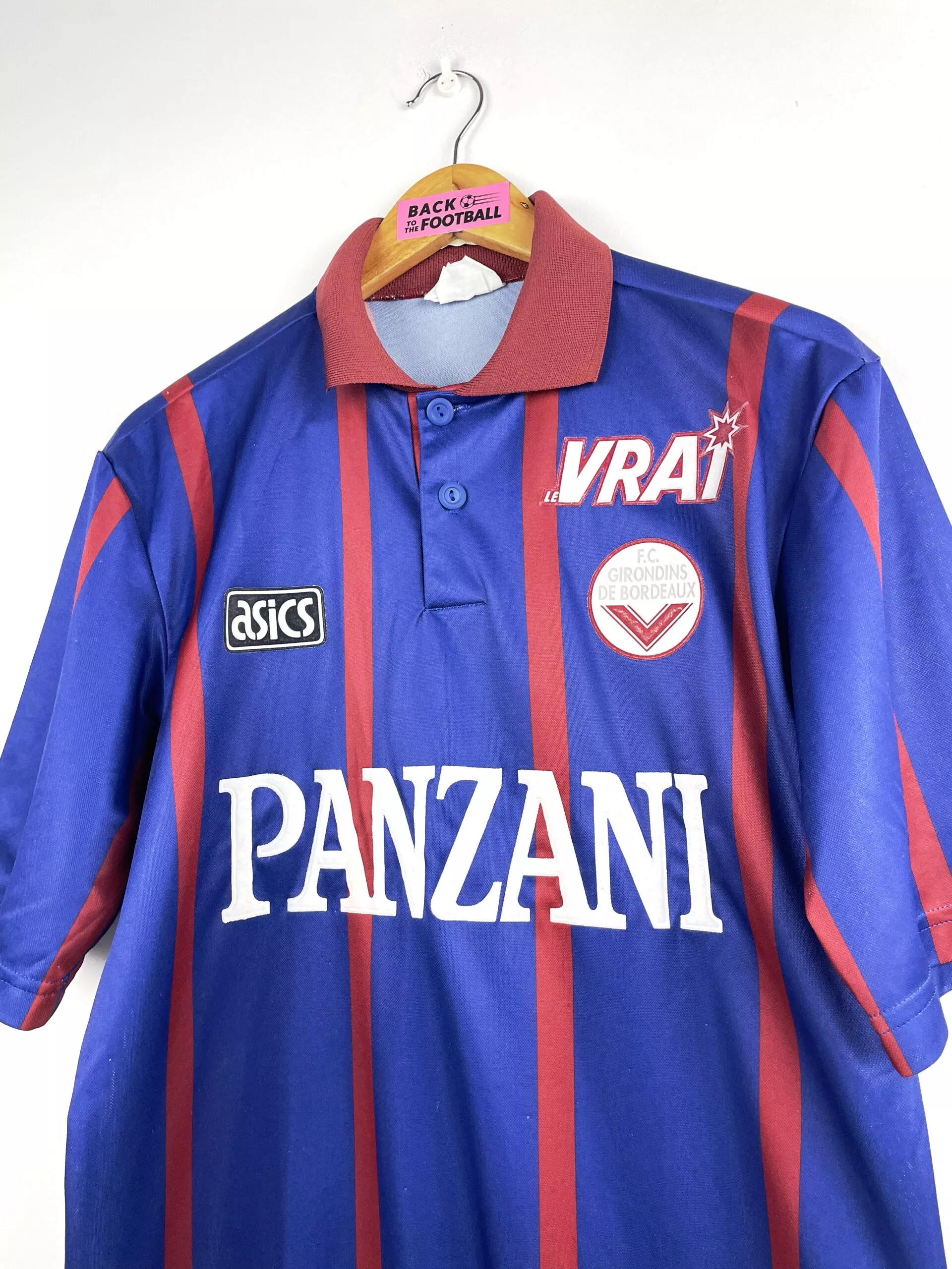 Taille : S mais taille large, peut aller à un M Largeur : 52cm (aisselle à aisselle) Longueur : 72cm (base du col au bas) Si tu veux plus de détails, tu peux nous contacter par mail ou sur les réseaux 😉 Etat : 8.5/10, excellent état. quelques bouloches (voir photos) Le maillot : maillot vintage domicile des Girondins de Bordeaux 1994/1995. L’écusson, le logo Asics et les sponsors Panzani et le Vrai sont en feutrine. Très beau maillot rétro des Girondins ! Histoire : les Girondins terminent 7èmes du championnat. En Coupe UEFA, ils iront jusqu’en 16èmes mais seront…