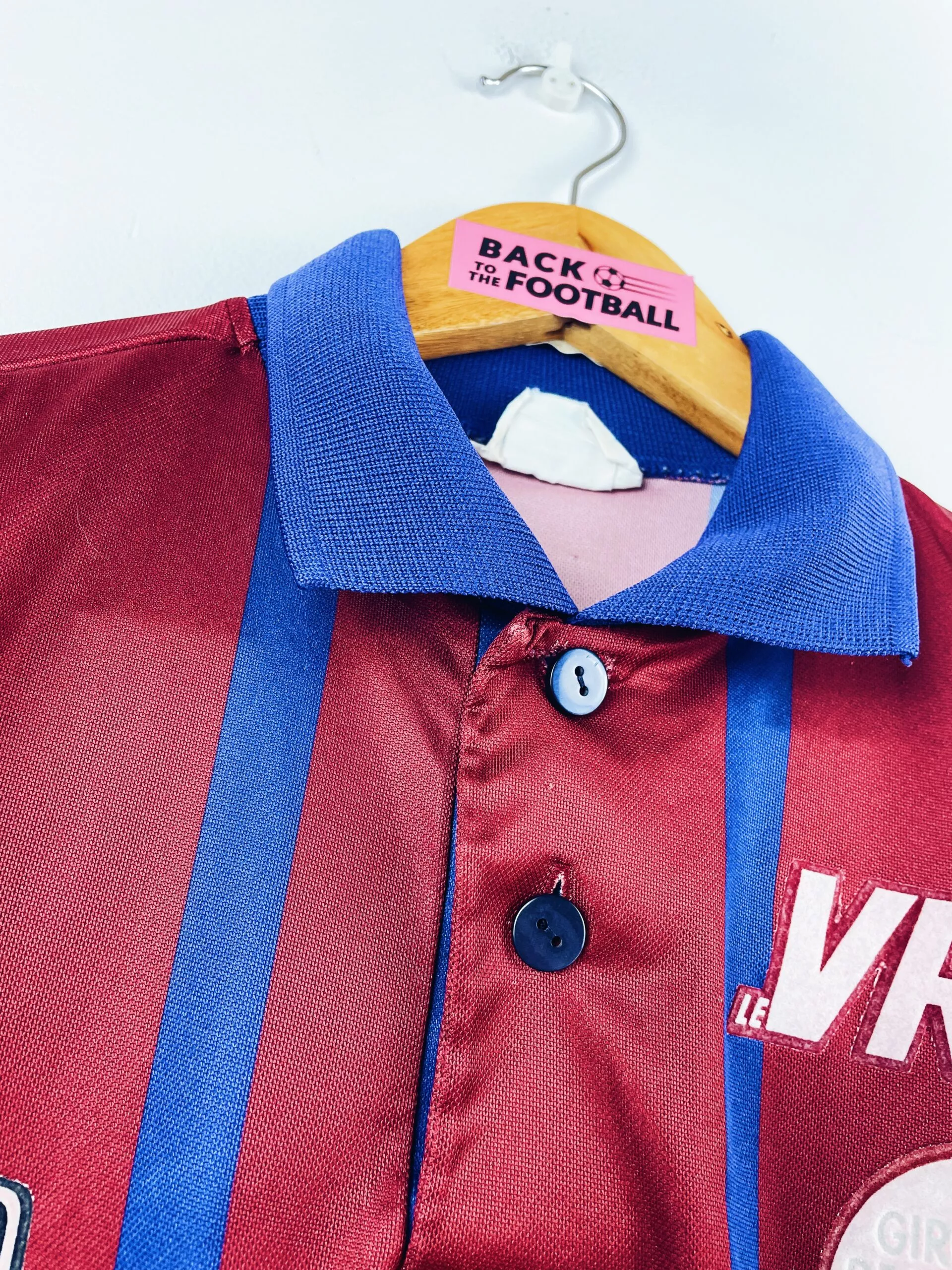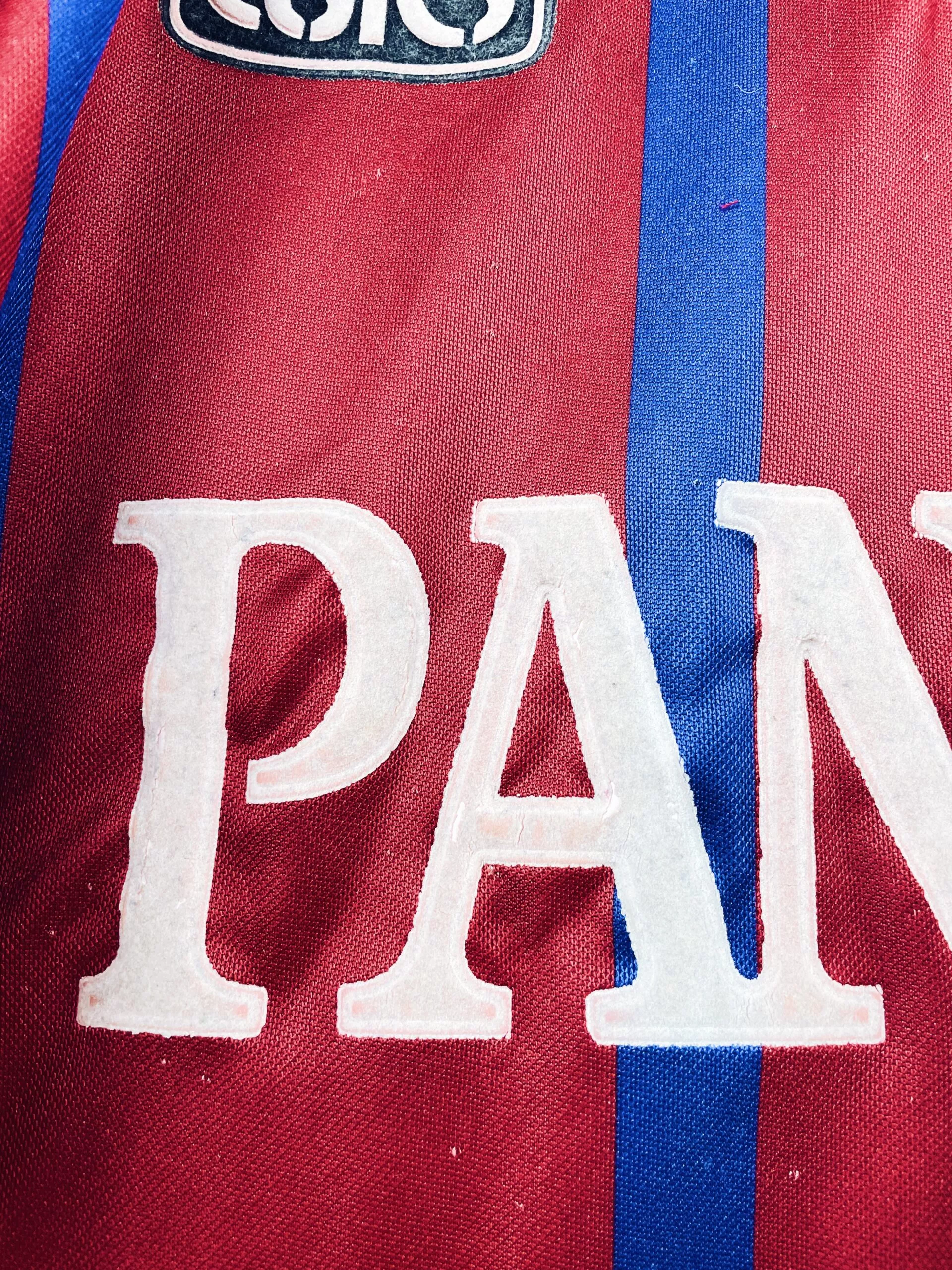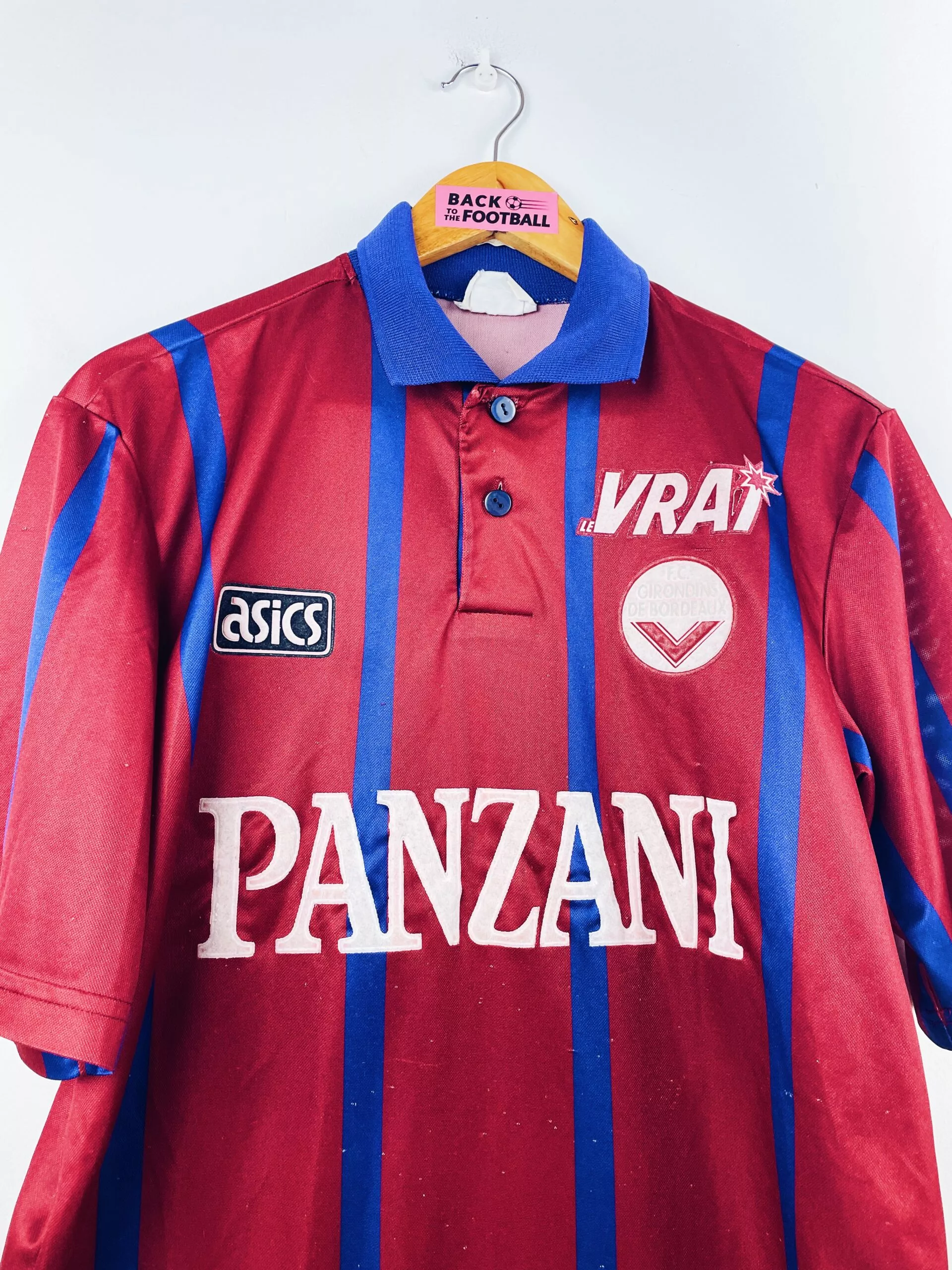 Taille : S Si tu veux plus de détails, tu peux nous contacter par mail ou sur les réseaux 😉 Etat : 7/10, bon état. Beaucoup de bouloches, feutrine Panzani abimée (voir photos) Le maillot : maillot vintage domicile des Girondins de Bordeaux 1994/1995. L’écusson, le logo Asics et le sponsor Panzani sont en feutrine. Très beau maillot rétro des Girondins ! Histoire : les Girondins terminent 7èmes du championnat. En Coupe UEFA, ils iront jusqu’en 16èmes mais seront éliminés par Katowice. Et les bordelais iront jusqu’en quart de Coupe de France, battus par Strasbourg. Quelques joueurs : Zidane, Bixente…