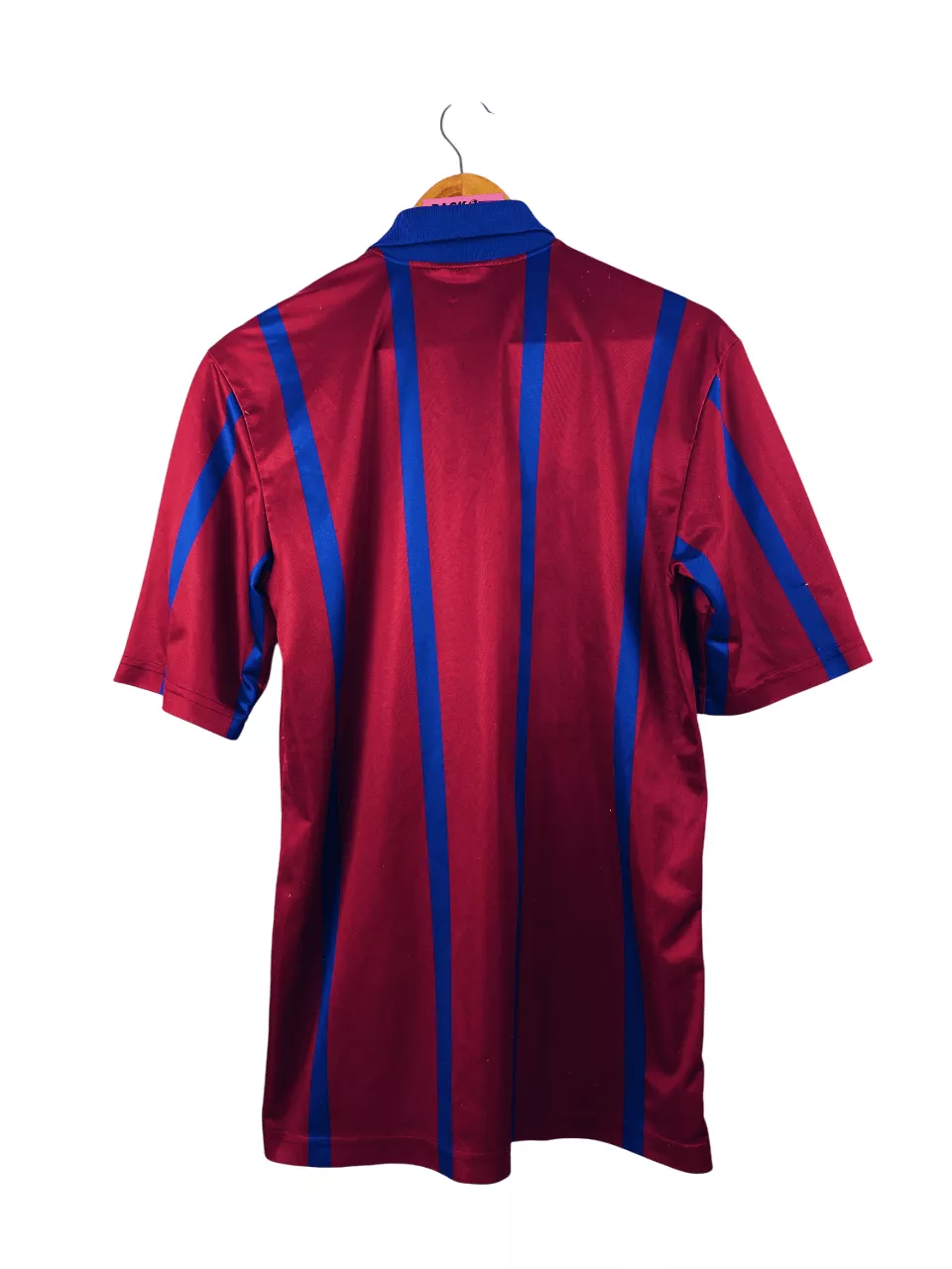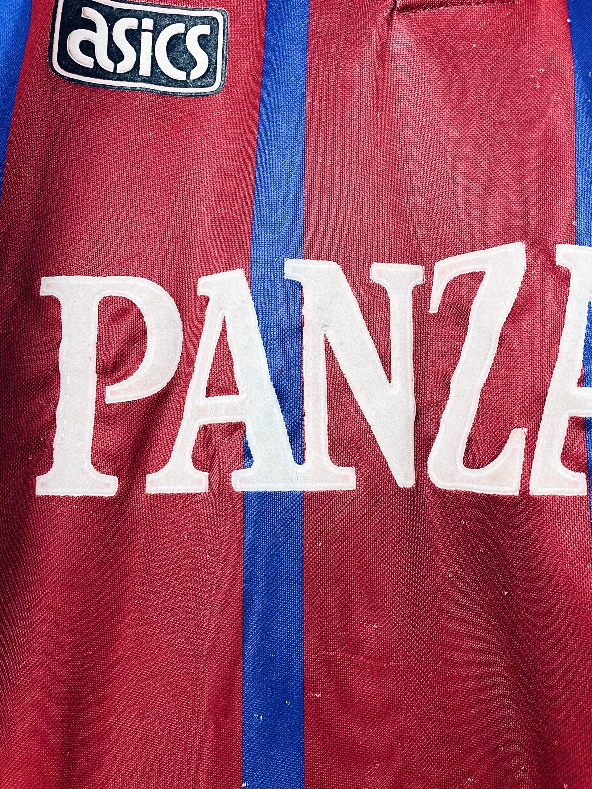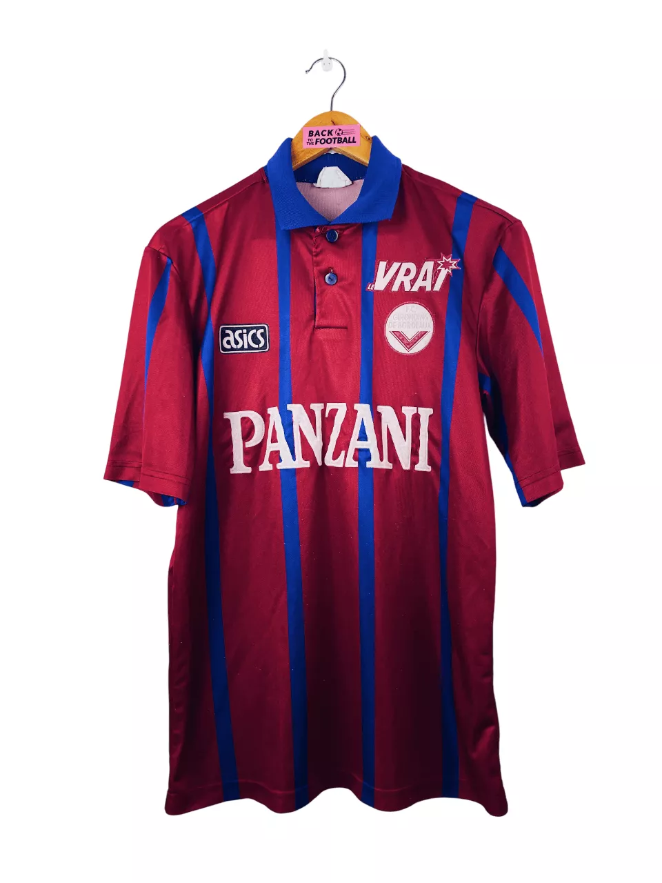 Taille : S Si tu veux plus de détails, tu peux nous contacter par mail ou sur les réseaux 😉 Etat : 7/10, bon état. Beaucoup de bouloches, feutrine Panzani abimée (voir photos) Le maillot : maillot vintage domicile des Girondins de Bordeaux 1994/1995. L’écusson, le logo Asics et le sponsor Panzani sont en feutrine. Très beau maillot rétro des Girondins ! Histoire : les Girondins terminent 7èmes du championnat. En Coupe UEFA, ils iront jusqu’en 16èmes mais seront éliminés par Katowice. Et les bordelais iront jusqu’en quart de Coupe de France, battus par Strasbourg. Quelques joueurs : Zidane, Bixente…