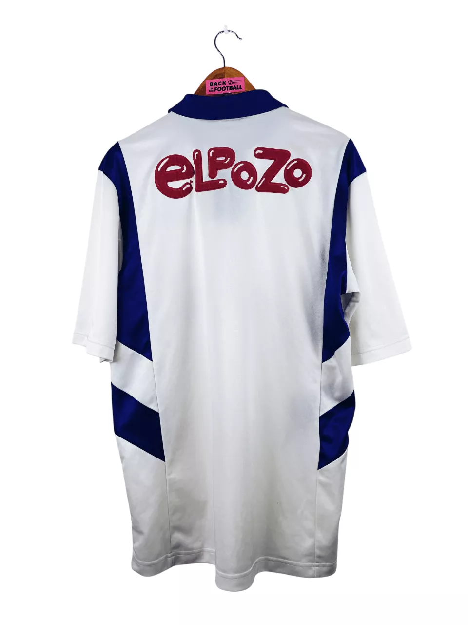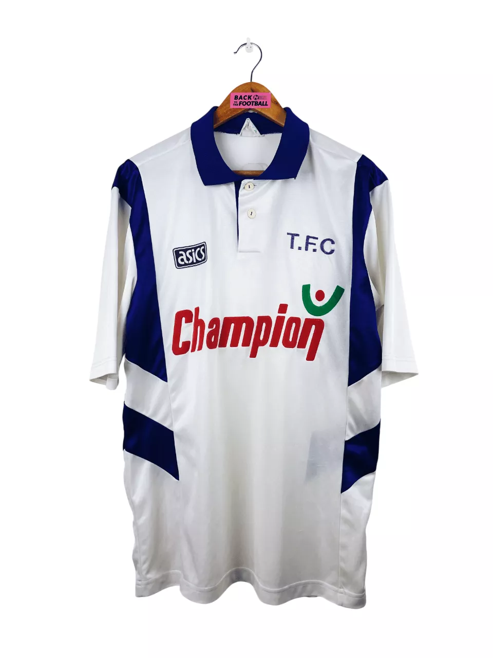 Taille : M mais taille large, plutôt un L Largeur : 55cm (aisselle à aisselle) Longueur : 76cm (base du col au bas) Si tu veux plus de détails, tu peux nous contacter par mail ou sur les réseaux 😉 Etat : 8.5/10, excellent état Le maillot : maillot vintage domicile du Toulouse FC 1994/1995. L’écusson est brodé, le logo Asics et le sponsor Champion sont en feutrine. Le sponsor El Pozo au dos est en feutrine également. Très beau maillot rétro du TFC ! Histoire : le Téfécé de Rolland Courbis loupe la montée en Division 1 pour 3…