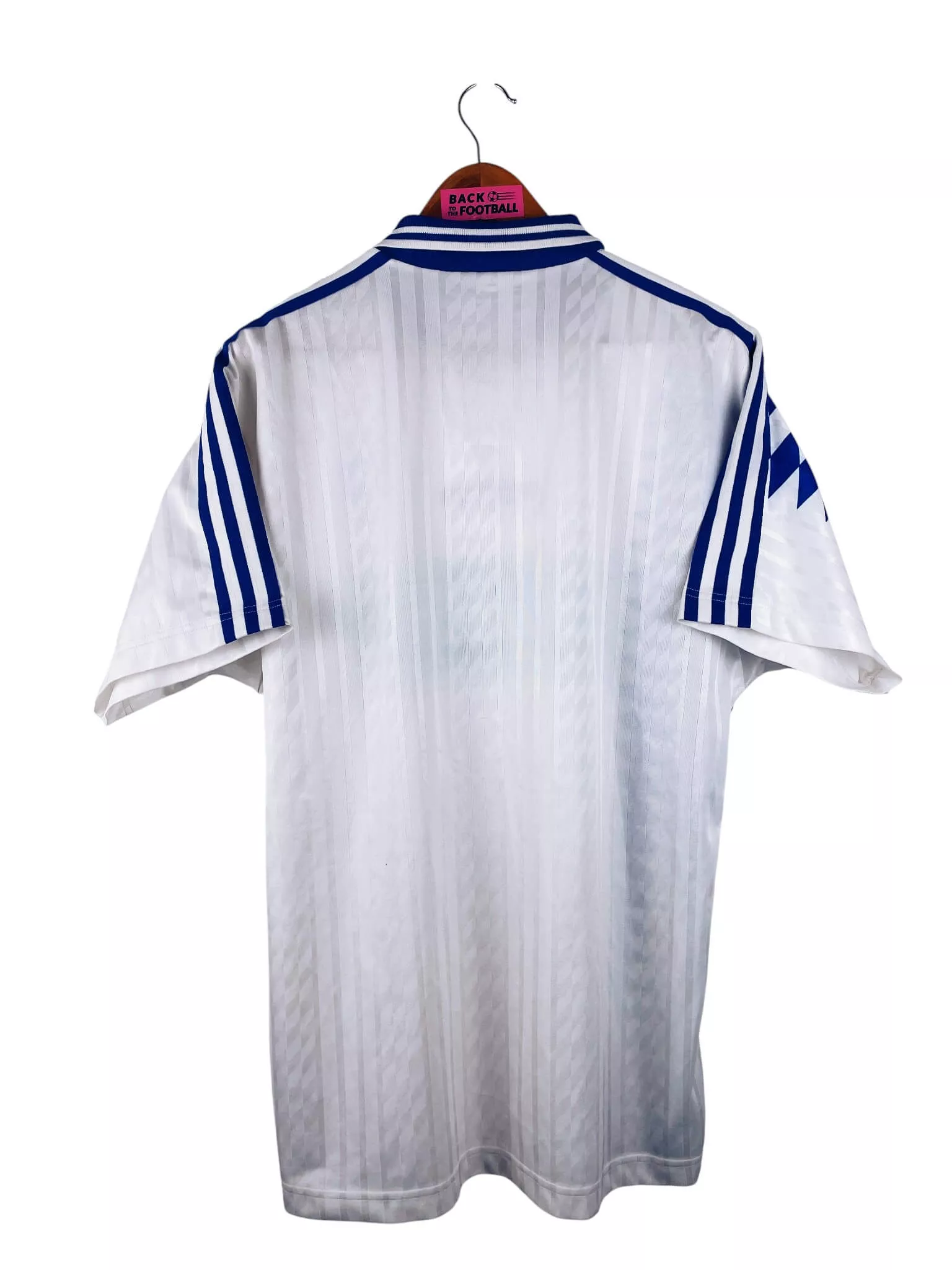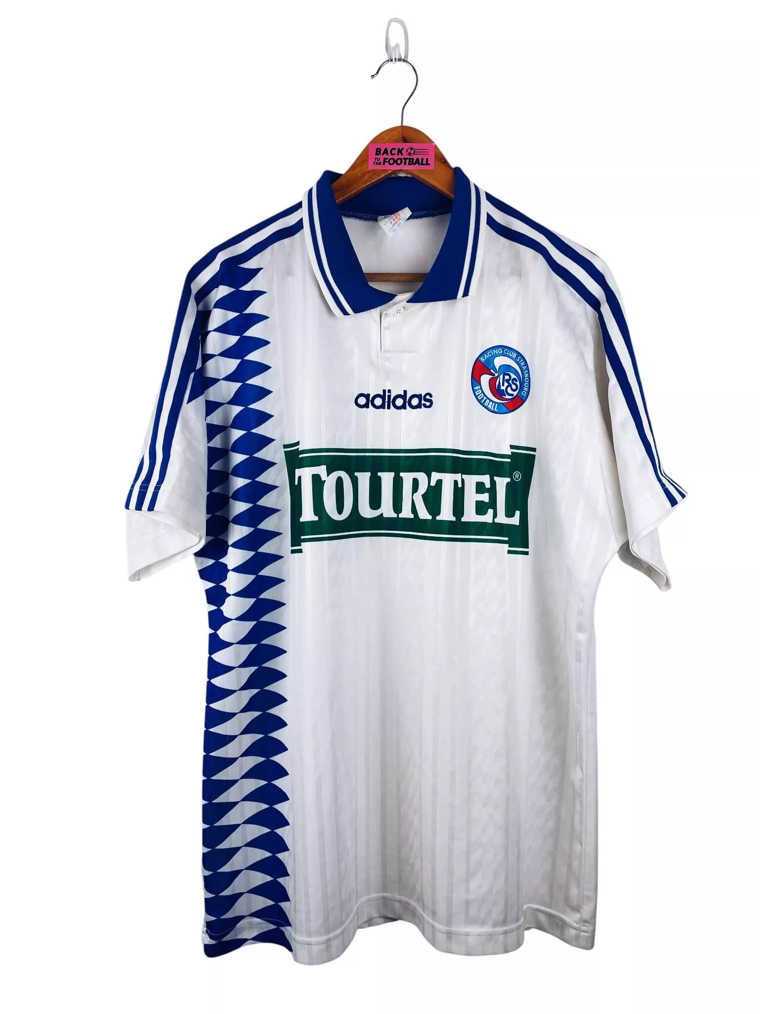 Taille : L Largeur : 56cm (aisselle à aisselle) Longueur : 75cm (base du col au bas) Si tu veux plus de détails, tu peux nous contacter par mail ou sur les réseaux 😉 Etat : 9/10, excellent état Le maillot : maillot vintage extérieur du RC Strasbourg 1994/1995. L’écusson et le sponsor Tourtel sont incrustés, le logo Adidas est brodé. Très beau maillot rétro de Strasbourg ! Histoire : les strasbourgeois terminent à la 10ème place de D1. Ils iront jusqu’en finale de Coupe de France mais seront éliminés par le PSG, 1-0. Quelques joueurs : Gravelaine, Rémi Garde,…