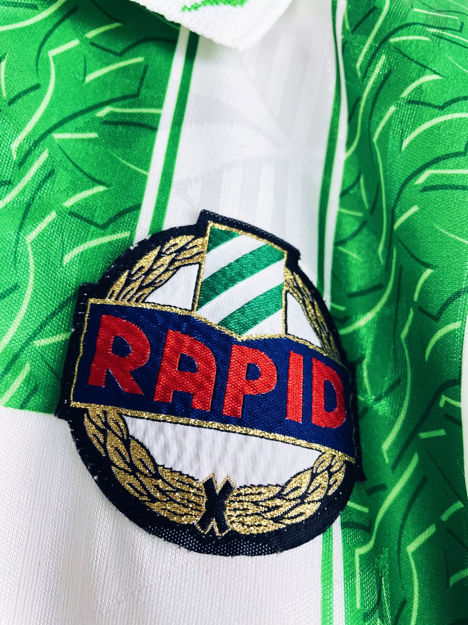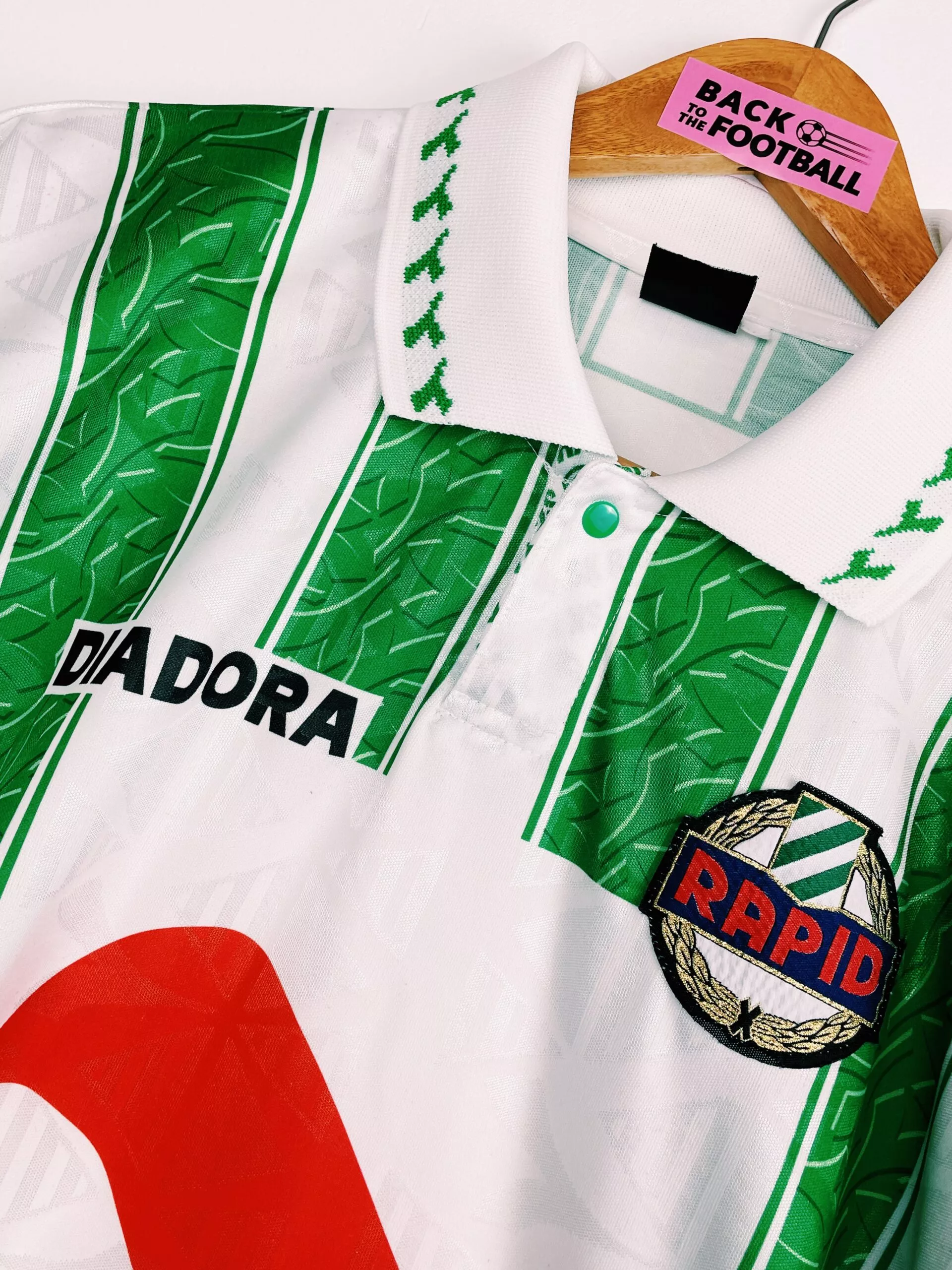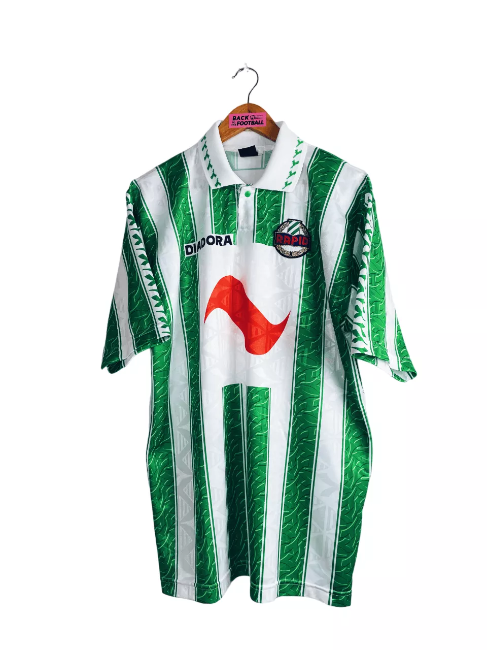 Taille : XL Etat : 8/10, très bon état. Le maillot : maillot vintage domicile du Rapid Vienne 1994/1995. L’écusson est brodé, le logo Diadora et le sponsor sont incrustés au tissu. Très beau maillot rétro du Rapid Vienne ! Histoire : le Rapid Vienne fait une jolie saison avec une Coupe d’Autriche et une 3ème place en Bundesliga derrière Salzburg et Sturm Graz. Marcus Pürk sera le meilleur buteur du club avec 17 buts.