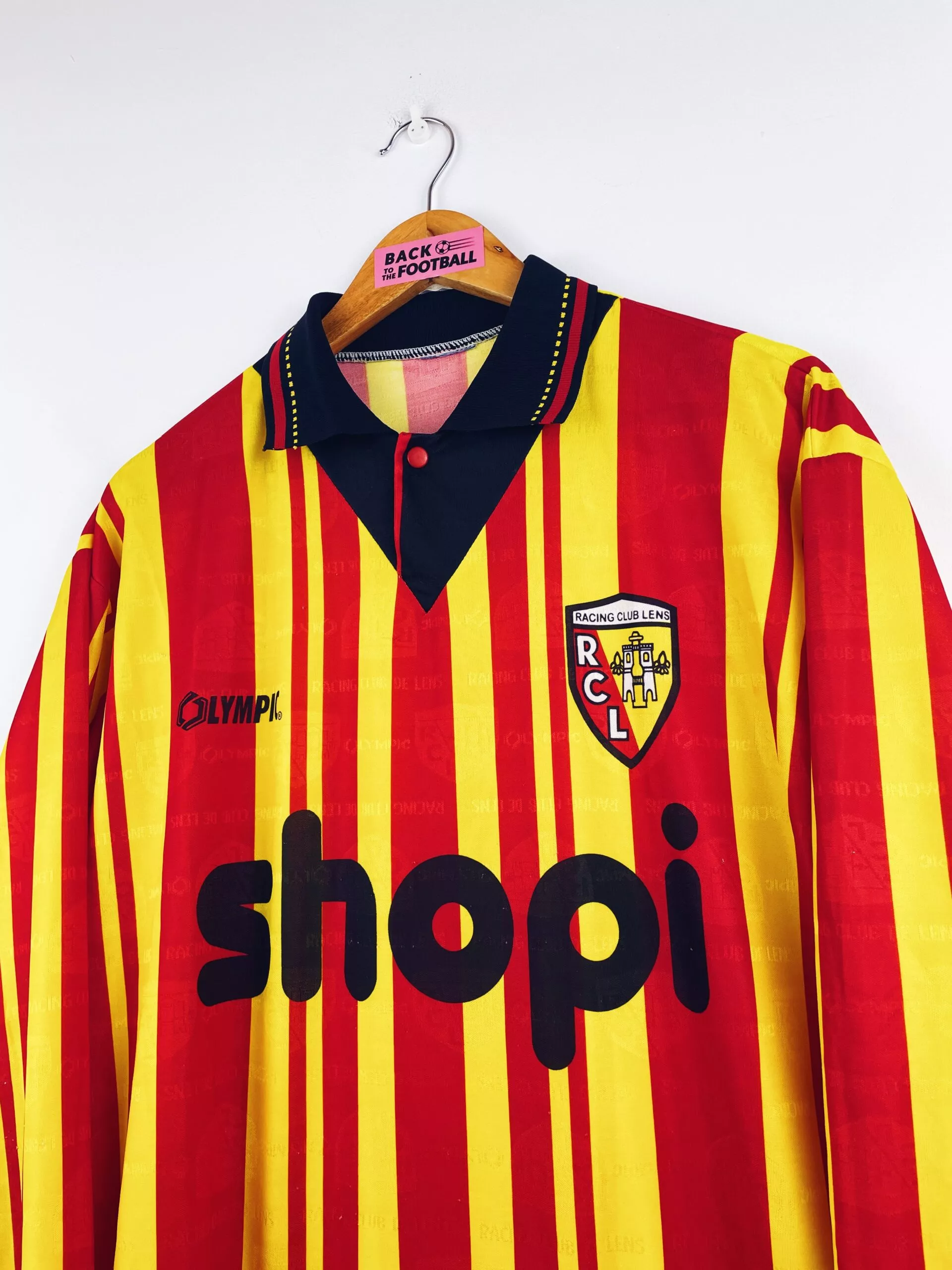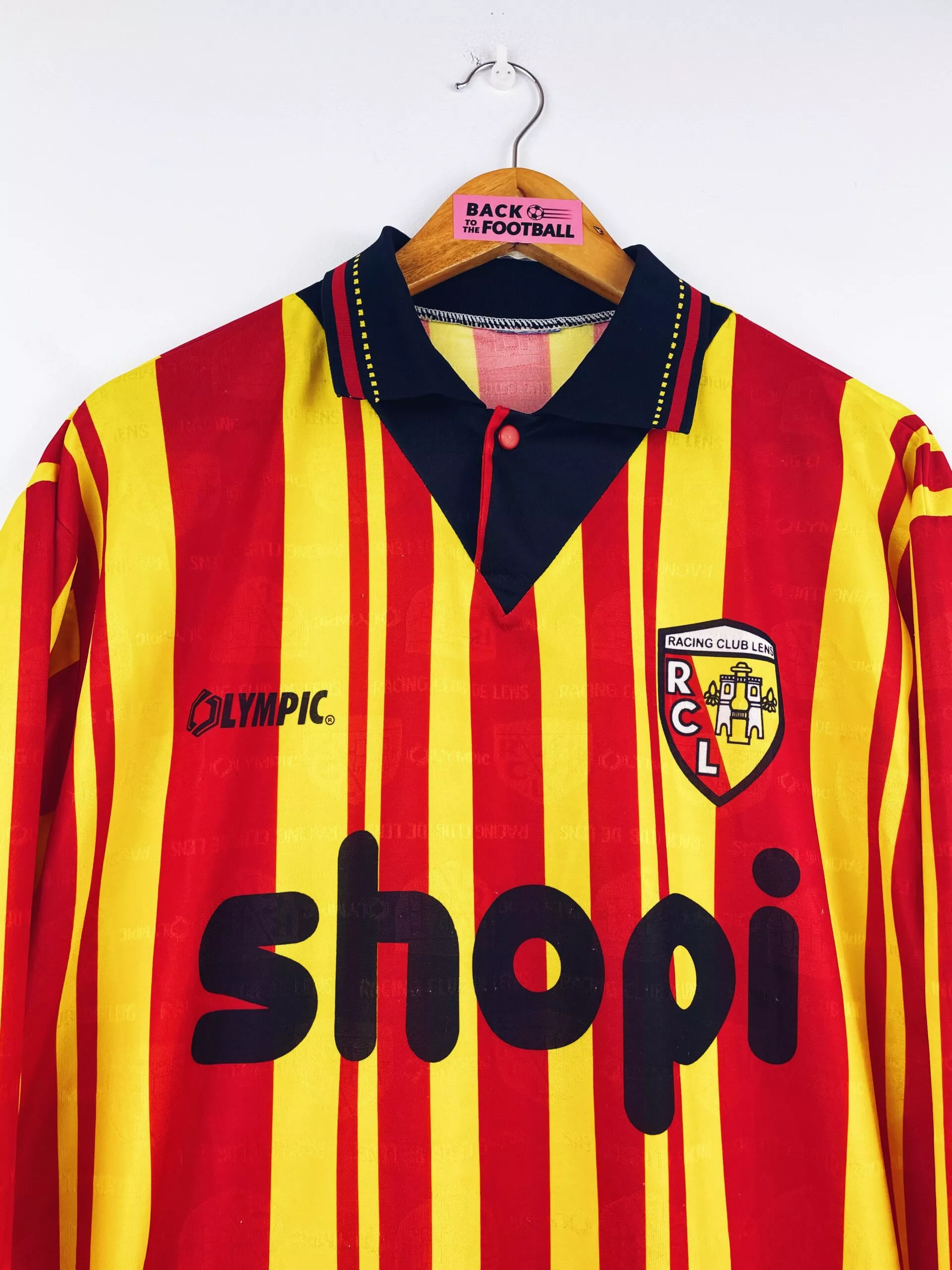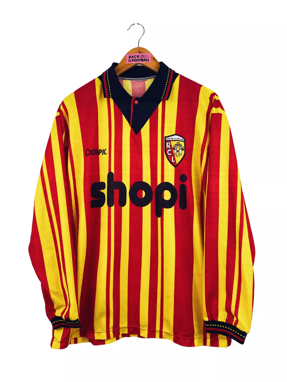 Taille : L Largeur : 56cm (aisselle à aisselle) Longueur : 70cm (haut de l’épaule au bas) Si tu veux plus de détails, tu peux nous contacter par mail ou sur les réseaux 😉 Etat : 8/10, excellent état, petites bouloches, étiquette dans le col coupée Le maillot : maillot vintage domicile du RC Lens 1994/1995 manches longues. L’écusson, le logo Olympic et le sponsor Shopi sont incrustés. Très beau maillot rétro de Lens ! Histoire : les Sang et Or terminent 5èmes de Division 1. Ils seront éliminés en 16èmes et 8èmes des coupes nationales. 17 buts pour Tiéhi.…