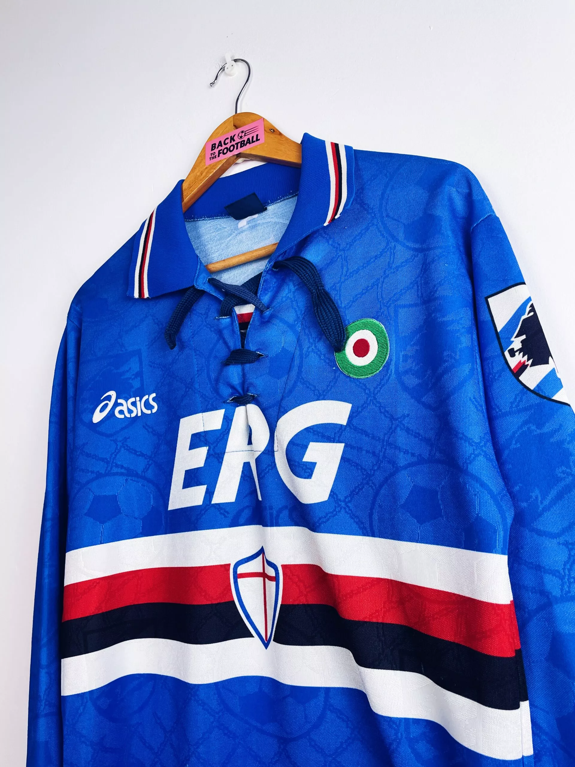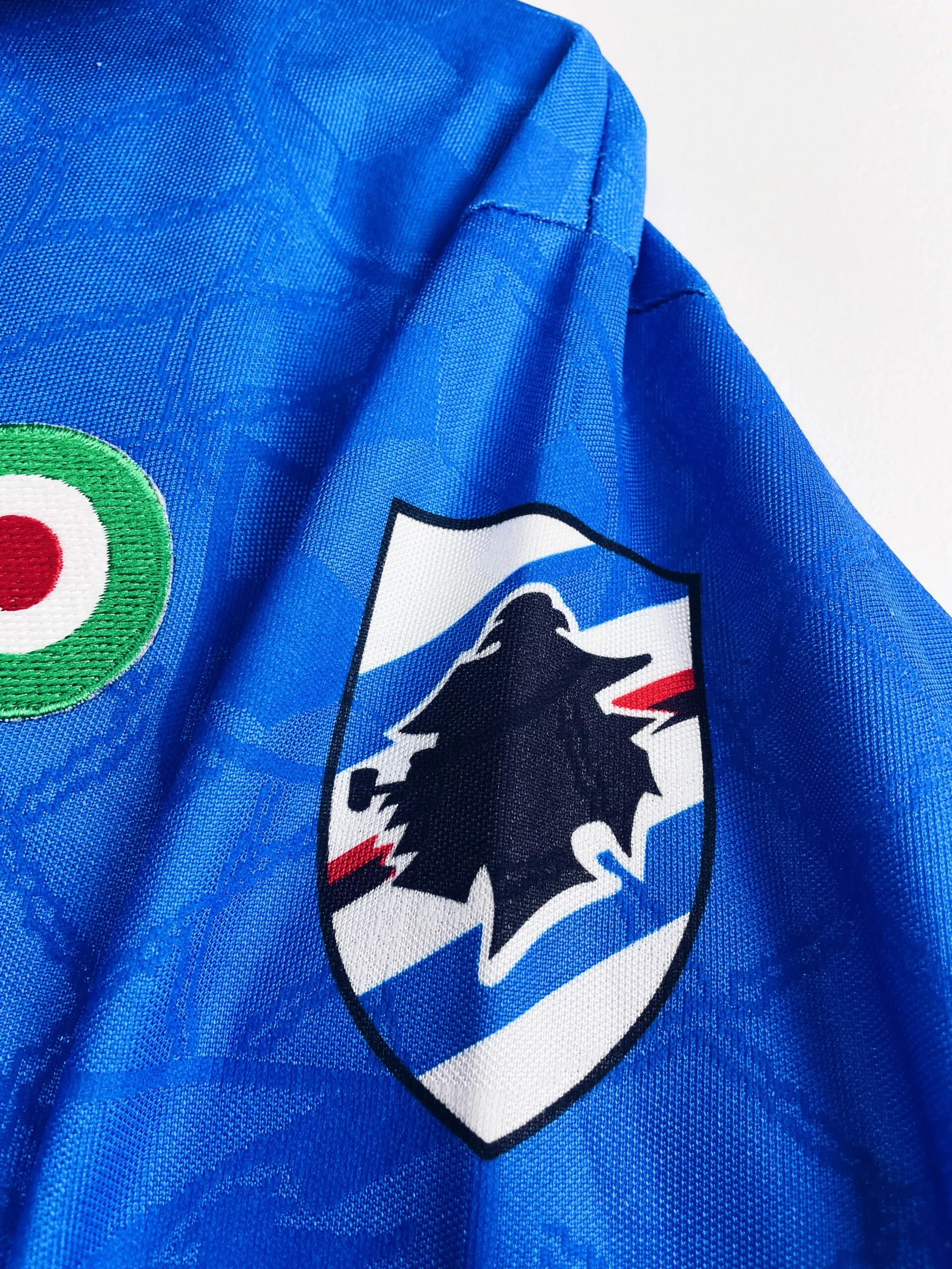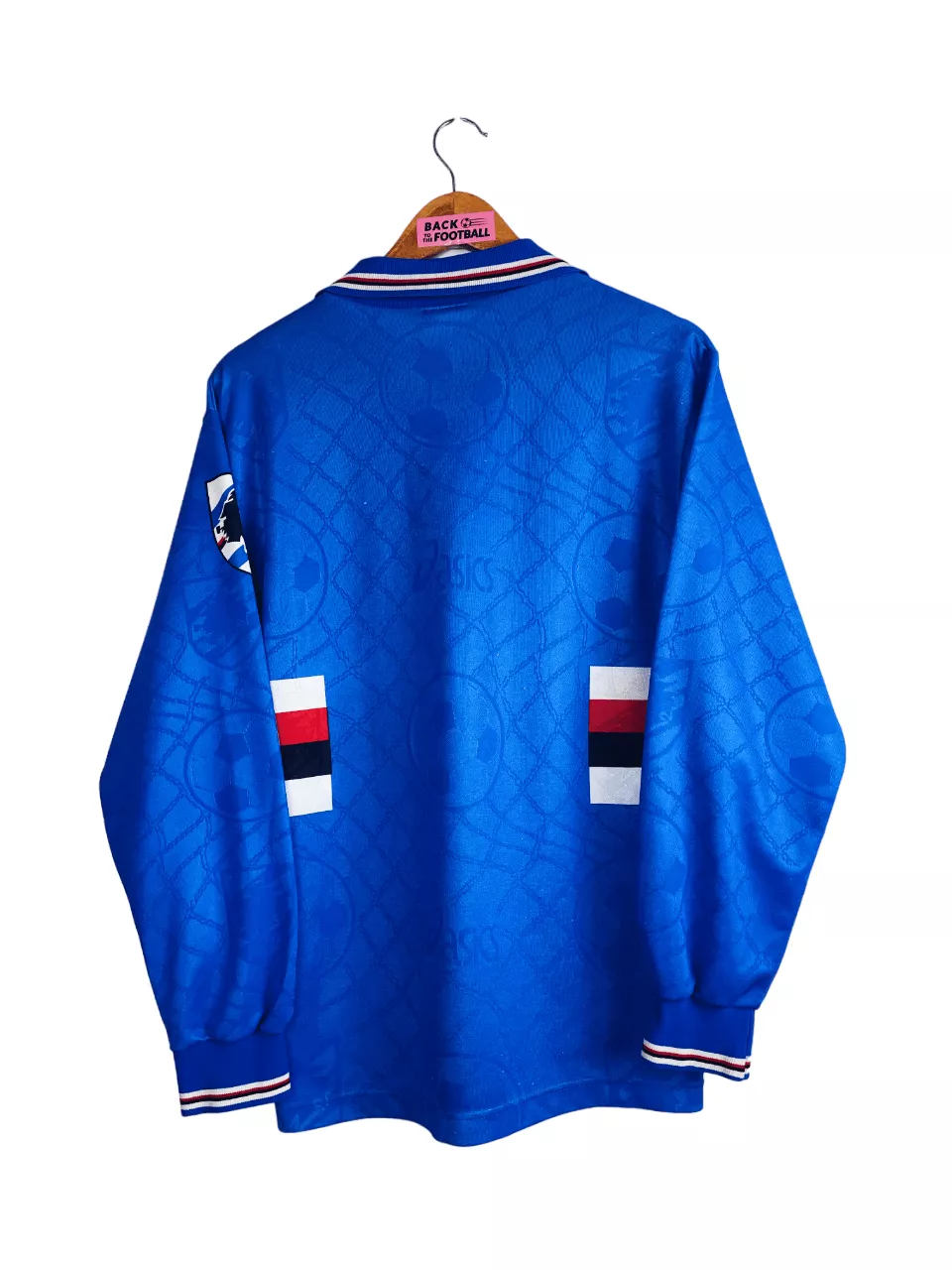 Taille : S/M Largeur : 47cm (aisselle à aisselle) Longueur : 69cm (base du col au bas) Etat : 8/10, très bon état, quelques bouloches à noter (voir photos) Le maillot : maillot vintage domicile de la Sampdoria 1994/1995. Le marin Baciccia (qui provient d’un dessin Disney, adopté dans les années 80), est incrusté au maillot, sur la manche gauche. Le patch italien de la Coupe d’Italie de la saison précédente est brodé, le logo Asics est en feutrine. Le sponsor ERG est incrusté. On peut voir le drapeau de la ville de Gênes au centre du maillot. Et en…