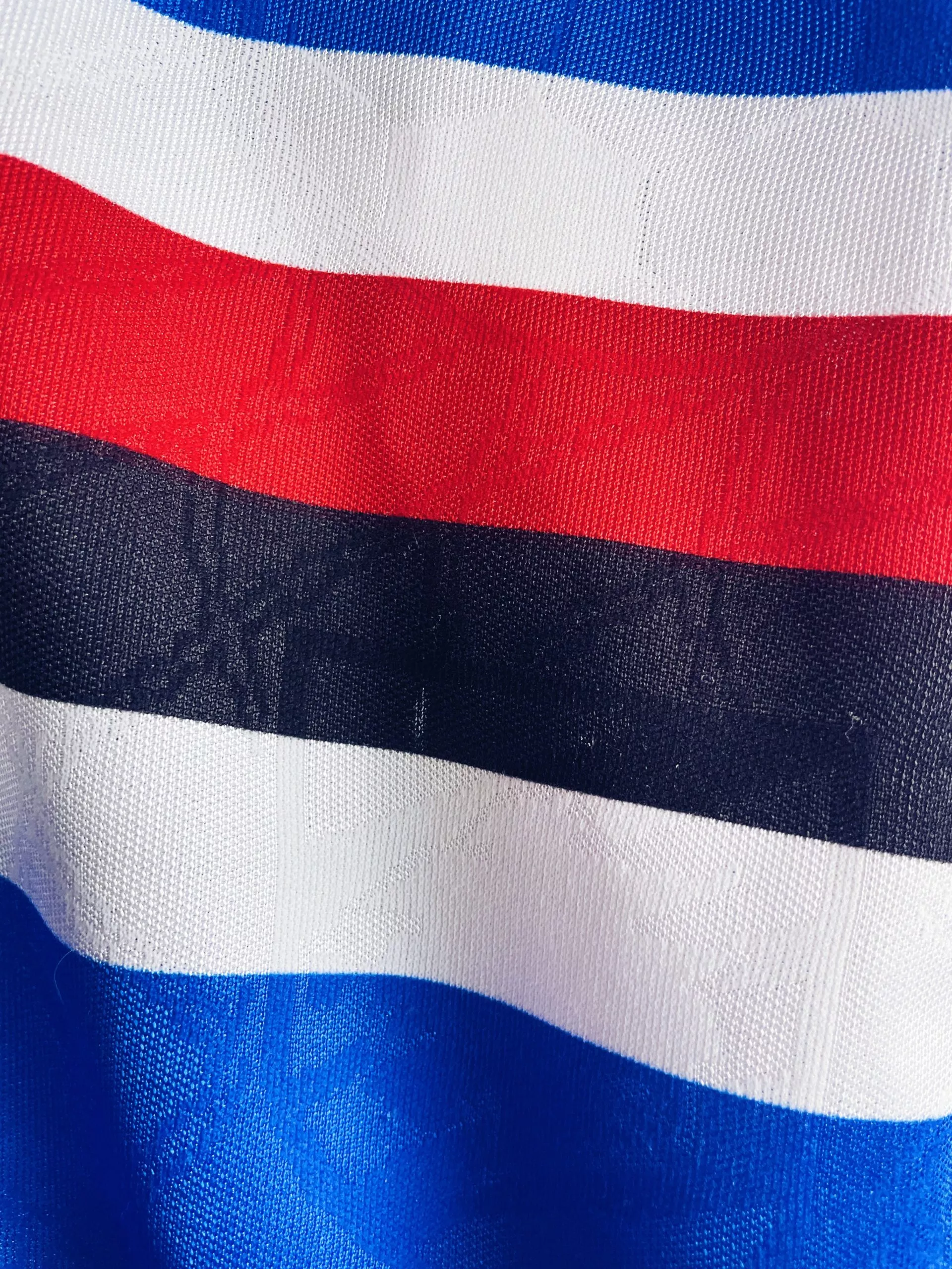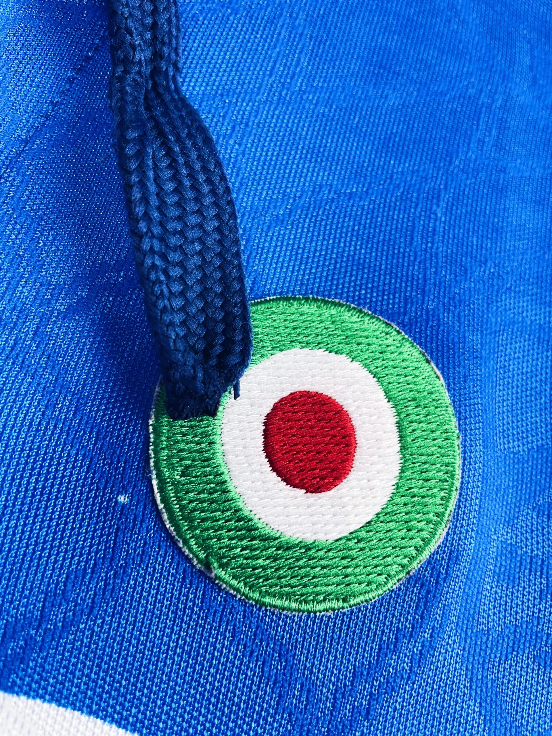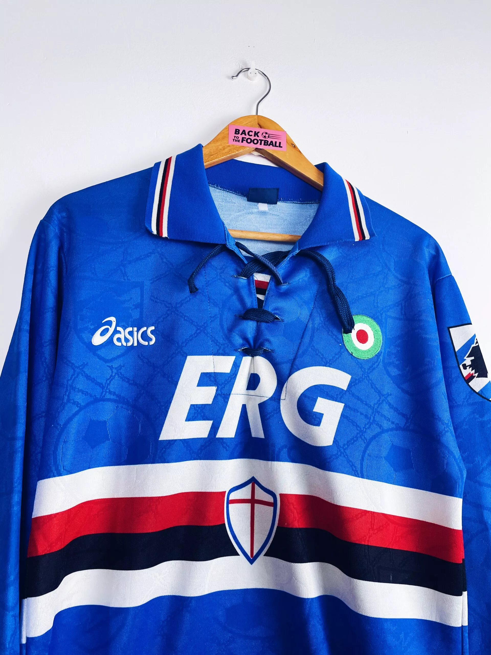 Taille : S/M Largeur : 47cm (aisselle à aisselle) Longueur : 69cm (base du col au bas) Etat : 8/10, très bon état, quelques bouloches à noter (voir photos) Le maillot : maillot vintage domicile de la Sampdoria 1994/1995. Le marin Baciccia (qui provient d’un dessin Disney, adopté dans les années 80), est incrusté au maillot, sur la manche gauche. Le patch italien de la Coupe d’Italie de la saison précédente est brodé, le logo Asics est en feutrine. Le sponsor ERG est incrusté. On peut voir le drapeau de la ville de Gênes au centre du maillot. Et en…