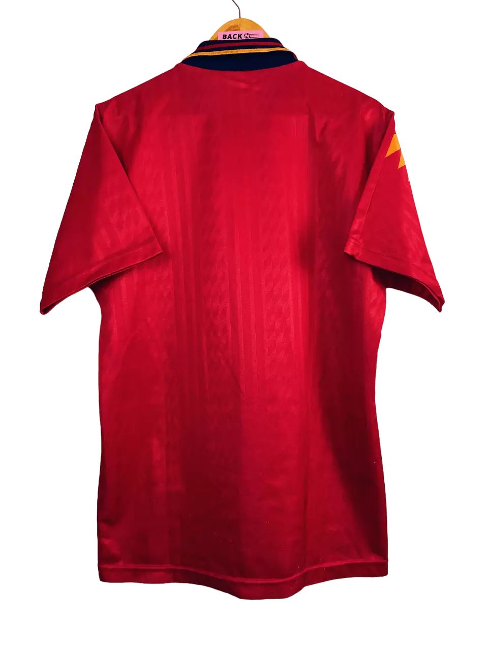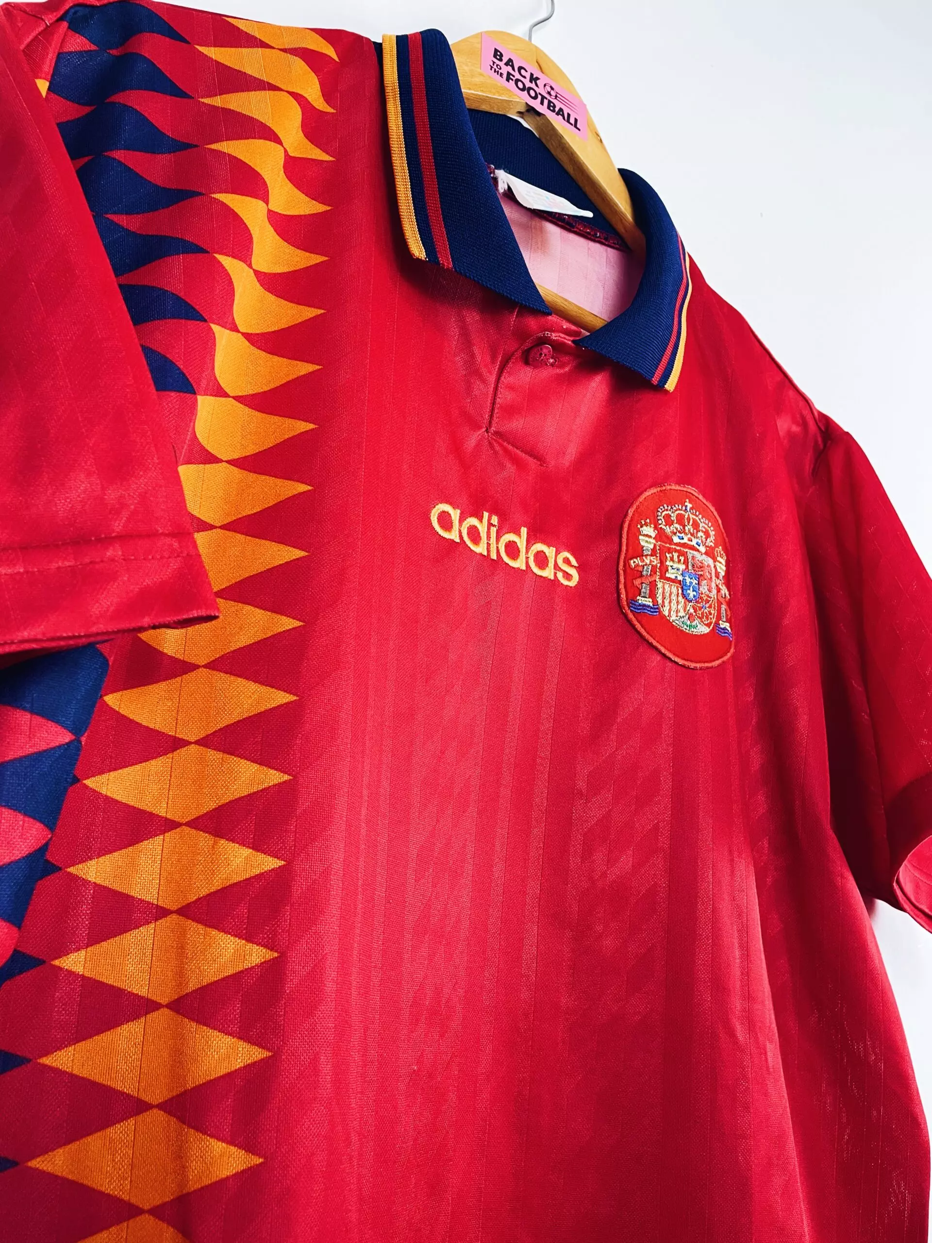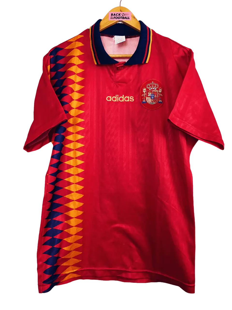 Taille : M Etat : 7/10, très bon état, à noter des bouloches et un accroc (voir photos) Le maillot : maillot vintage Adidas de l’Espagne 1994/1996. Le maillot reprend le design de nombreux maillots de foot Adidas de l’époque avec les losanges de couleur. L’écusson est brodé, comme le logo Adidas. Très beau maillot rétro de l’Espagne ! Histoire : la Roja finit 2ème de son groupe lors de la Coupe du Monde 1994, derrière l’Allemagne notamment. En huitièmes, les espagnols arrivent facilement à bout des Suisses, 3 à 0. En quart, ils s’inclinent 2-1 contre les italiens, futurs…