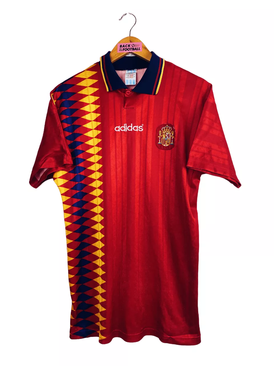 Taille : M Si tu veux plus d’infos, tu peux nous contacter par mail ou sur les réseaux 😉 Etat : 7/10, très bon état général mais des bouloches (voir photos) Le maillot : maillot vintage Adidas de l’Espagne 1994/1996. Le maillot reprend le design de nombreux maillots de foot Adidas de l’époque avec les losanges de couleur. L’écusson est brodé, comme le logo Adidas. Très beau maillot rétro de l’Espagne ! Histoire : la Roja finit 2ème de son groupe lors de la Coupe du Monde 1994, derrière l’Allemagne notamment. En huitièmes, les espagnols arrivent facilement à bout des…