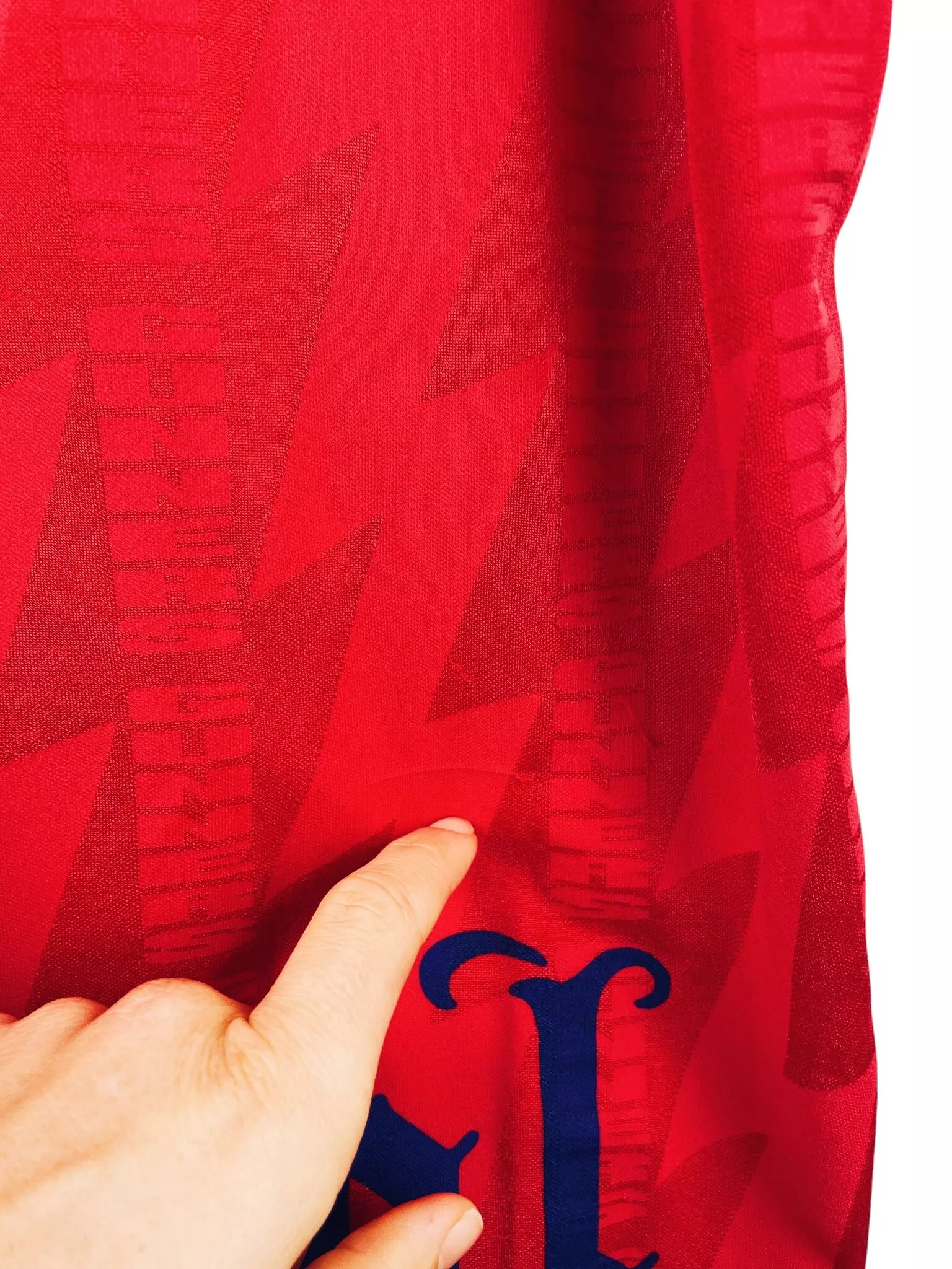 Taille : XL Largeur : 60cm (aisselle à aisselle) Longueur : 77cm (base du col au bas) Si tu veux plus de détails, tu peux nous contacter par mail ou sur les réseaux 😉 Etat : 9/10, excellent état, petit accroc en bas du dos (voir photo) Le maillot : maillot vintage domicile d’Arsenal 1994/1996 stock pro (player issue) : pas de patch Nike, numéro #12 officiel en feutrine. L’écusson et le logo Nike sont brodés, le sponsor JVC est en feutrine. On peut voir l’inscription Gunners incrustée sur tout le maillot. Très beau maillot rétro d’Arsenal ! Histoire :…