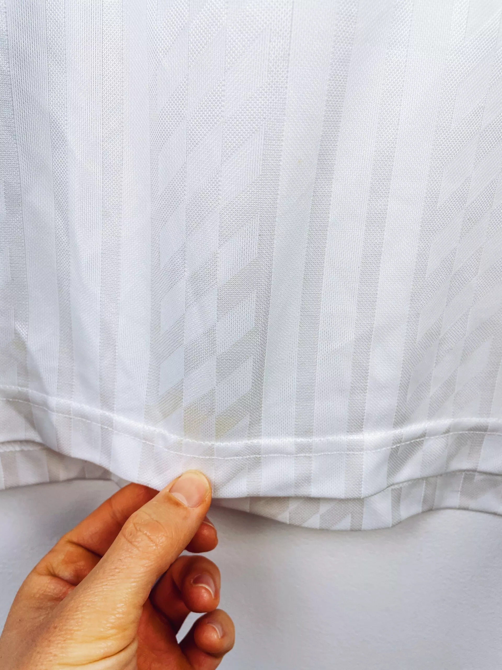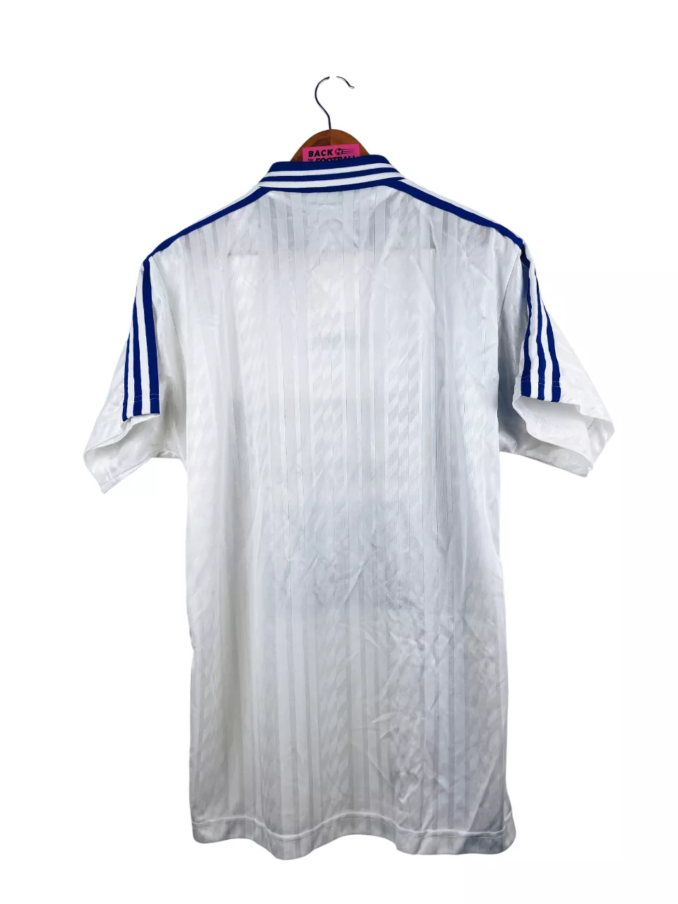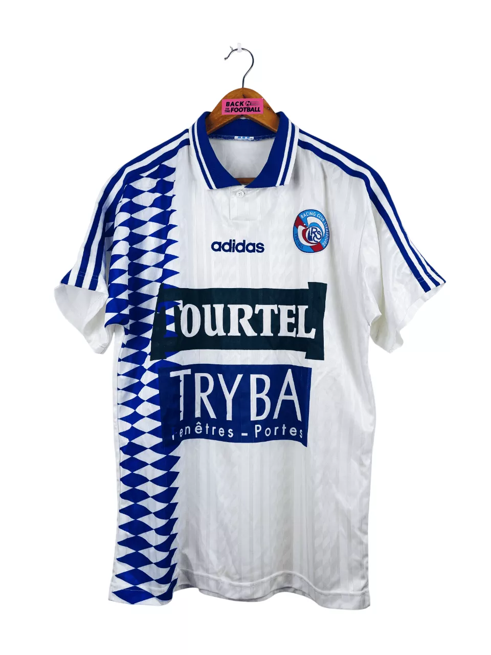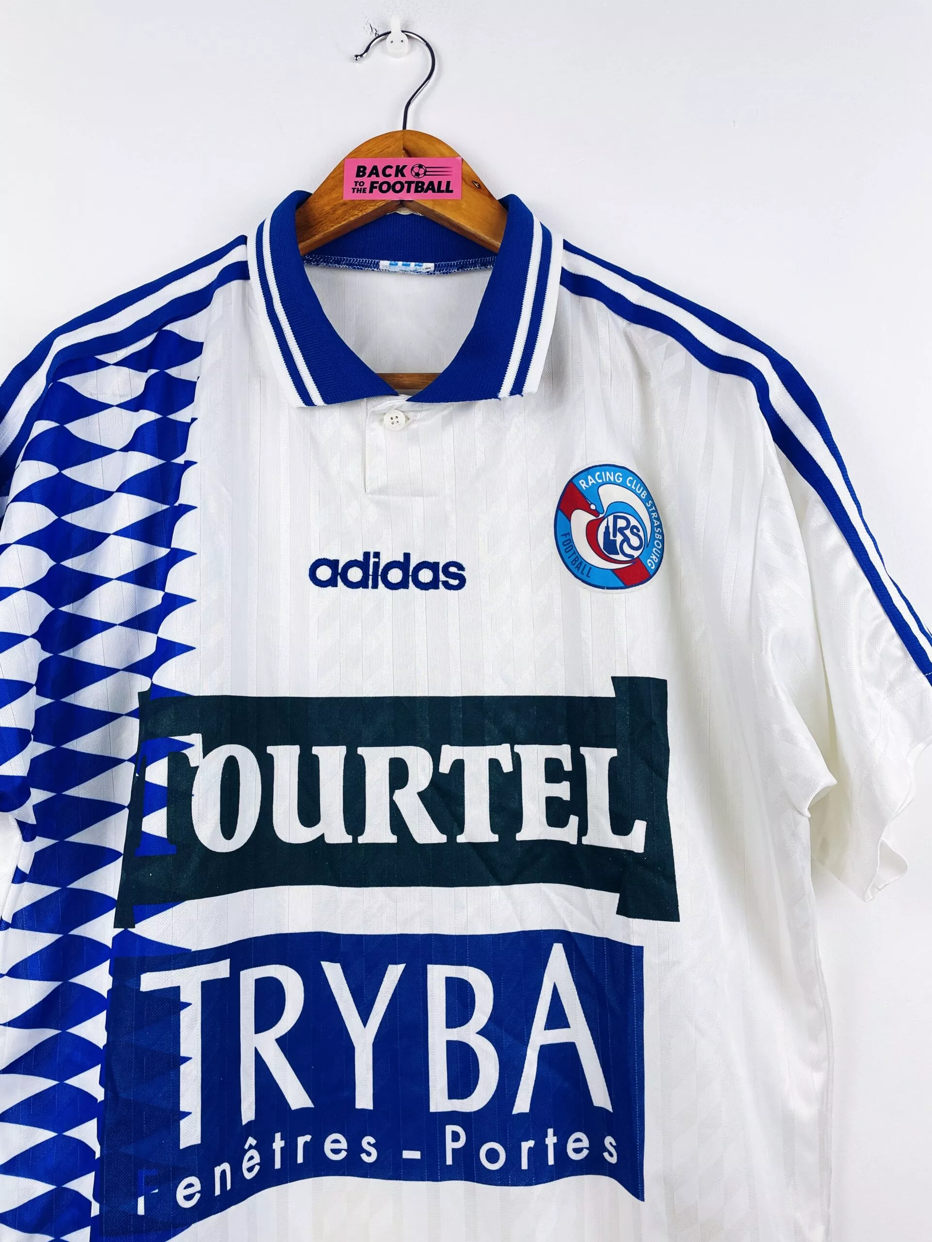 Taille : L Largeur : 54cm (aisselle à aisselle) Longueur : 73cm (base du col au bas) Si tu veux plus de détails, tu peux nous contacter par mail ou sur les réseaux 😉 Etat : 8/10, très bon état général, micro trace jaune en bas du maillot, quasi pas visible (voir photo) Le maillot : maillot vintage extérieur RC Strasbourg 1994/1996. L’écusson et le logo Adidas sont brodés, les sponsors Tourtel et Tryba sont incrustés. Très beau maillot rétro de Strasbourg ! Histoire : la 1ère saison, les strasbourgeois terminent à la 10ème place de D1. Ils iront jusqu’en…