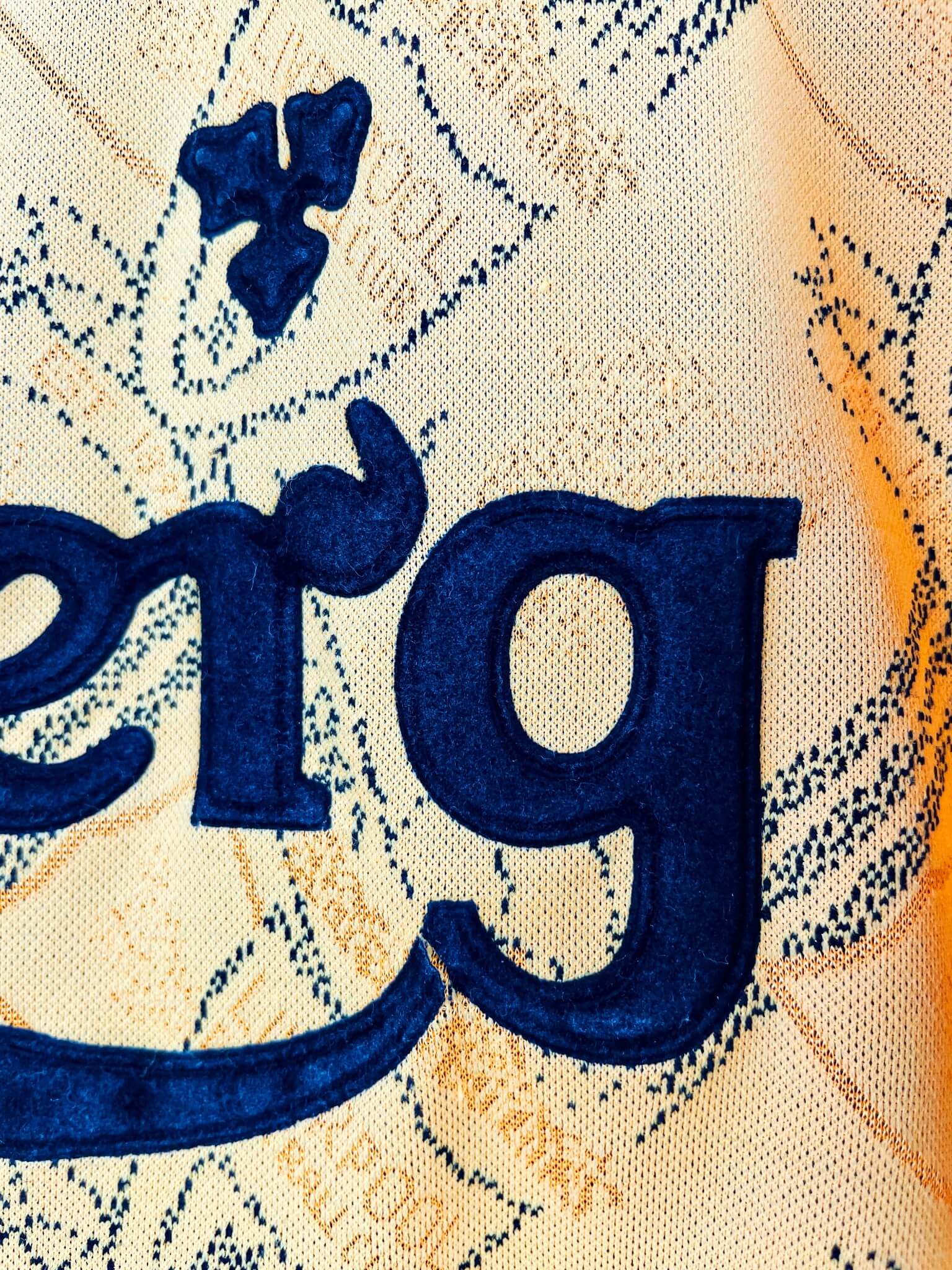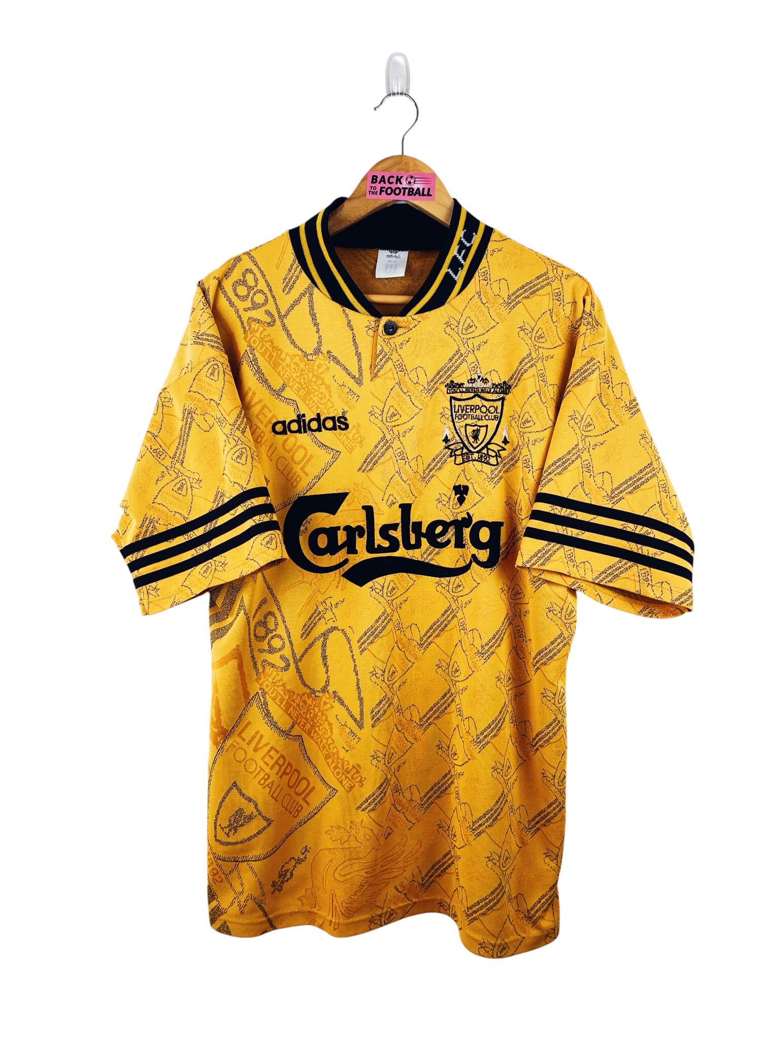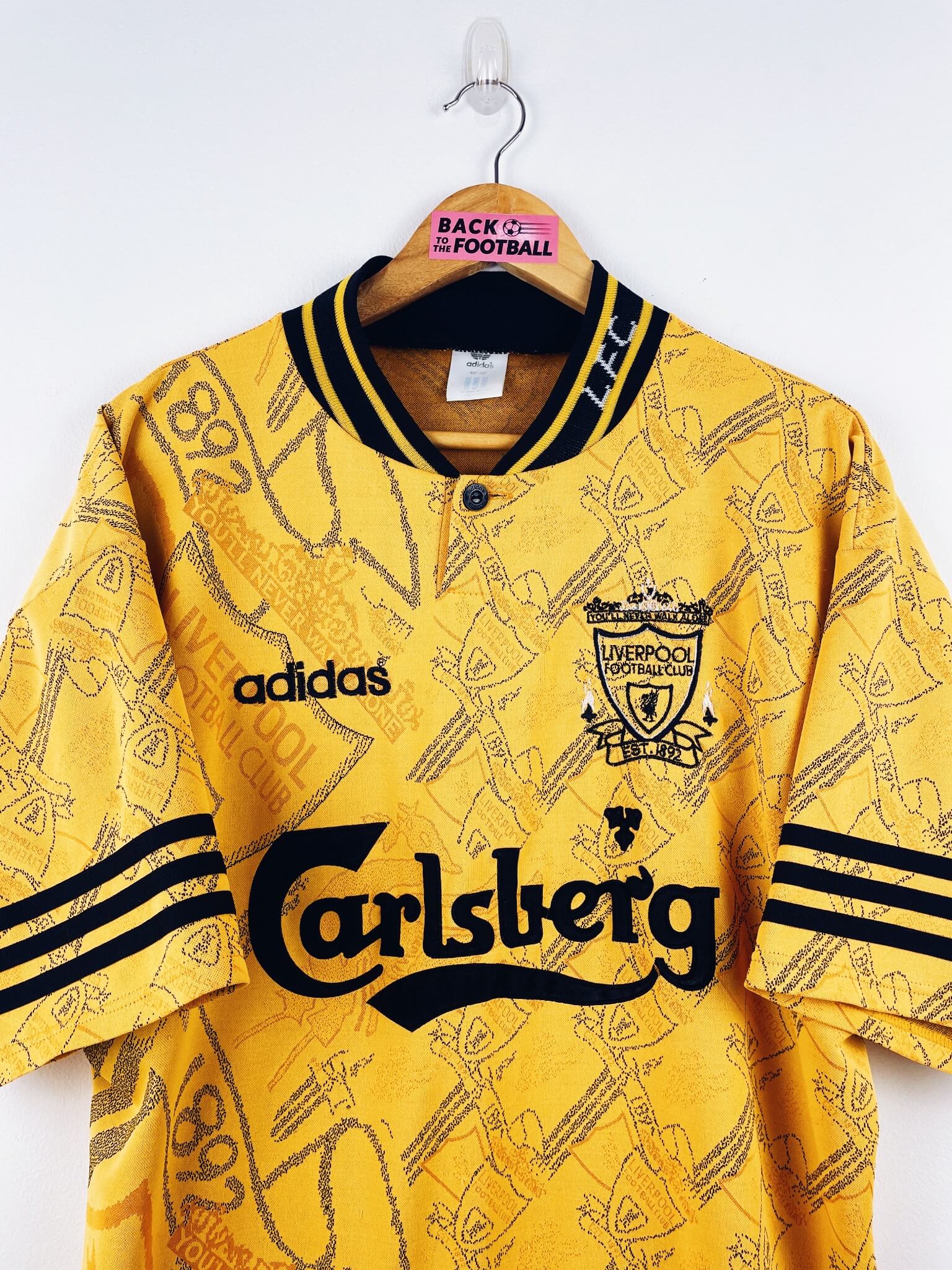 La taille : L Largeur : 53cm (aisselle à aisselle) Longueur : 74cm (base du col au bas) Si tu veux plus d’infos, tu peux nous contacter par mail ou sur les réseaux 😉 Etat : 8/10, excellent état hormis la feutrine du sponsor qui est craquelée à 2 endroits. C’est léger (voir photos) Le maillot : maillot vintage third de Liverpool 1994/1996. L’écusson et le logo Adidas sont brodés, le sponsor Carlsberg est en feutrine. On peut voir en tramé sur tout le maillot l’écusson du club. Très beau maillot rétro de Liverpool ! Histoire : sur la première…