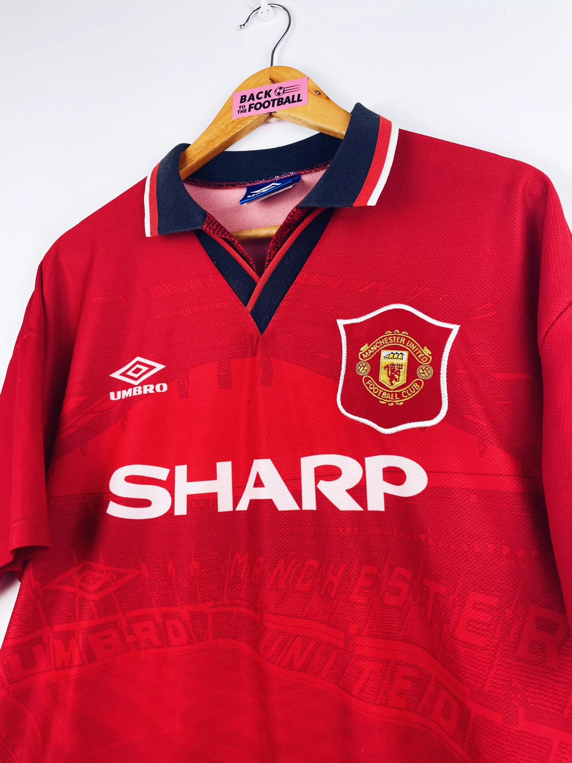 Taille : M Si tu veux plus de détails, tu peux nous contacter par mail ou sur les réseaux 😉 Etat : 8/10, très bon état, petit accroc sur le devant (voir photo) Le maillot : maillot vintage domicile de Manchester United 1994/1996 floqué Cantona #7. L’écusson est brodé, le logo Umbro et le sponsor Sharp sont incrustés. Cantona est en feutrine. On peut voir le stade Old Trafford imprimé sur le maillot. Très beau maillot rétro de Manchester United ! Histoire : la première saison, amenés par Alex Ferguson, les Red Devils terminent à la deuxième place en Premier…
