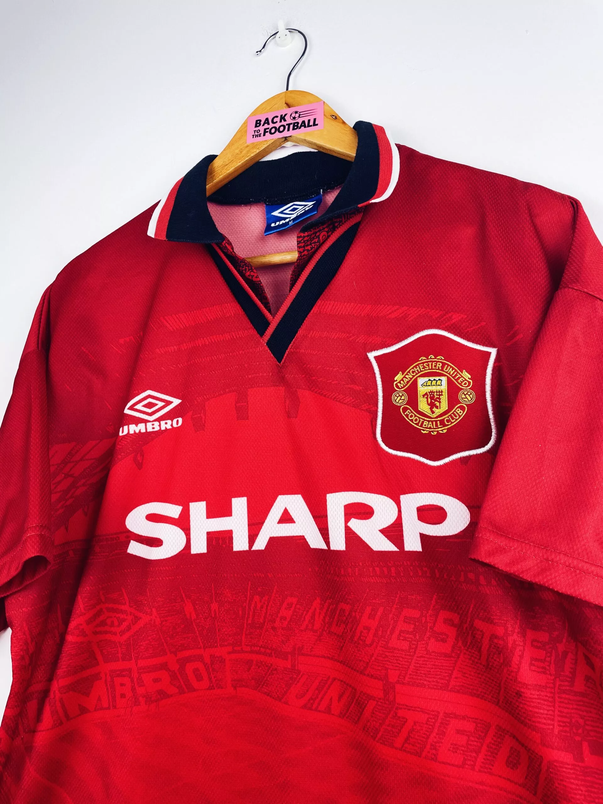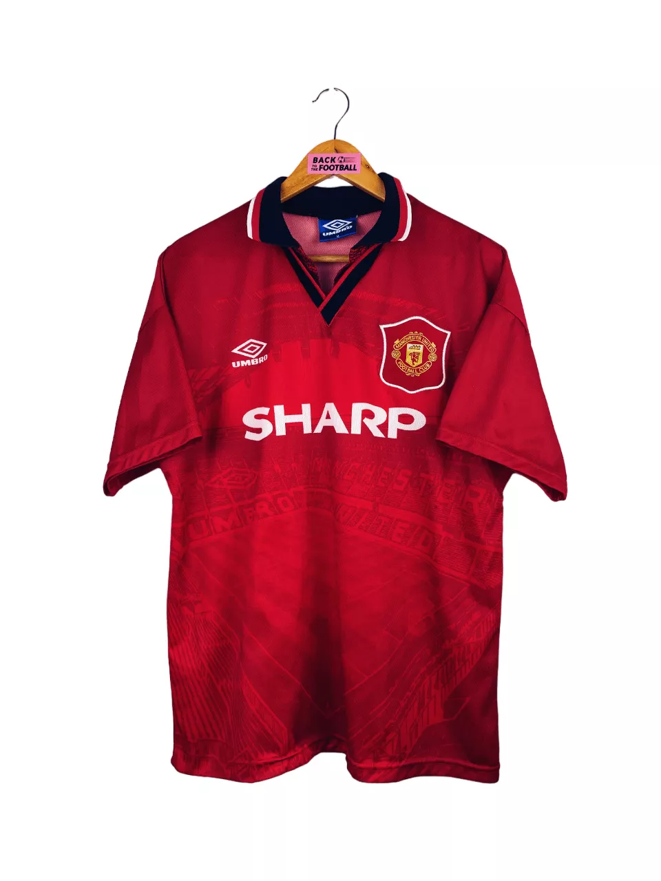 Taille : M Si tu veux plus de détails, tu peux nous contacter par mail ou sur les réseaux 😉 Etat : 8/10, excellent état, le flocage au dos a perdu un peu d’épaisseur Le maillot : maillot vintage domicile de Manchester United 1994/1996 floqué Cantona #7. L’écusson est brodé, le logo Umbro et le sponsor Sharp sont incrustés. Cantona est en feutrine. On peut voir le stade Old Trafford imprimé sur le maillot. Très beau maillot rétro de Manchester United ! Histoire : la première saison, amenés par Alex Ferguson, les Red Devils terminent à la deuxième place en…