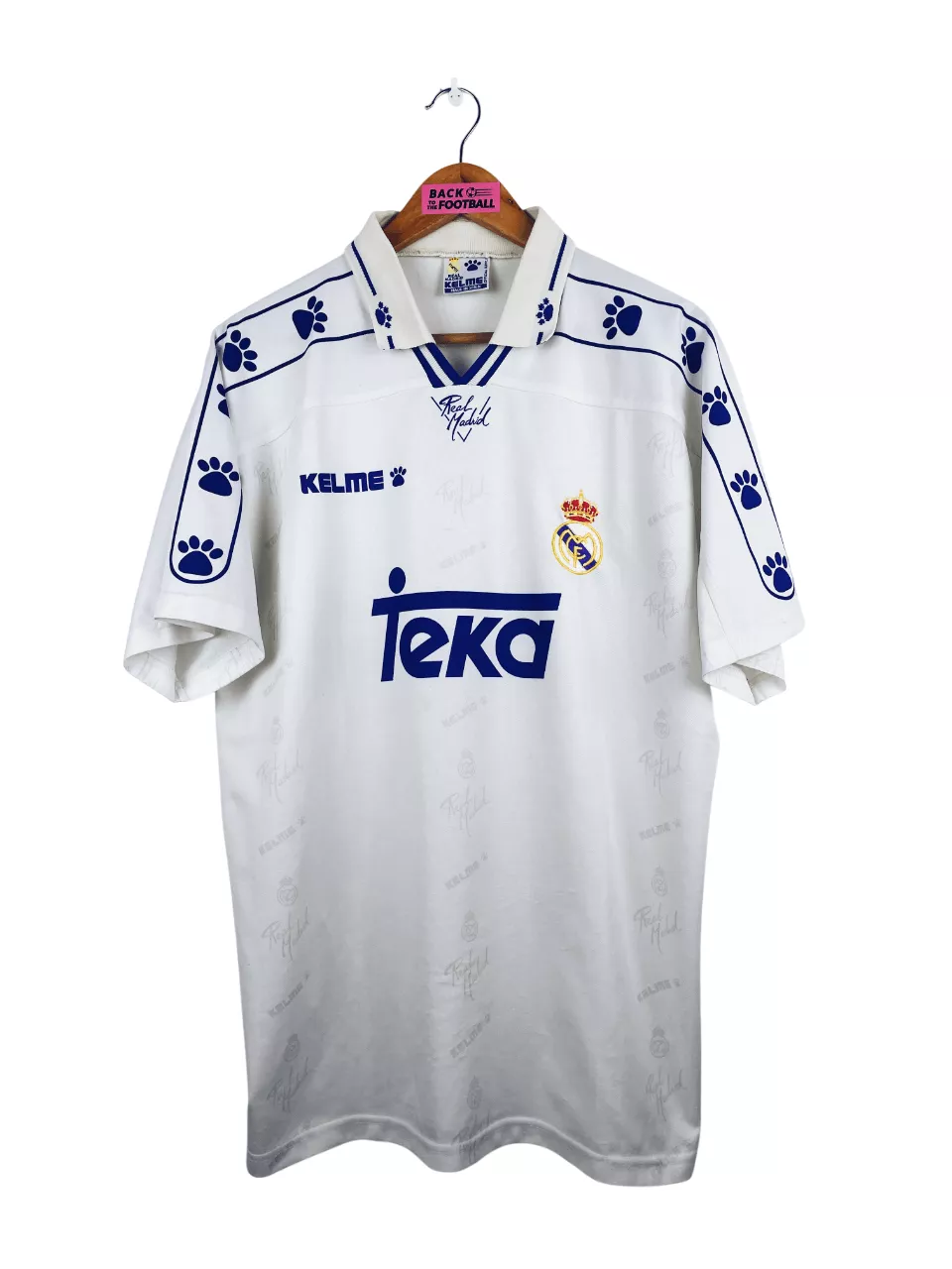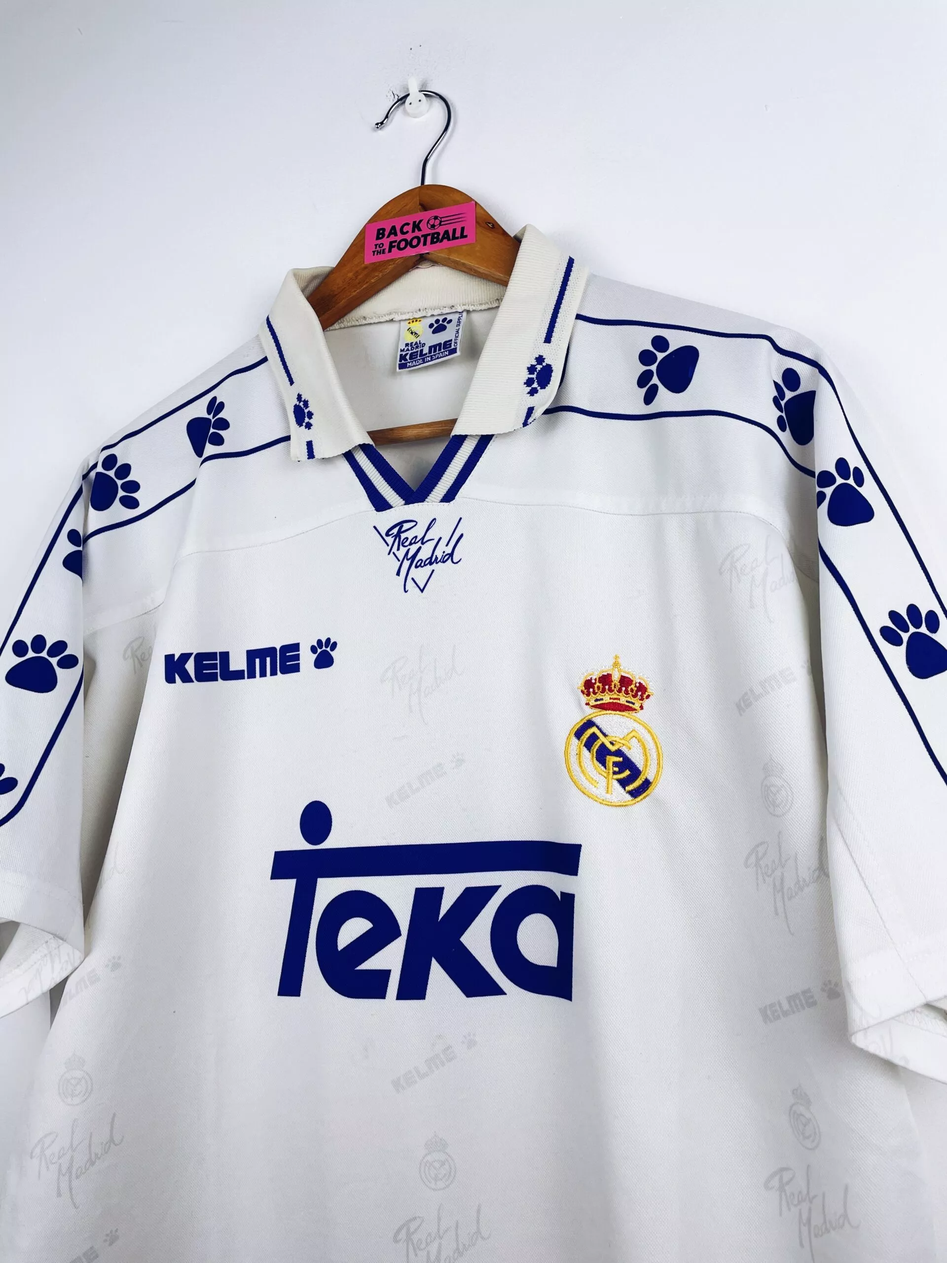 Taille : L Largeur : 57cm (aisselle à aisselle) Longueur : 74cm (base du col au bas du maillot) Si tu veux plus de détails, tu peux nous contacter par mail ou sur les réseaux 😉 Etat : 8/10, très bon état, quelques bouloches Le maillot : maillot vintage domicile du Real Madrid 1994/1996. L’écusson est brodé, le logo Kelme et le sponsor Teka sont incrustés. Le logo Kelme et l’écusson sont présents en tramé sur tout le maillot. Très beau maillot rétro du Real Madrid ! Histoire : le Real gagnera le championnat la première saison grâce notamment au…