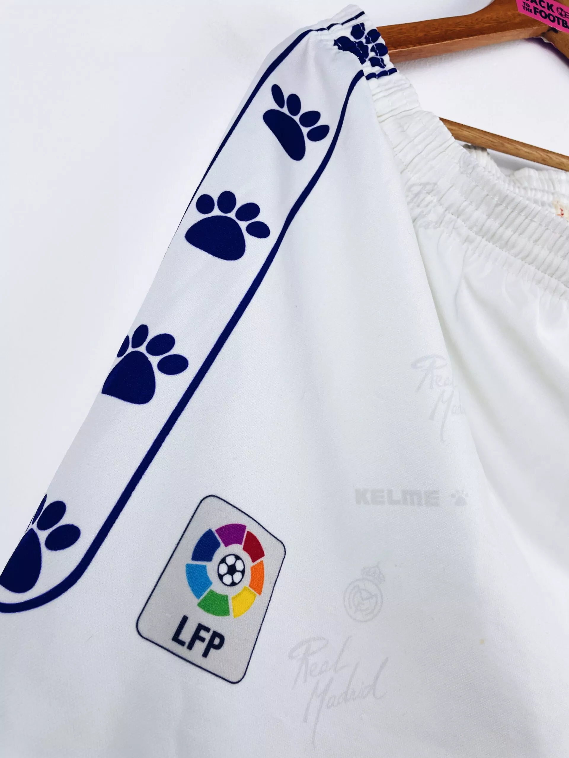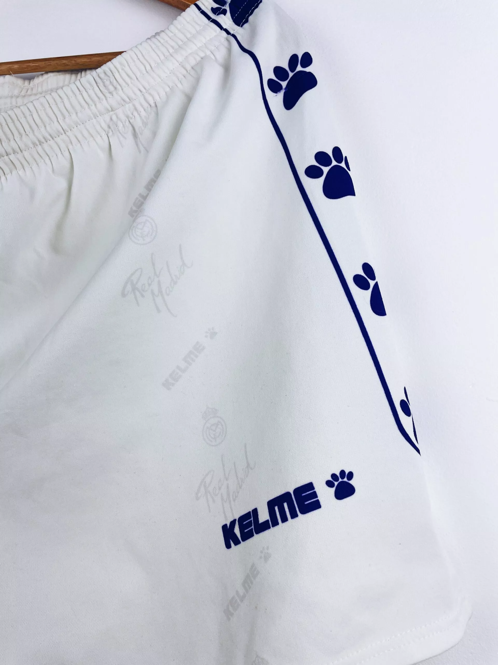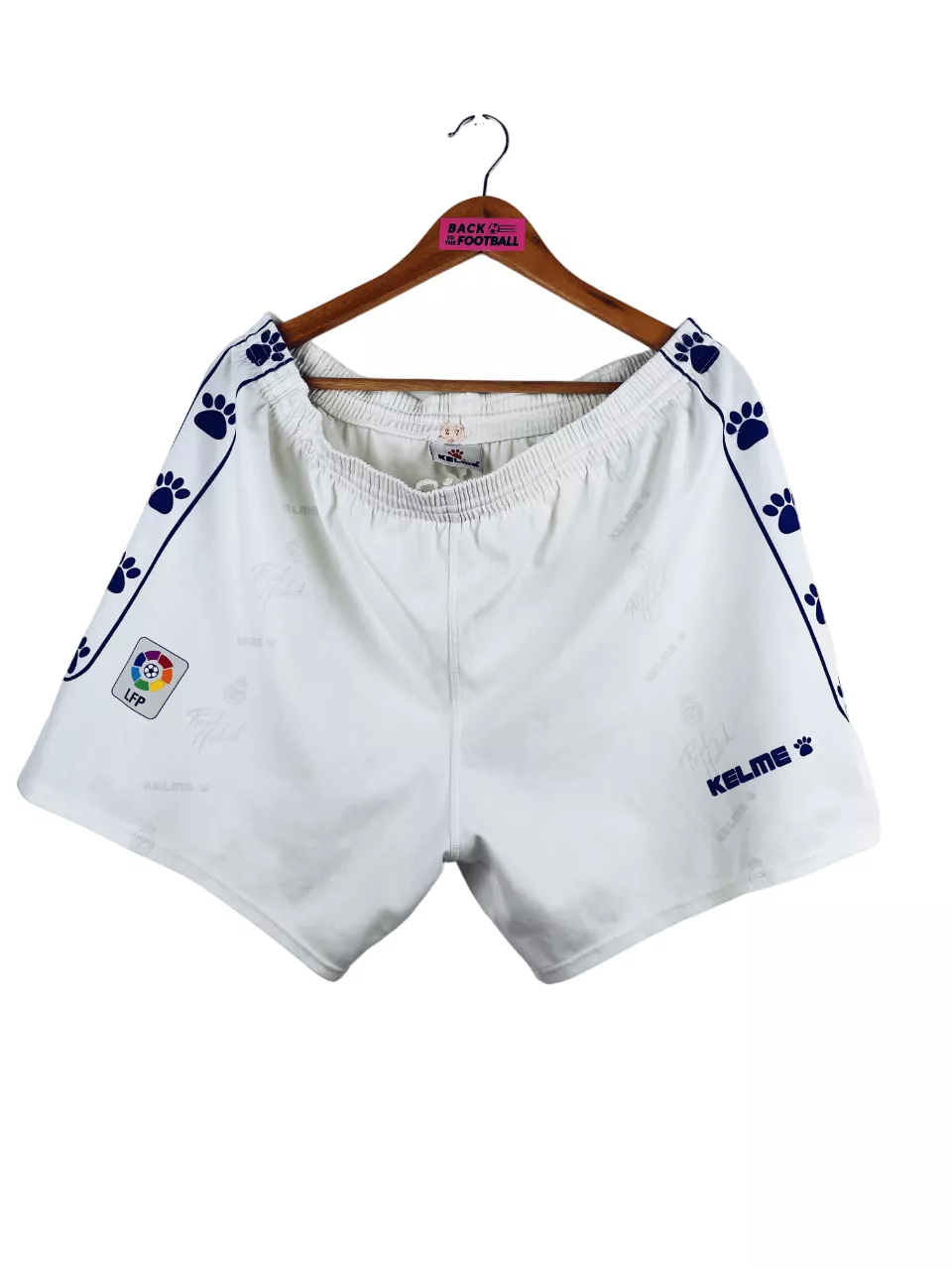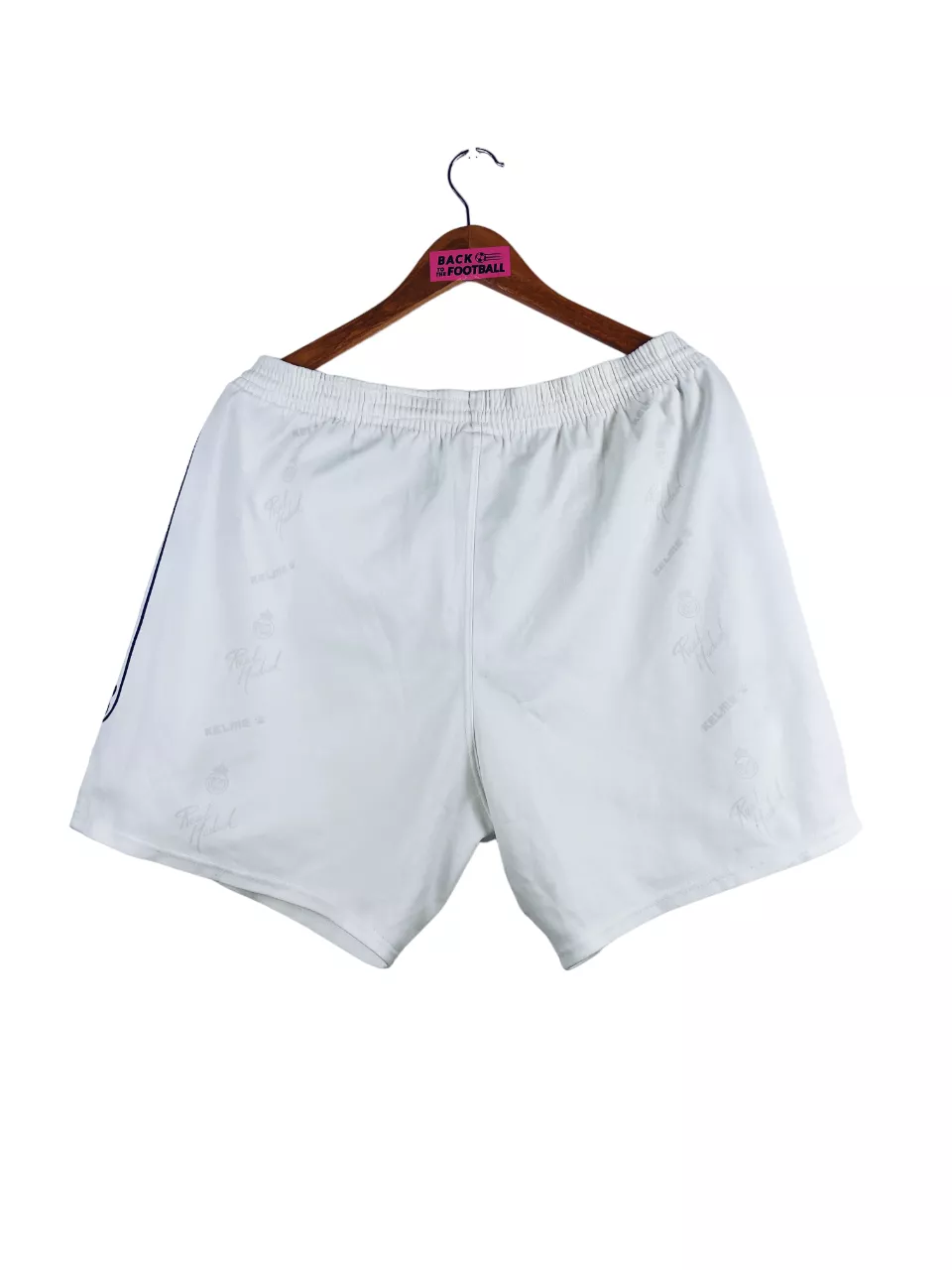 Taille : XL (L mais taille large) Si tu veux plus de détails, tu peux nous contacter par mail ou sur les réseaux 😉 Etat : 7.5/10, très bon état hormis 2 petites traces, quelques bouloches (voir photos) Le short : short vintage domicile du Real Madrid 1994/1996. Le patch LFP et le logo Kelme sont incrustés. Très beau short rétro du Real Madrid ! Histoire : le Real gagnera le championnat la première saison grâce notamment au chilien Zamorano qui marquera 28 buts en Liga et finira Pichichi. Quelques noms bien connus : Míchel, Luis Henrique, Raul, Guti…