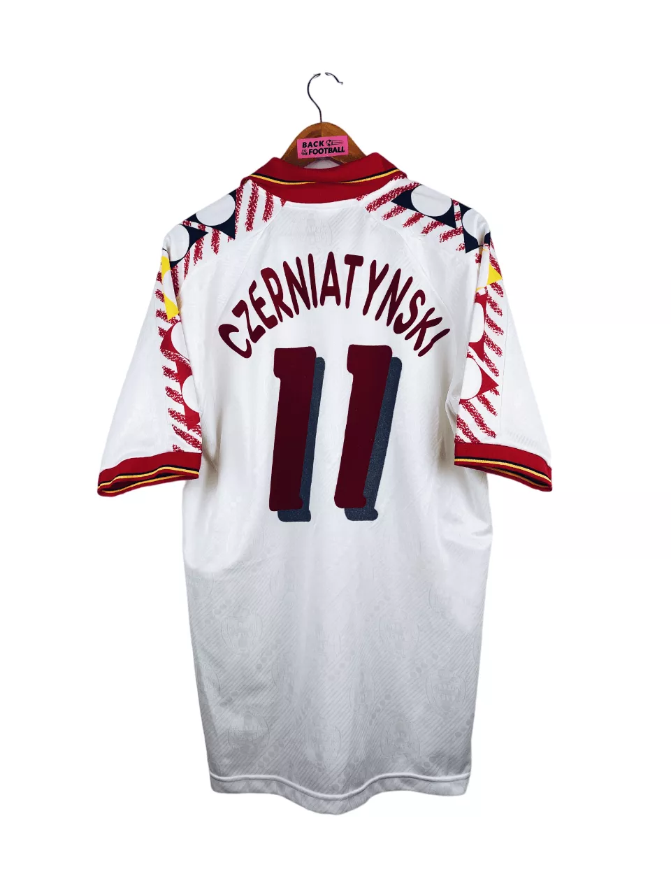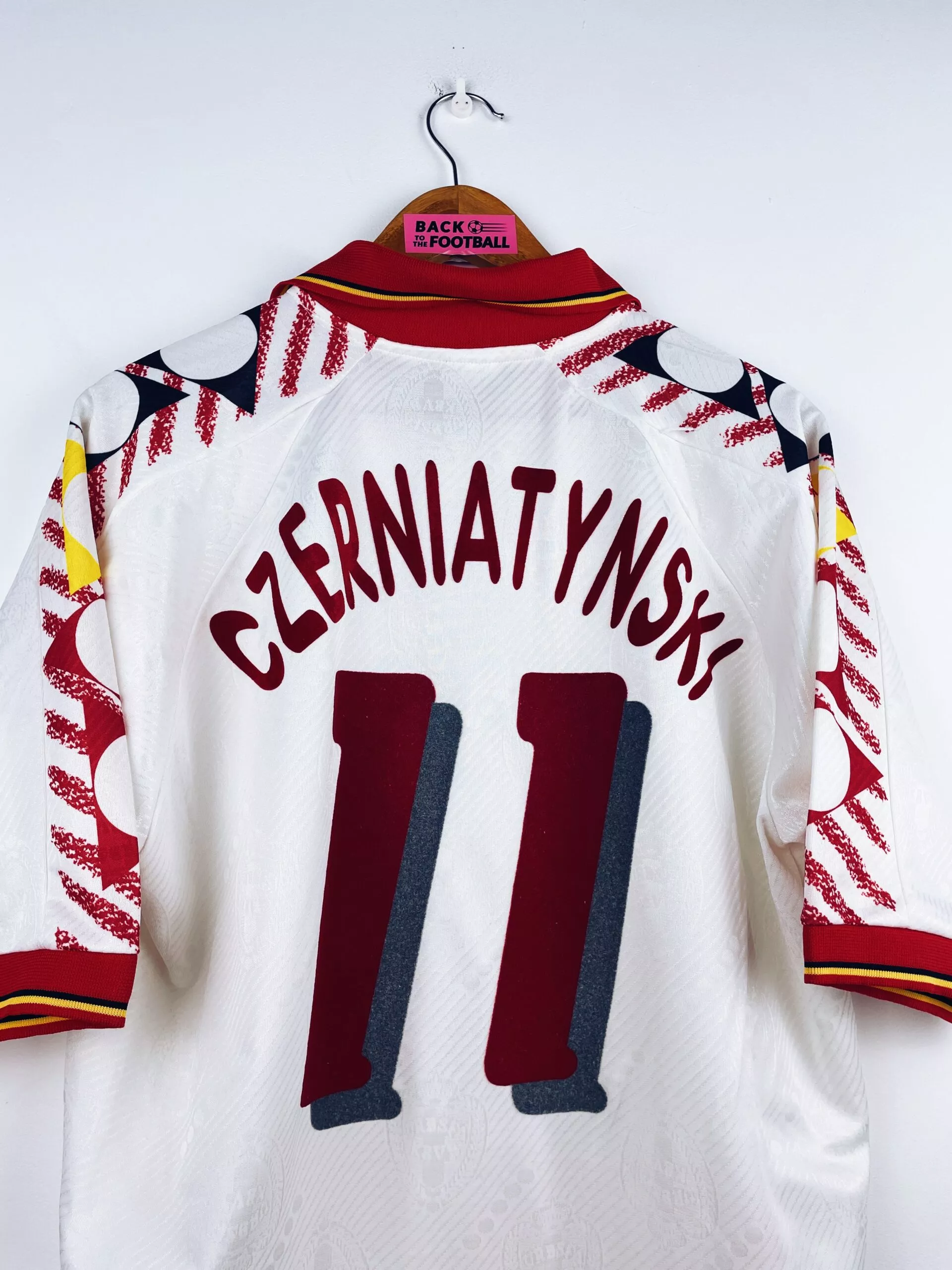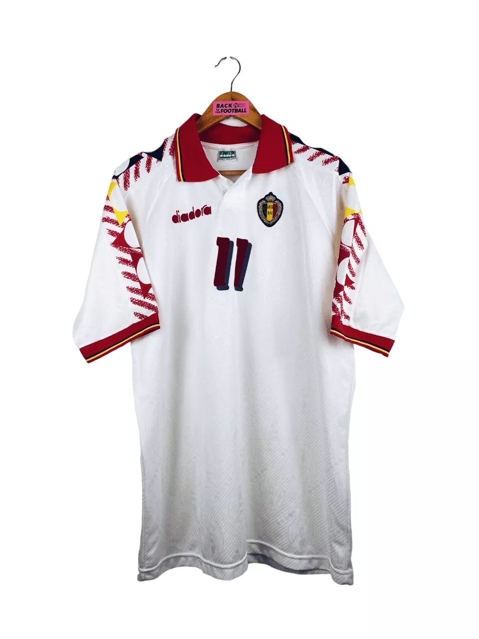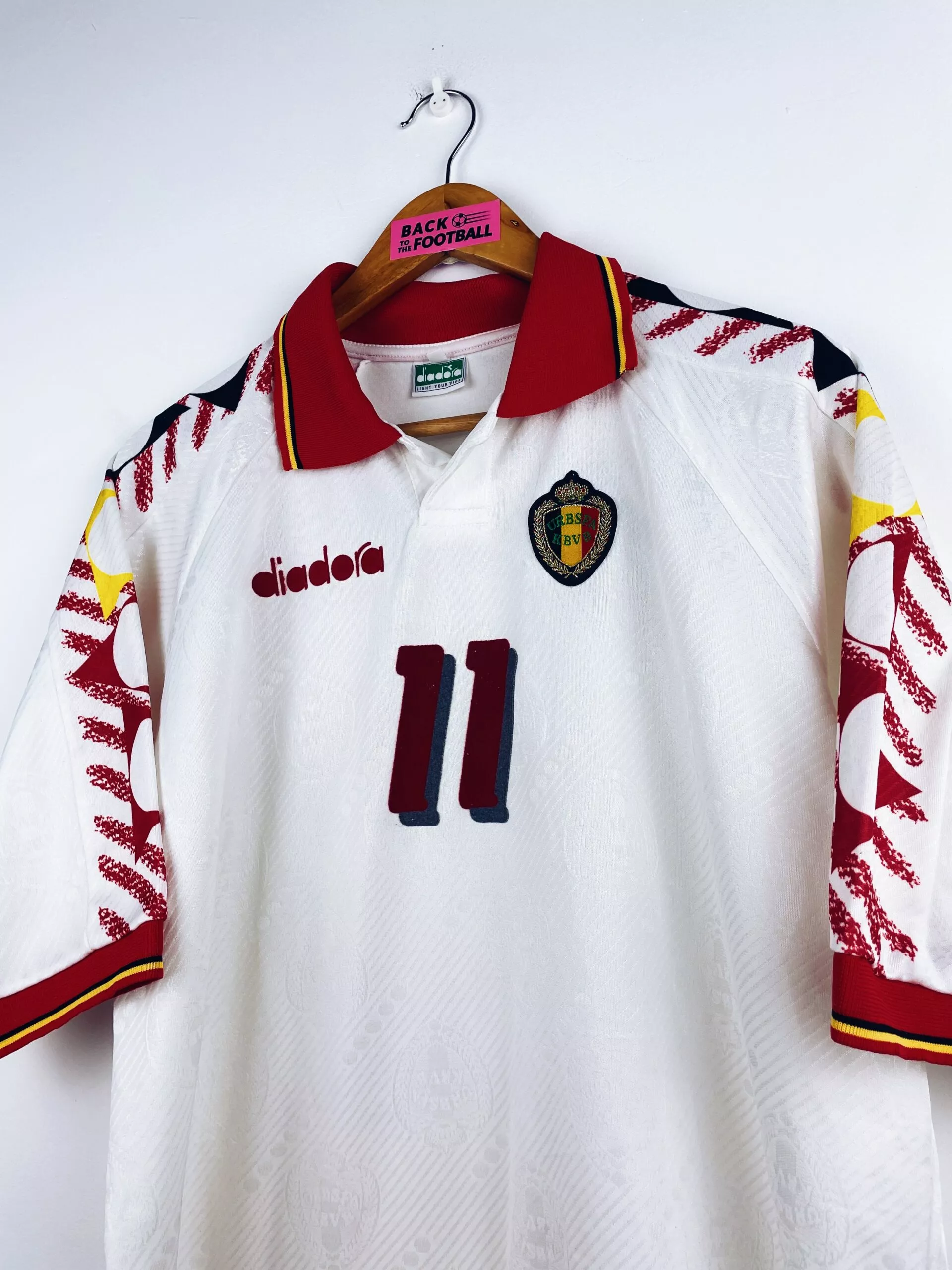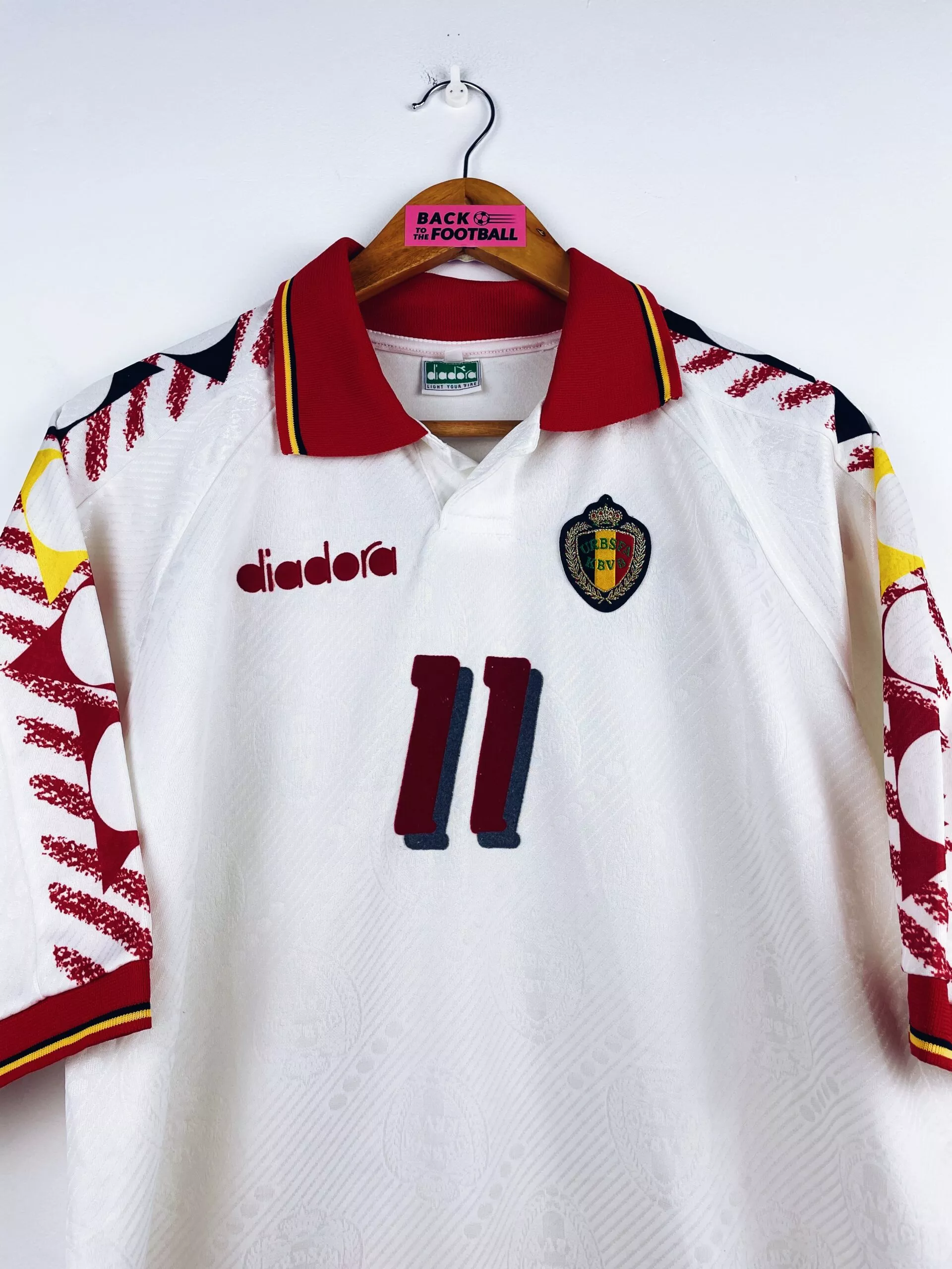 Taille : XL Si tu veux plus de détails, tu peux nous contacter par mail ou sur les réseaux 😉 Etat : 8.5/10, excellent état Le maillot : maillot vintage extérieur de la Belgique 1994 préparé (match issue) pour Czerniatynski #11. L’écusson et le logo Diadora sont brodés, Czerniatynski #11 est en feutrine. Très beau maillot rétro de la Belgique ! Histoire : maillot préparé pour Czerniatynski lors du match de Coupe du Monde 1994 contre le Maroc. Victoire 1-0, il ne rentre pas. Maillot récupéré via un proche d’un joueur marocain. Un certificat d’authenticité sera fourni.