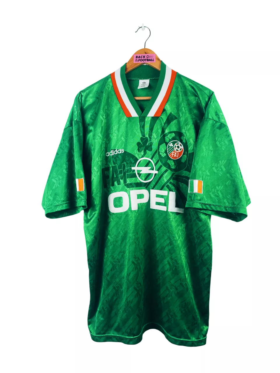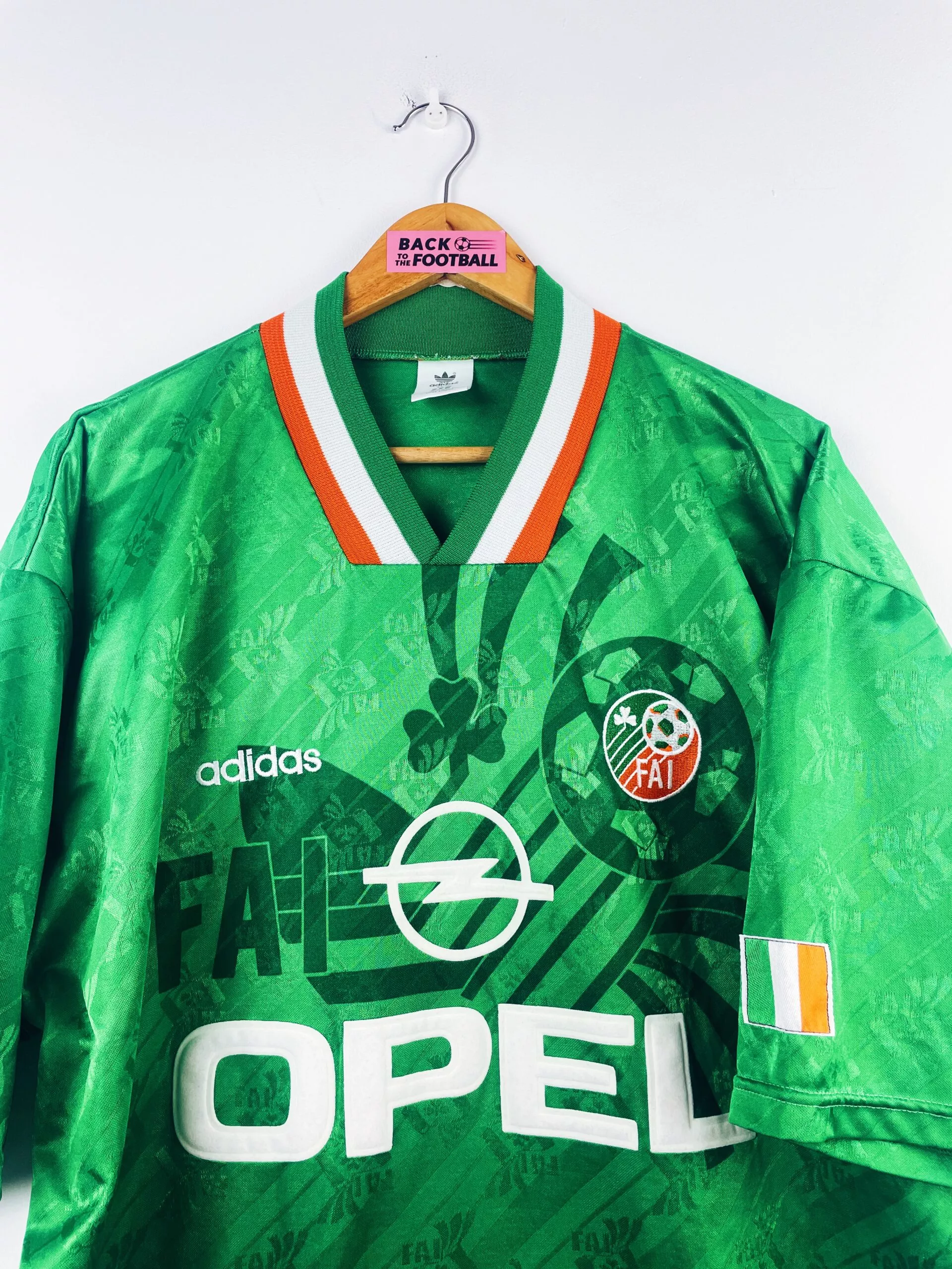 Taille : XL/XXL Largeur : 63cm (aisselle à aisselle) Longueur : 78cm (base du col au bas) Si tu veux plus de détails, tu peux nous contacter par mail ou sur les réseaux 😉 Etat : 9/10, excellent état Le maillot : maillot vintage domicile de l’Irlande 1994. L’écusson et le logo Adidas sont brodés, le sponsor Opel est en feutrine. Très beau maillot rétro de l’Irlande ! Histoire : les irlandais se qualifient à la CDM 94 de justesse en terminant 2èmes de leur groupe derrière l’Espagne, à égalité de points avec le Danemark mais avec une meilleure attaque.…