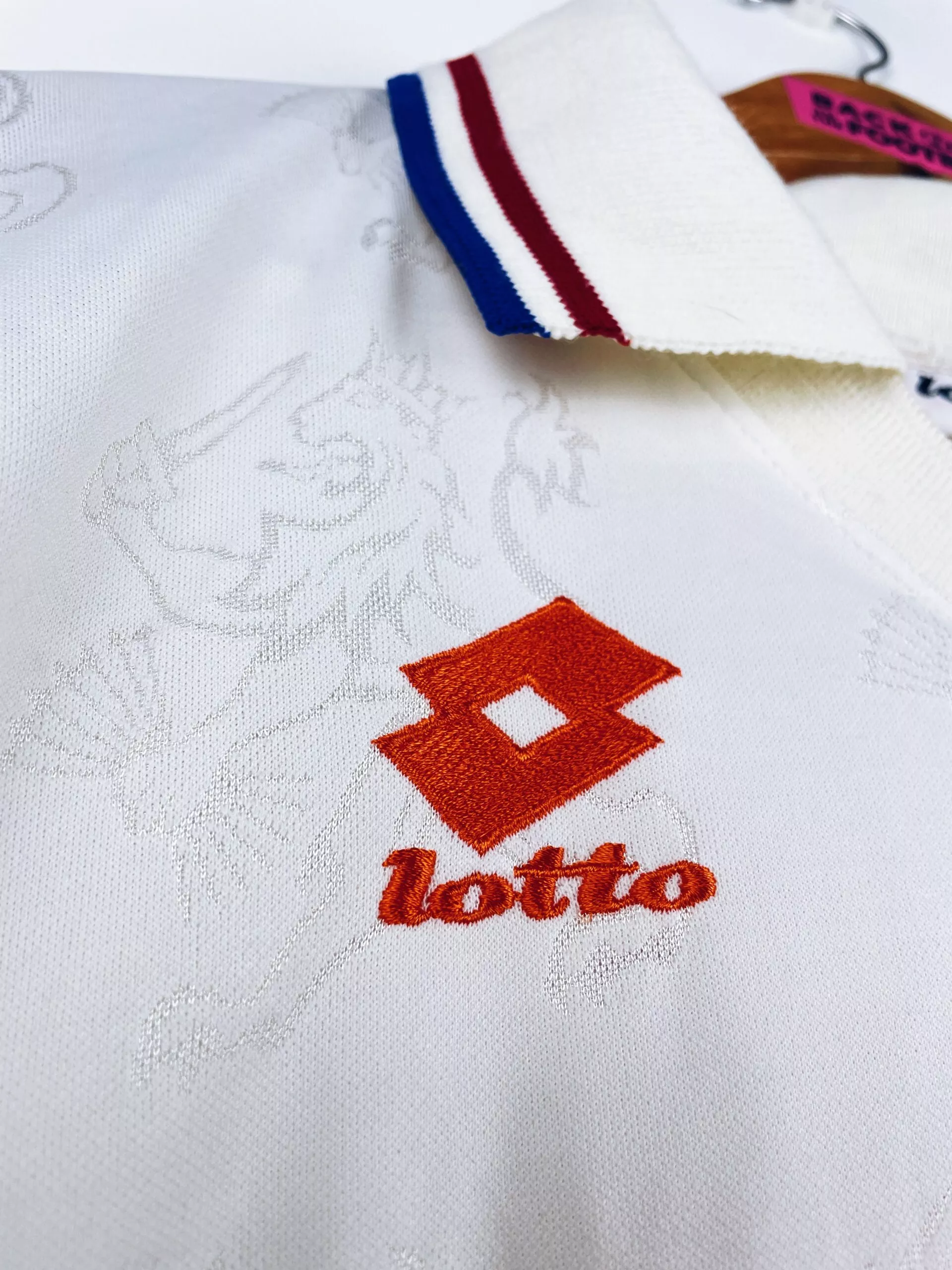 Taille : XL Si tu veux plus de détails, tu peux nous contacter par mail ou sur les réseaux 😉 Etat : 8/10, très bon état Le maillot : maillot vintage extérieur des Pays-Bas 1994 porté (match worn) par Winter lors de la Coupe du Monde 1994 : écusson et logo Lotto brodés, numéros 20 incrustés, Winter en feutrine. Quel maillot rétro de la Hollande ! Histoire : maillot porté par Aron Winter lors du match de poules contre le Maroc. Victoire 2-1 pour les Oranje. Il joue tout le match. Le maillot a été échangé avec un joueur marocain.…