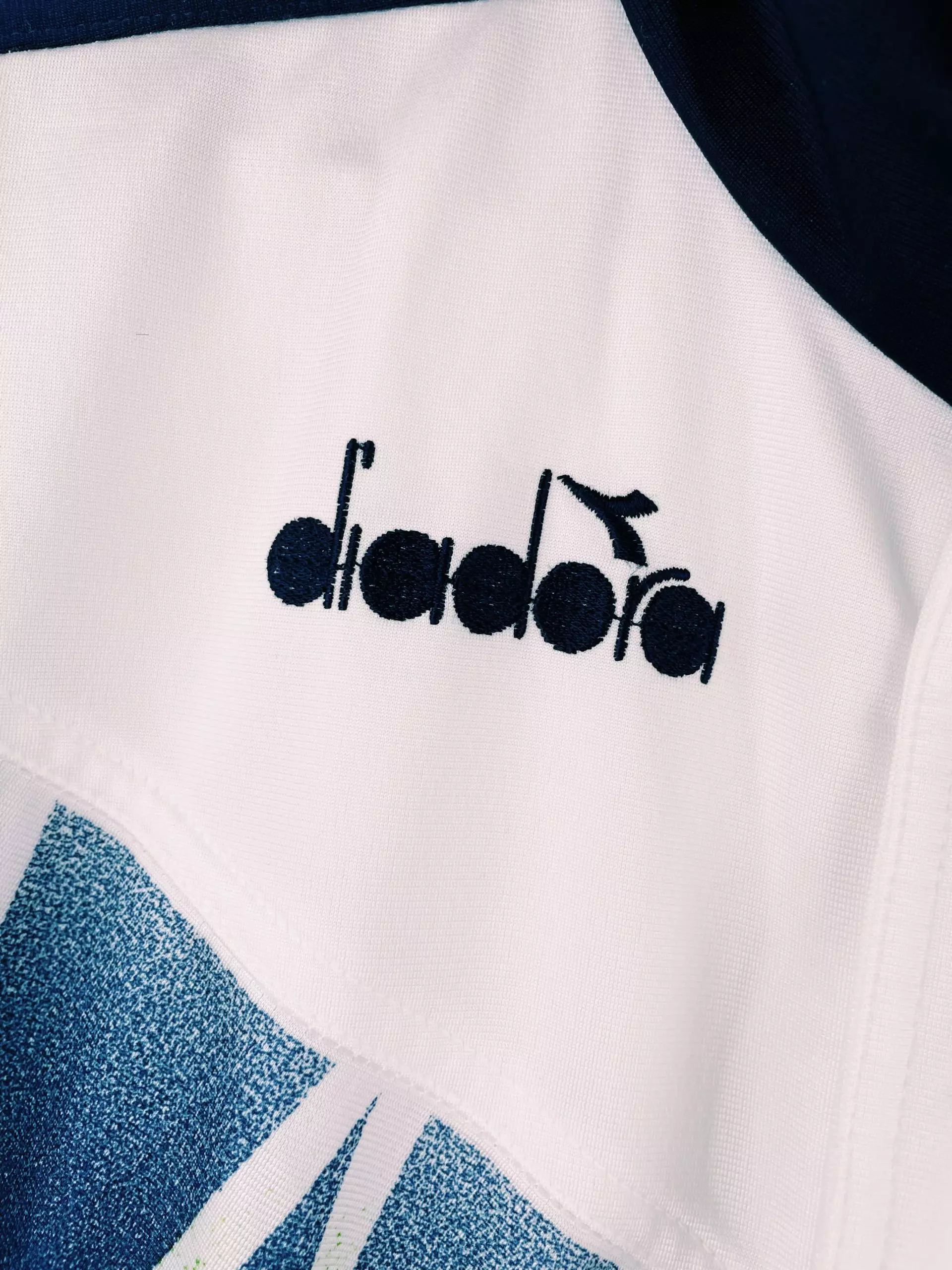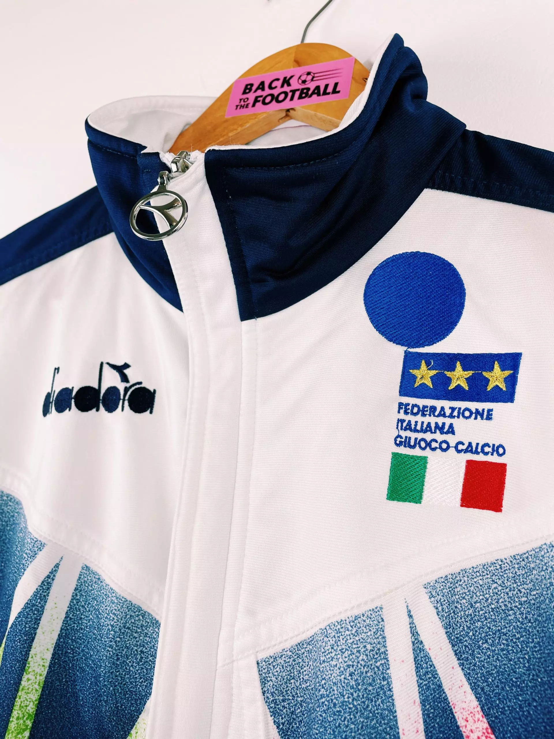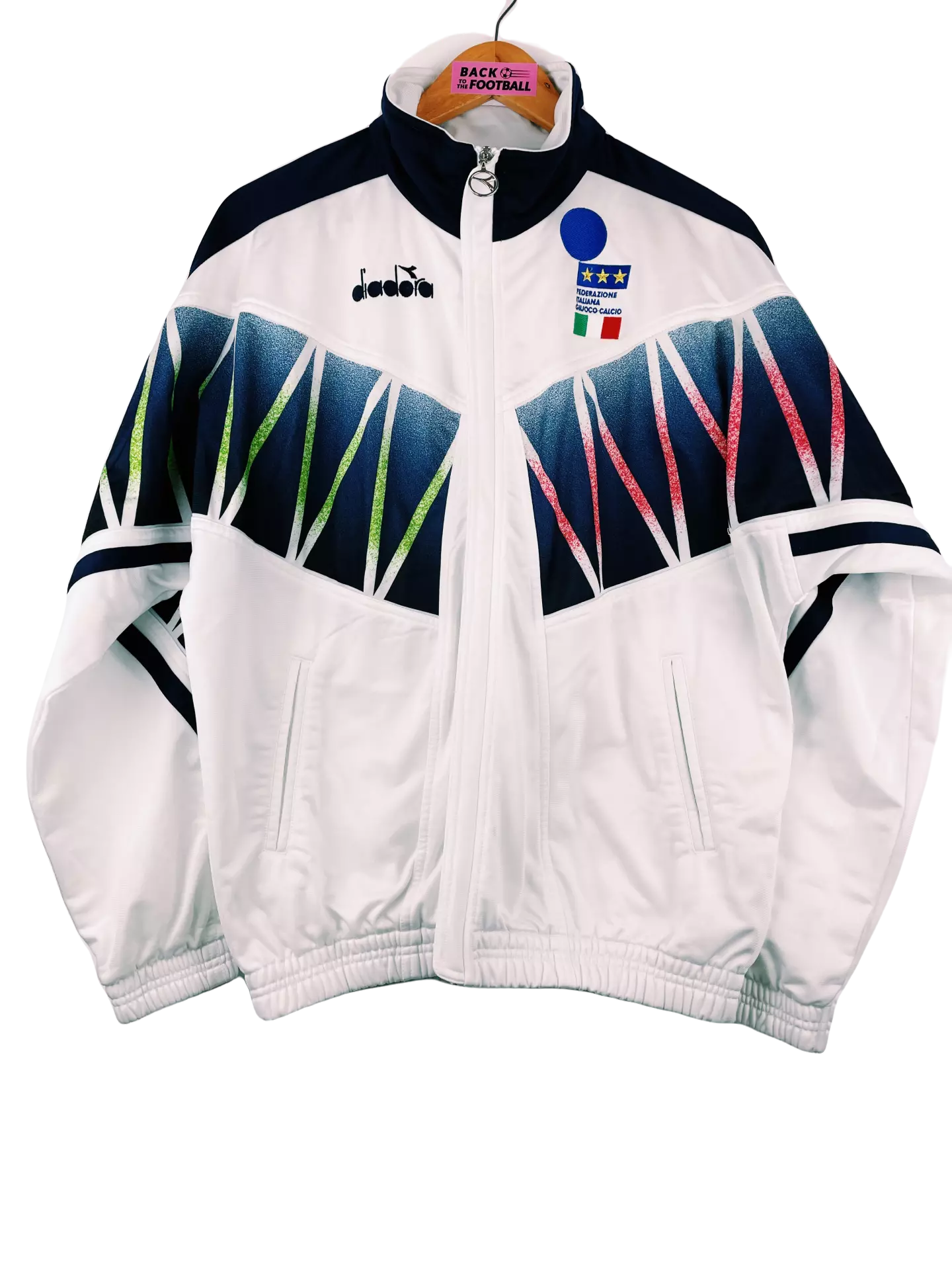 Taille : M Etat : bon Ă©tat La veste : magnifique veste vintage Diadora de l’Italie pour la Coupe du Monde 1994. La veste blanche reprend les couleurs vertes et rouges de l’Italie sur les motifs. La veste est zippĂ©e. L’Ă©cusson de la Squadra Azurra est brodĂ©, comme le logo Diadora. Histoire : le groupe de l’Italie en poules est très serrĂ©, puisque les 4 Ă©quipes finissent Ă 4 points. L’Italie s’en sort Ă la diffĂ©rence de buts. Elle ira jusqu’en finale contre le BrĂ©sil, qui se solda par une dĂ©faite aux pĂ©naltys lorsque que Roberto Baggio manqua le sien.…
