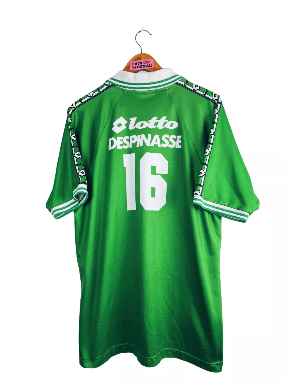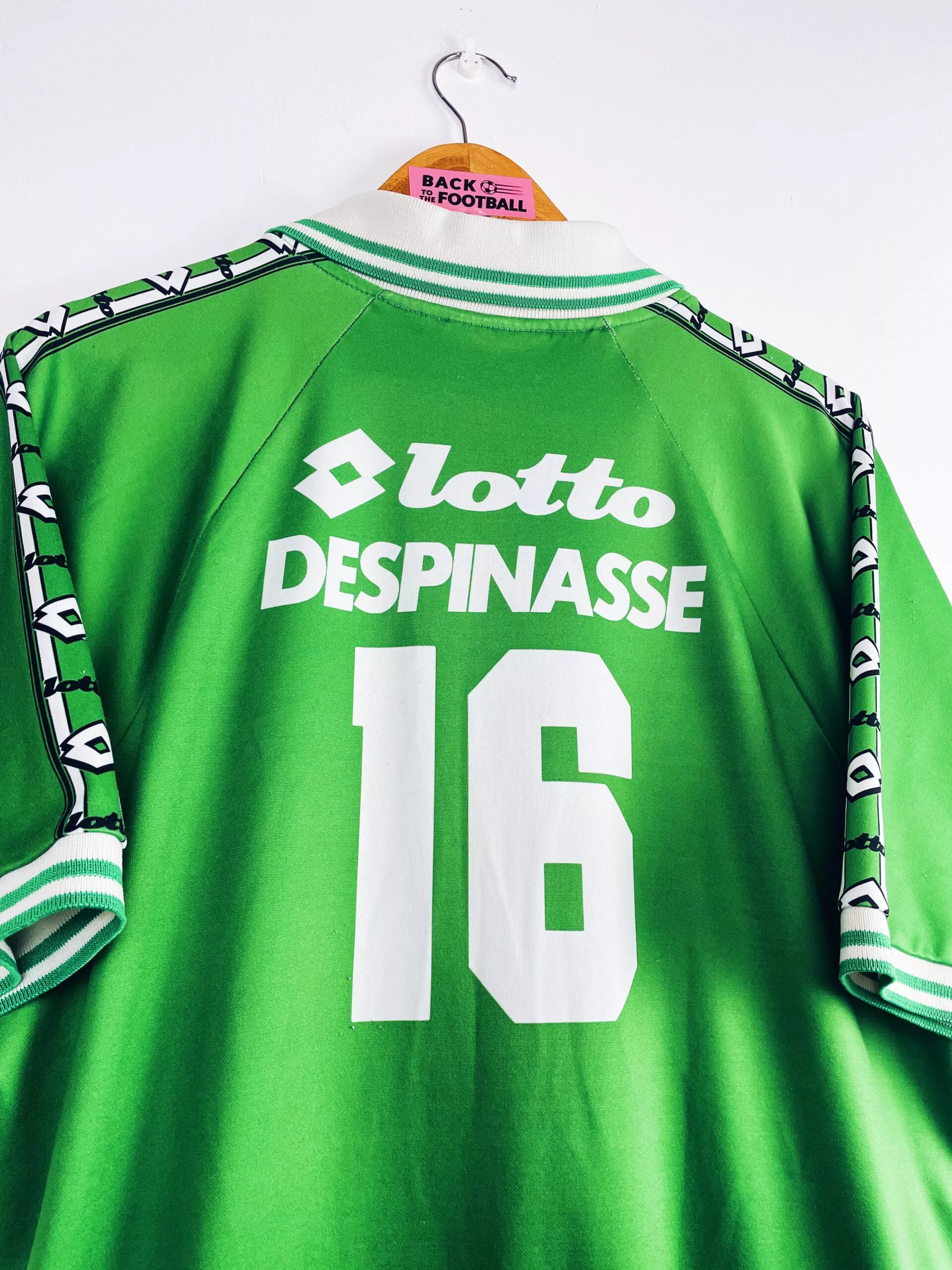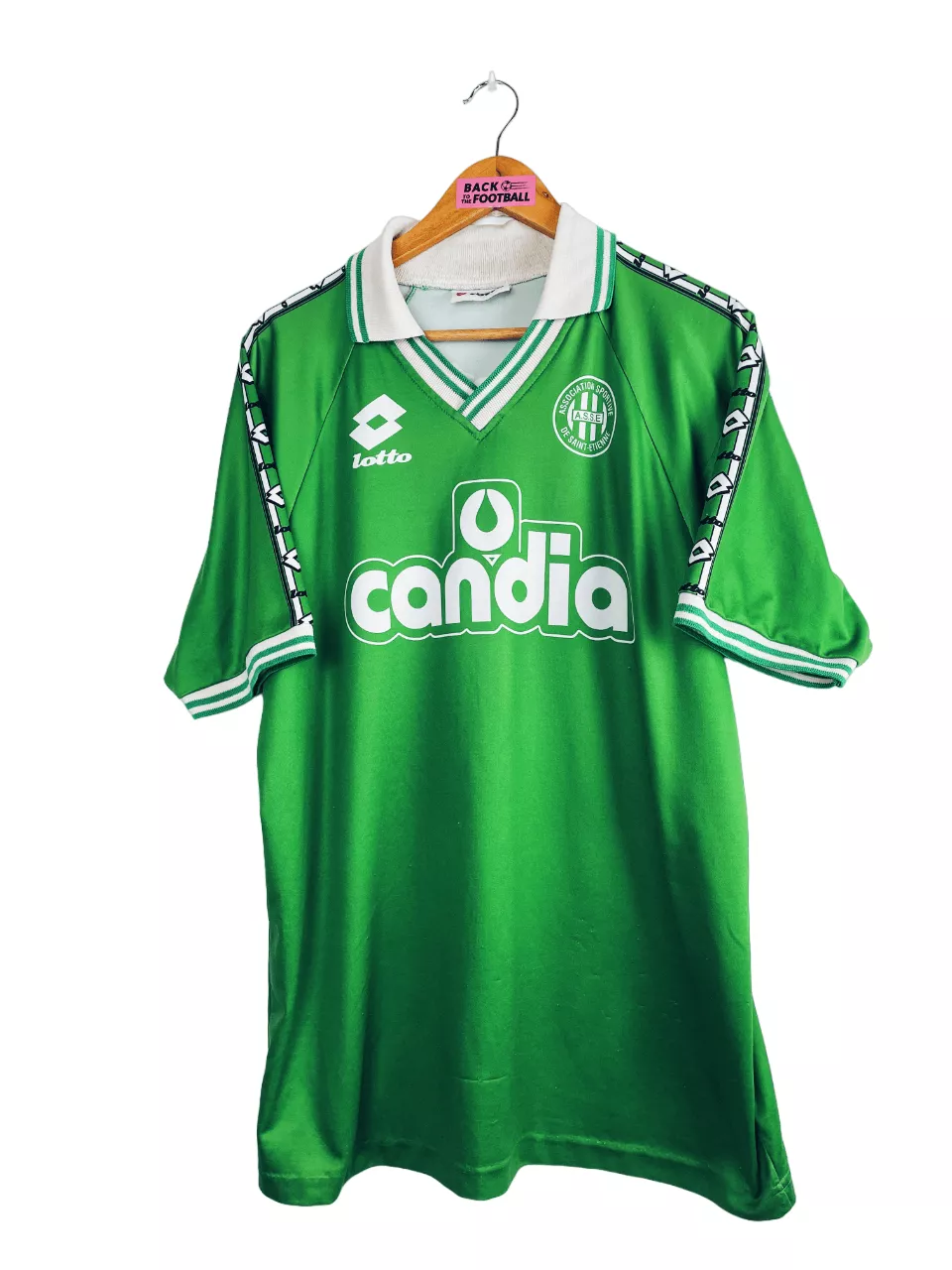 Taille : L Largeur : 55cm (aisselle à aisselle) Longueur : 74cm (base du col au bas) Etat : 7.5/10, très bon état hormis des bouloches et un accro en bas du maillot. L’intérieur du col est aussi moins blanc (voir photos) Le maillot : maillot vintage domicile de l’AS Saint-Etienne 1995/1996 issu du stock pro de la réserve. L’écusson, le logo Lotto et le sponsor Candia sont incrustés directement au maillot. Le numéro 16 au dos aussi. Très beau maillot rétro de Saint-Etienne ! Histoire : La réserve de l’ASSE termine à la 8ème place de National 2 avec…