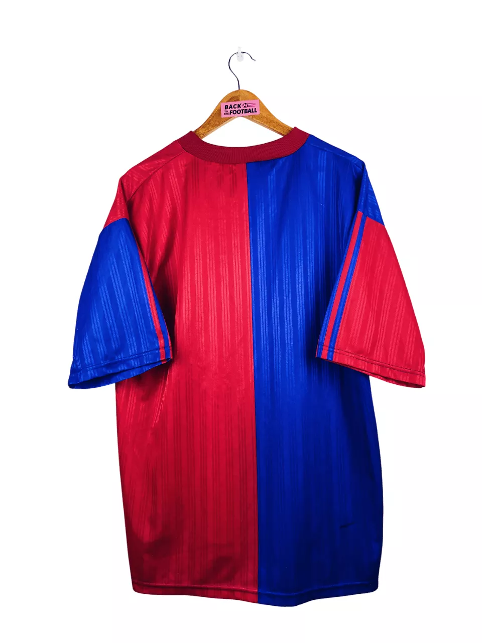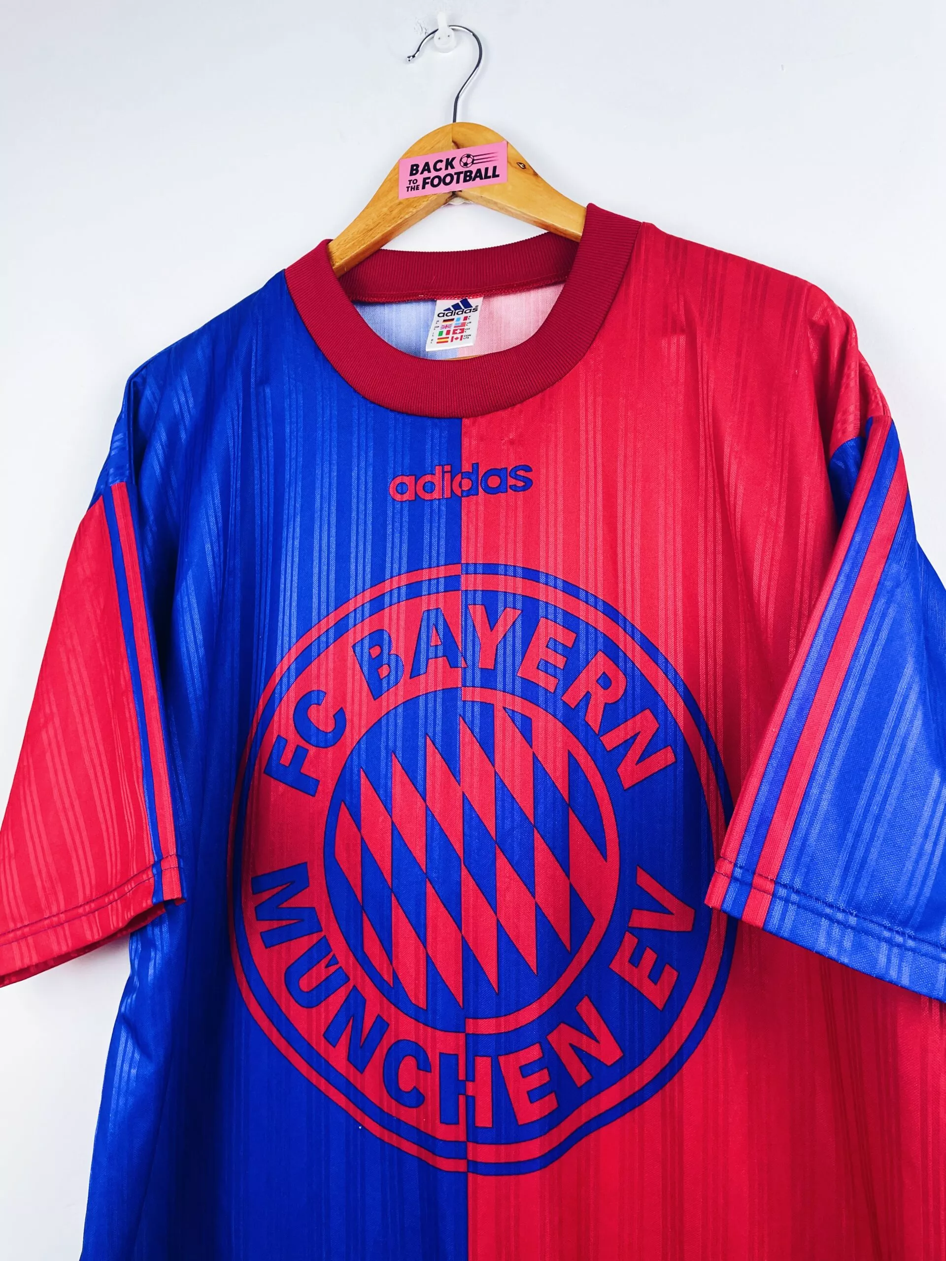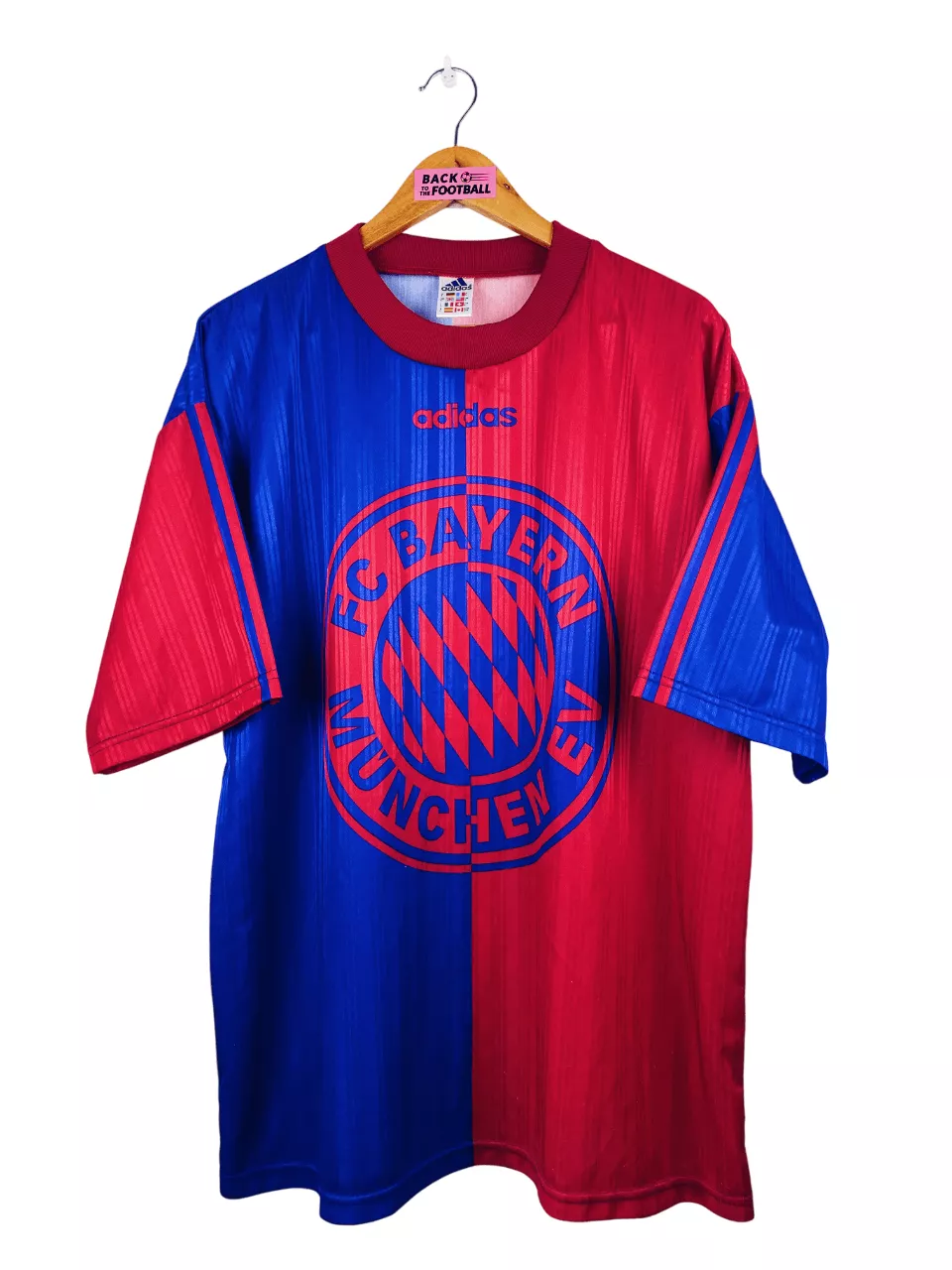 Taille : L Largeur : 58cm (aisselle à aisselle) Longueur : 73cm (base du col au bas) Si tu veux plus de détails, tu peux nous contacter par mail ou sur les réseaux 😉 Etat : 8/10, très bon état mais une trace en bas du dos (voir photo) Le maillot : maillot vintage entrainement du Bayern Munich 1995/1996. L’écusson et le logo Adidas sont incrustés. Très beau maillot rétro du Bayern ! Histoire : les bavarois termineront à la 2ème place de Bundesliga, derrière le Borussia Dortmund. Ils gagneront la coupe de l’UEFA face aux Girondins de Bordeaux, avec…