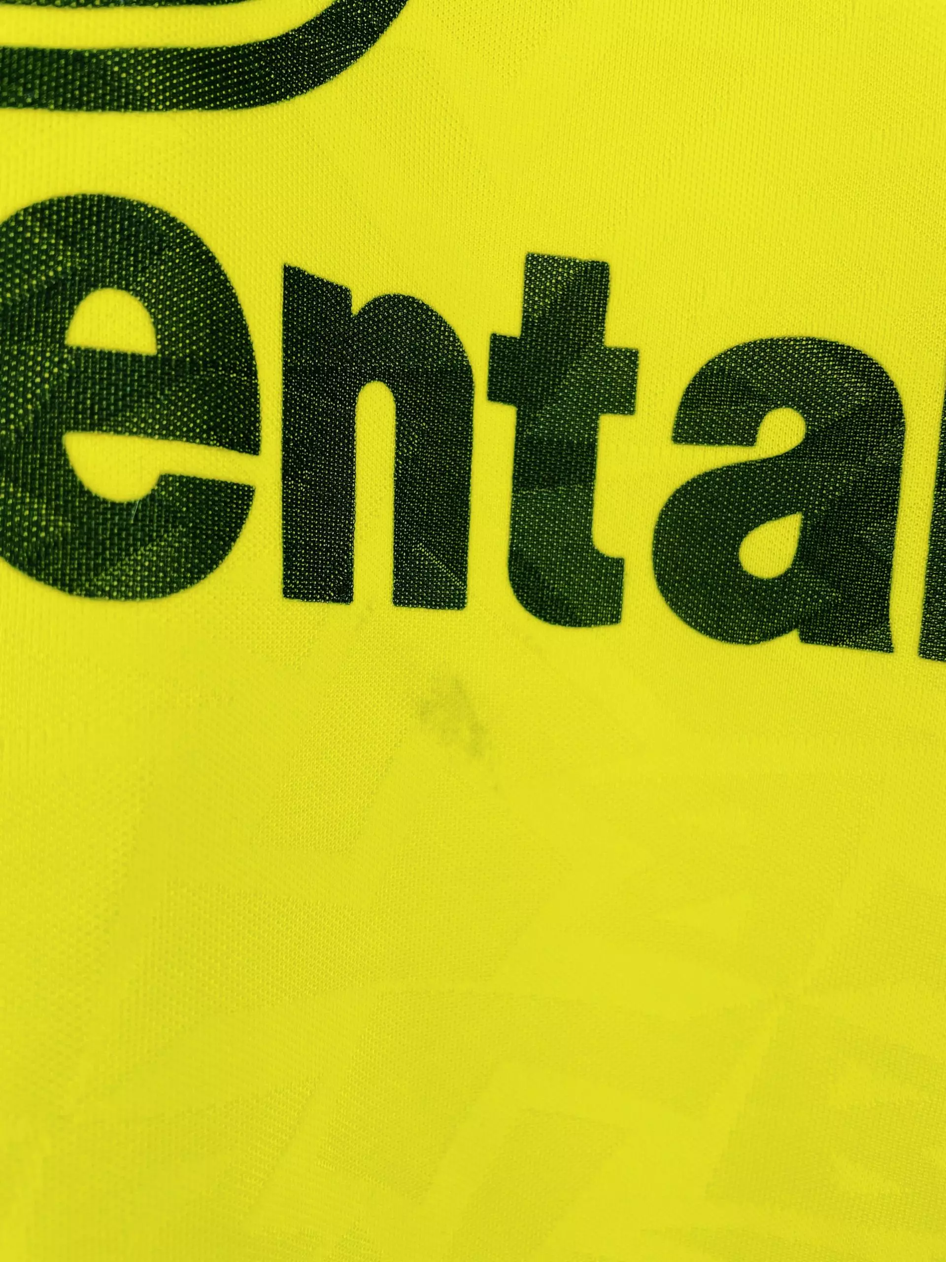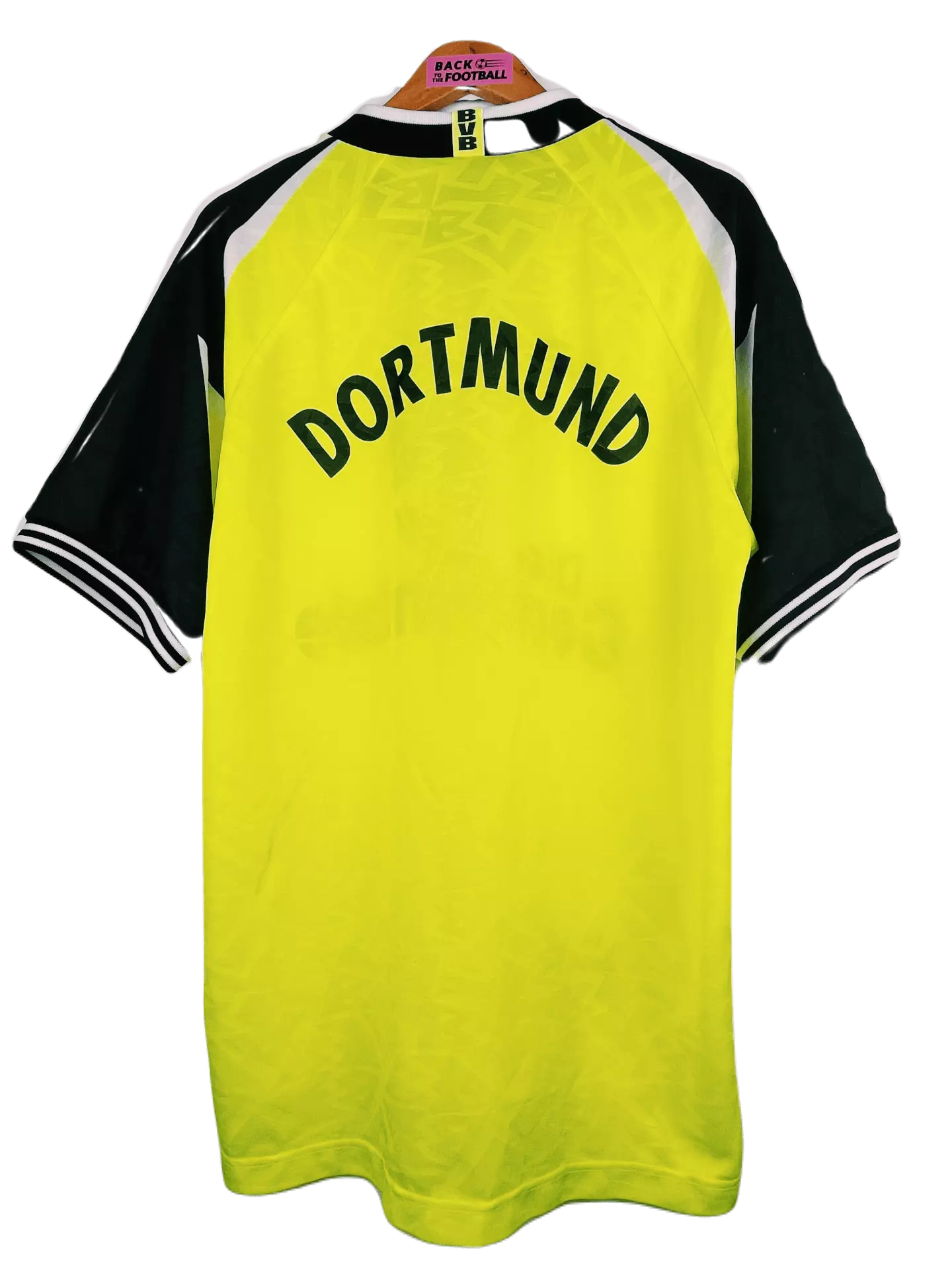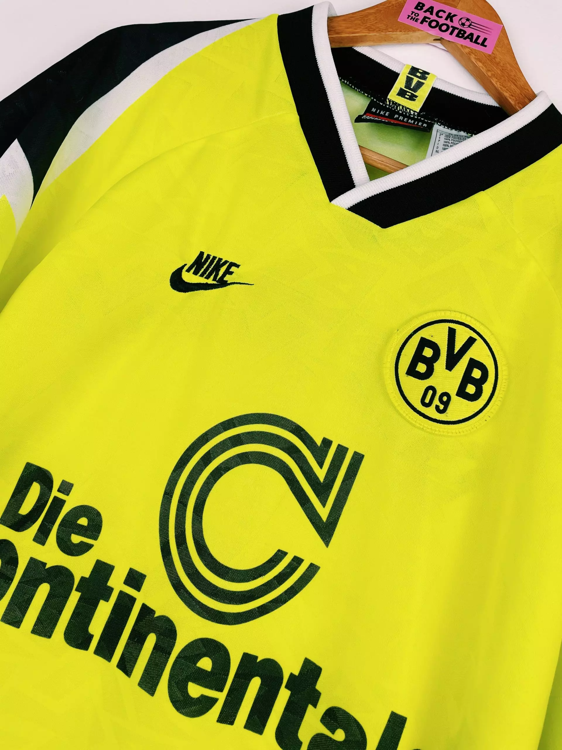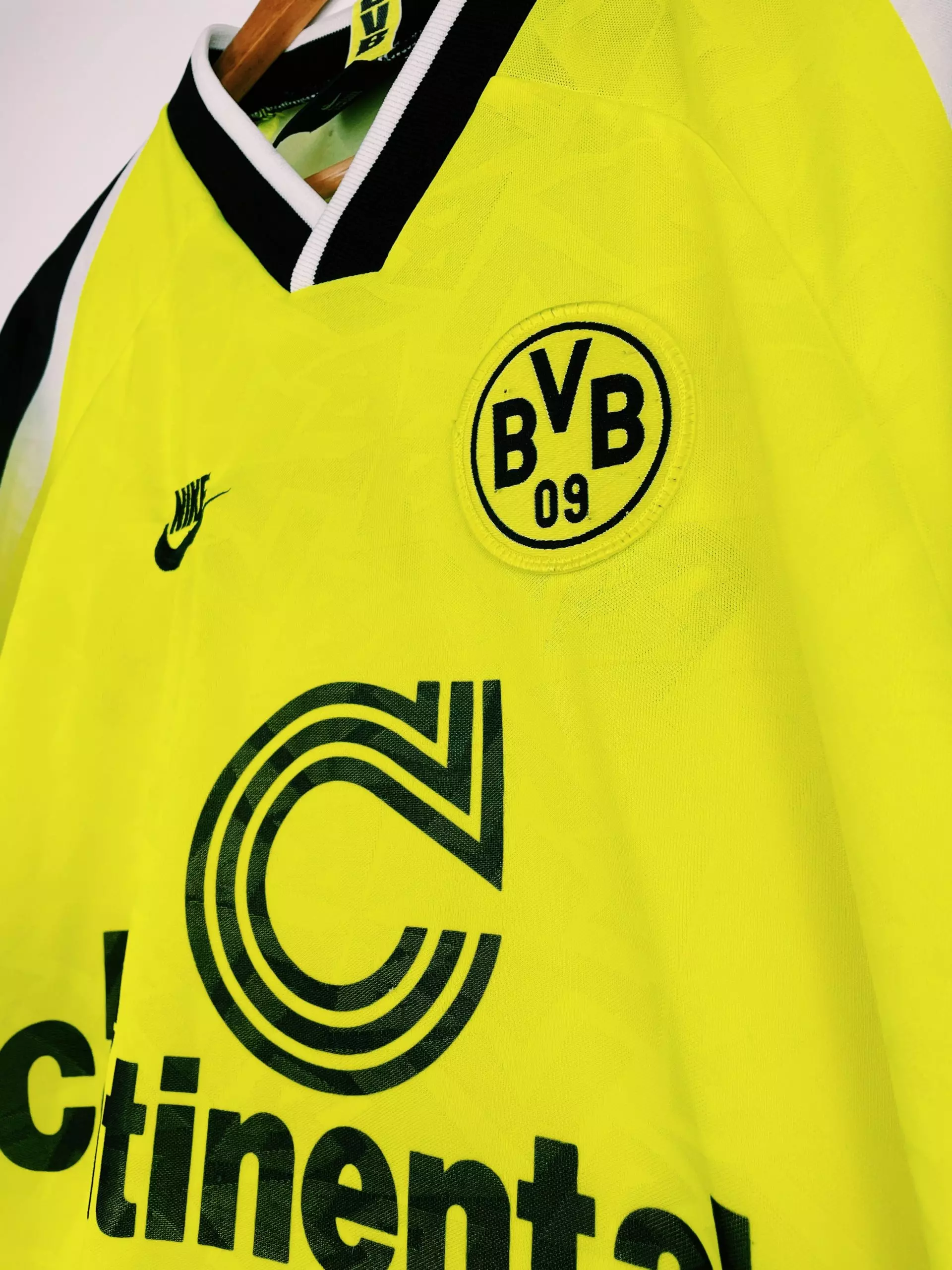 Taille : L Etat : très bon état hormis une tâche au niveau du sponsor. D’où le petit prix. Le maillot : maillot vintage Nike domicile de Dortmund, saison 1995/1996. Le maillot jaune fluo est fabriqué en Angleterre. L’écusson du Borussia est brodé, comme le logo Nike. Le sponsor iconique Die Continale est incrusté au maillot. Histoire : le Borussia Dortmund sera sacré champion de Bundesliga, devant le Bayern Munich. Ils gagneront aussi la Super Coupe d’Allemagne. Ils n’iront pas plus loin qu’en quart en Coupe d’Allemagne et Ligue des Champions. Michael Zorc sera le meilleur buteur du club avec…