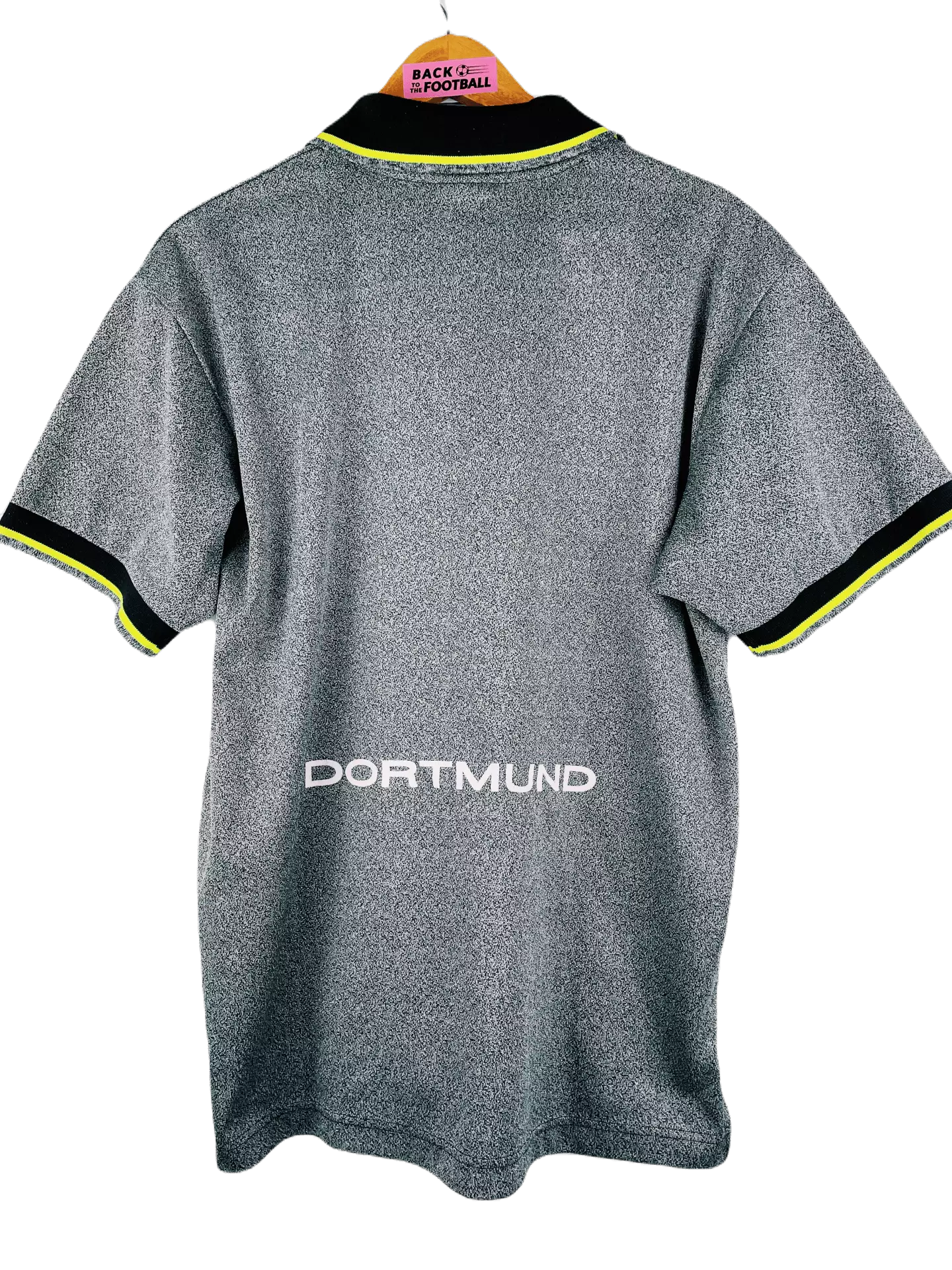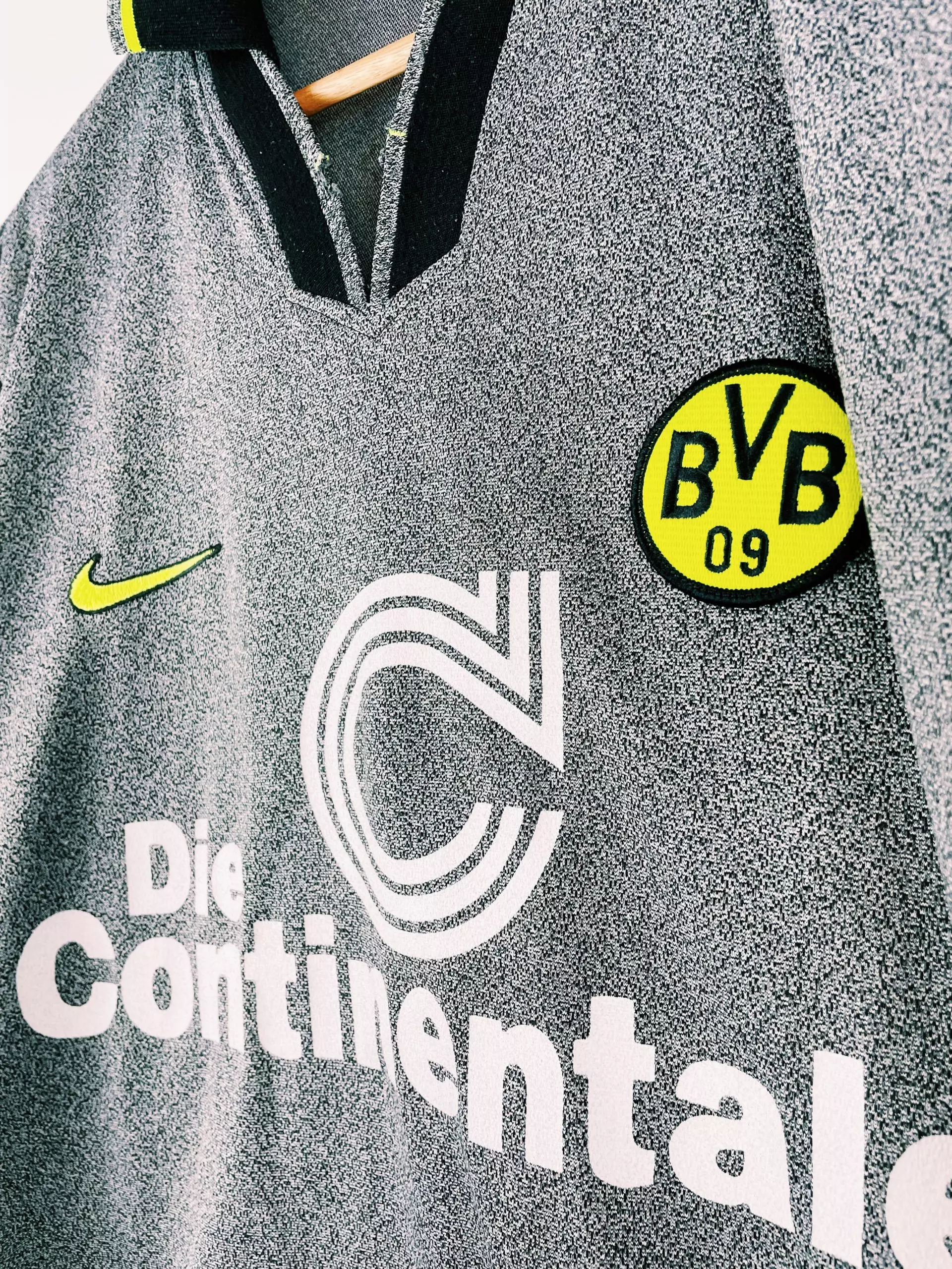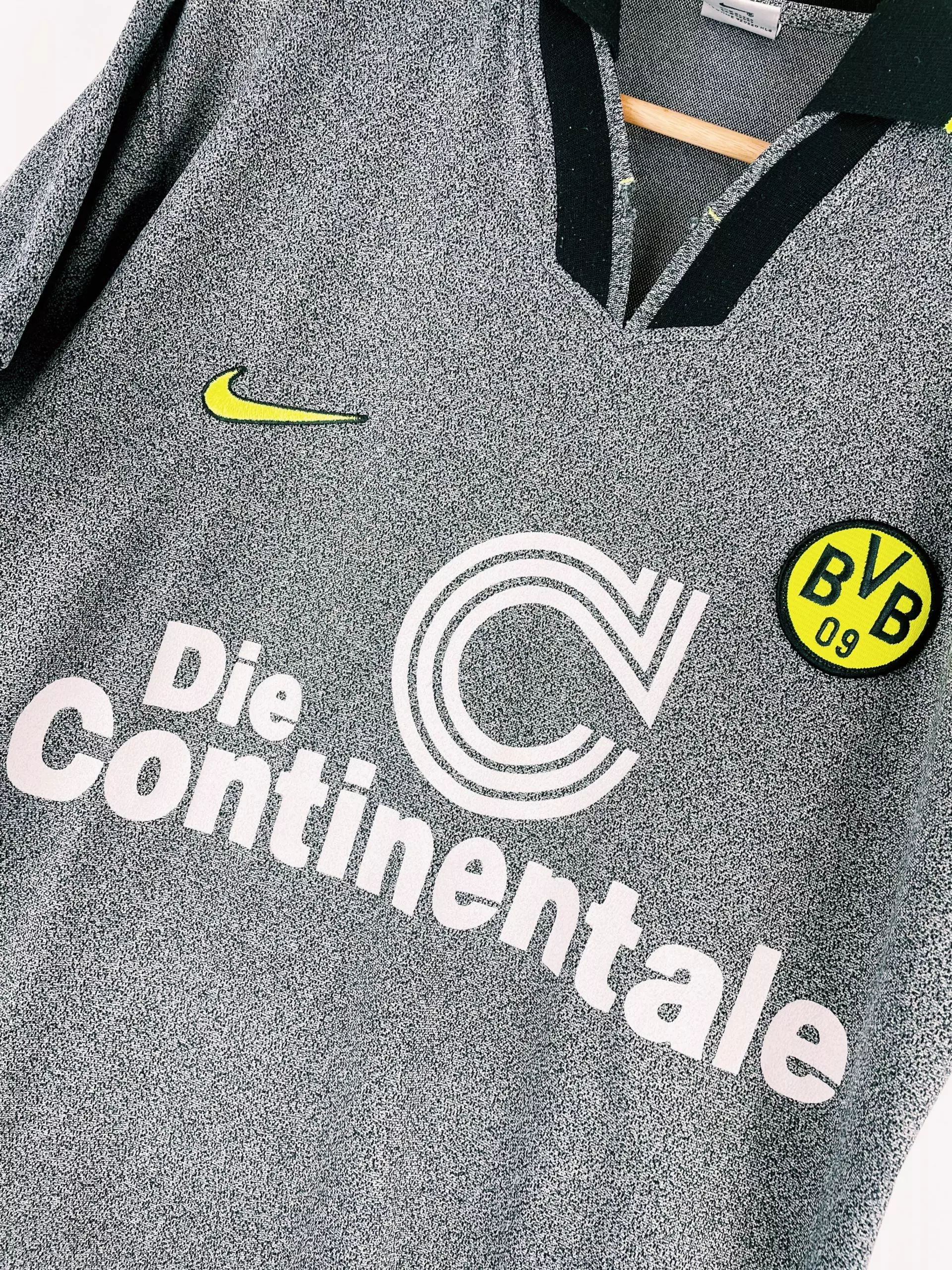 Taille : M Etat : très bon état hormis les coutures au niveau du col qui l’ont ouvert Le maillot : maillot vintage Nike third de Dortmund, saison 1995/1996. Le maillot gris chiné est fabriqué en Angleterre. Le jaune fluo fait bien ressortir les éléments. L’écusson du Borussia est brodé, comme le logo Nike. Le sponsor iconique Die Continale est floqué. Histoire : le Borussia Dortmund sera sacré champion de Bundesliga, devant le Bayern Munich. Ils gagneront aussi la Super Coupe d’Allemagne. Ils n’iront pas plus loin qu’en quart en Coupe d’Allemagne et Ligue des Champions. Michael Zorc sera le…