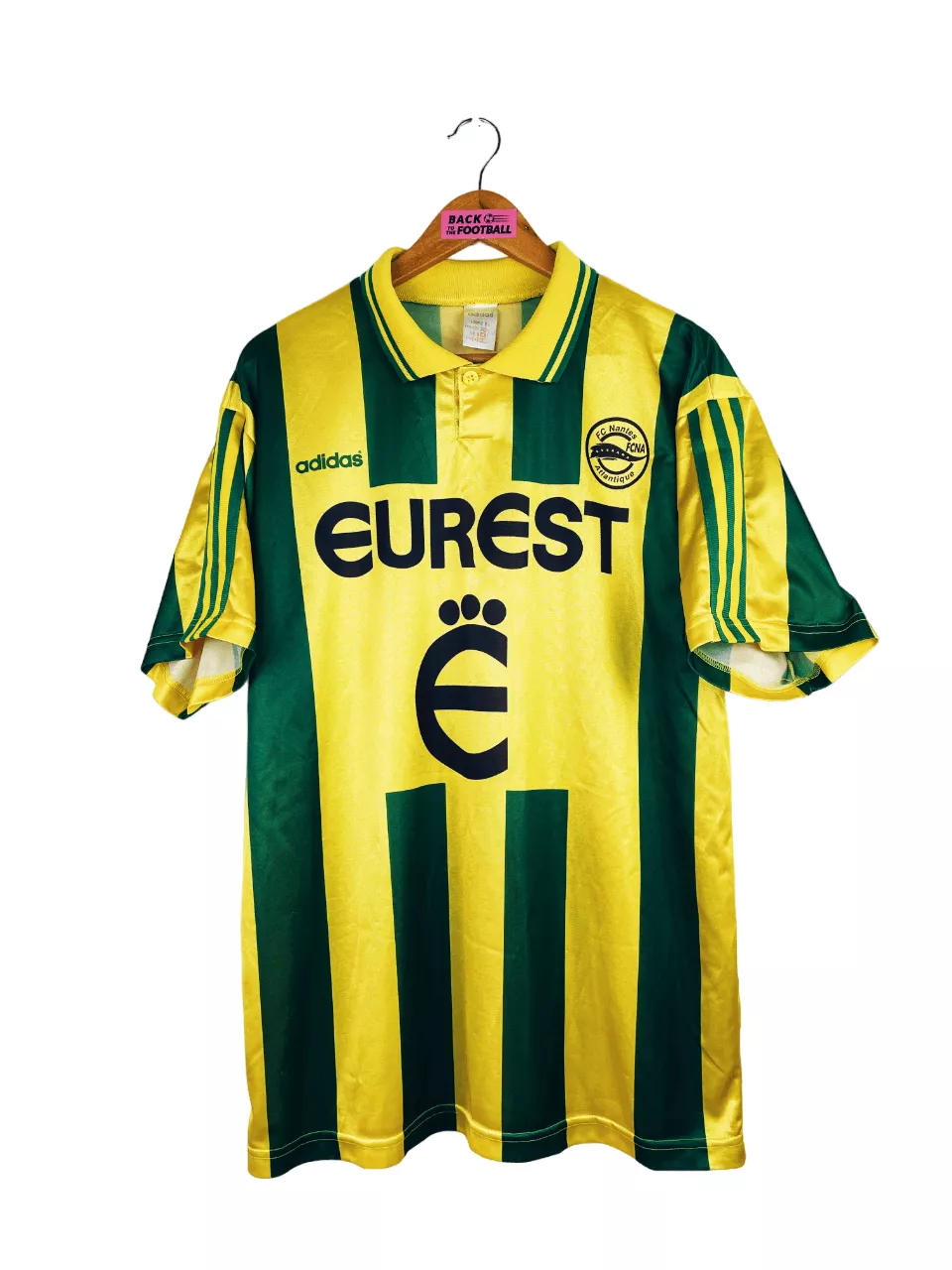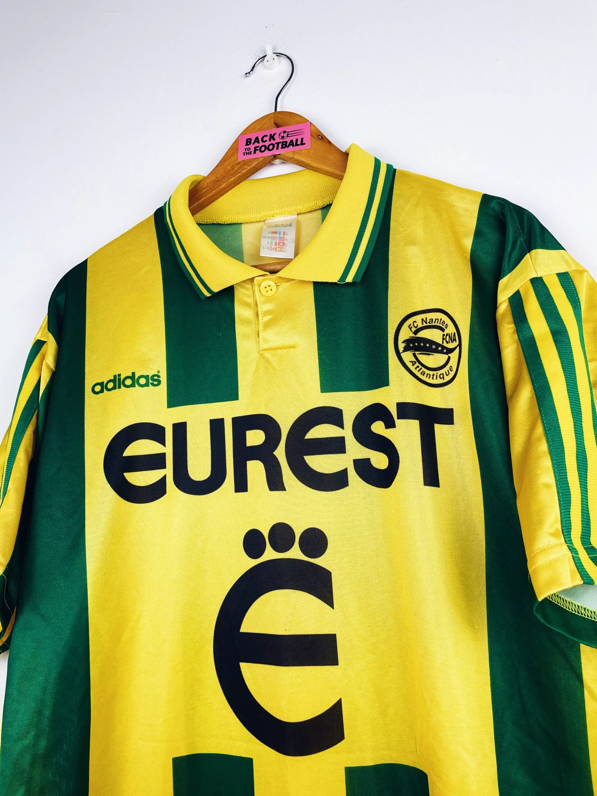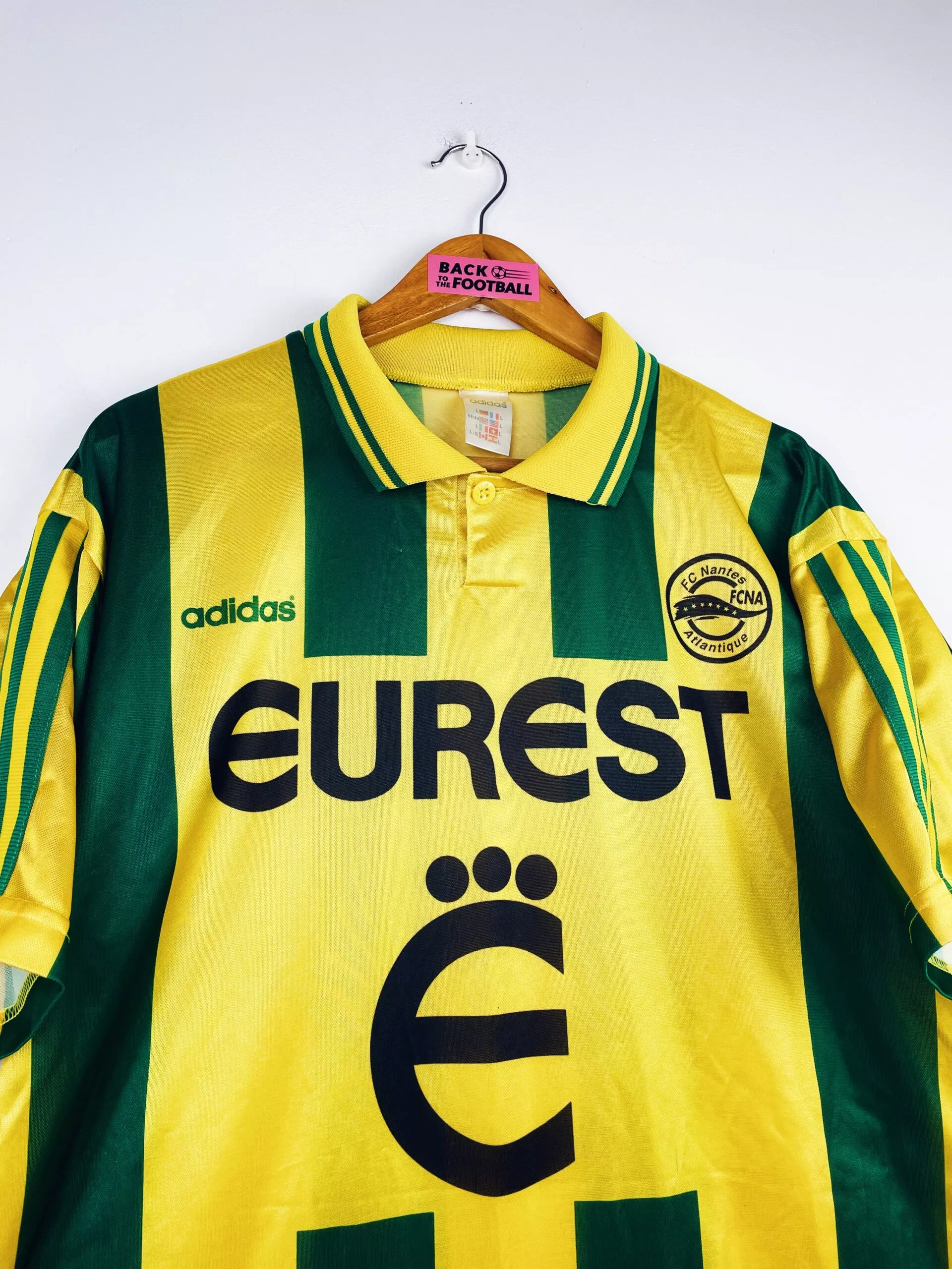 Taille : L Si tu veux plus de détails, tu peux nous contacter par mail ou sur les réseaux 😉 Etat : 8/10, très bon état Le maillot : maillot vintage domicile de Nantes 1995/1996. L’écusson, le logo Adidas et le sponsor Eurest sont incrustés au maillot. Très beau maillot rétro du FC Nantes ! Histoire : champions de France en titre, les Canaris n’arrivent pas à garder leur titre avec une 7ème place en Division 1. En Coupes nationales, ils seront rapidement éliminés, à chaque fois aux tirs au but. Par contre, ils font un très beau parcours en…