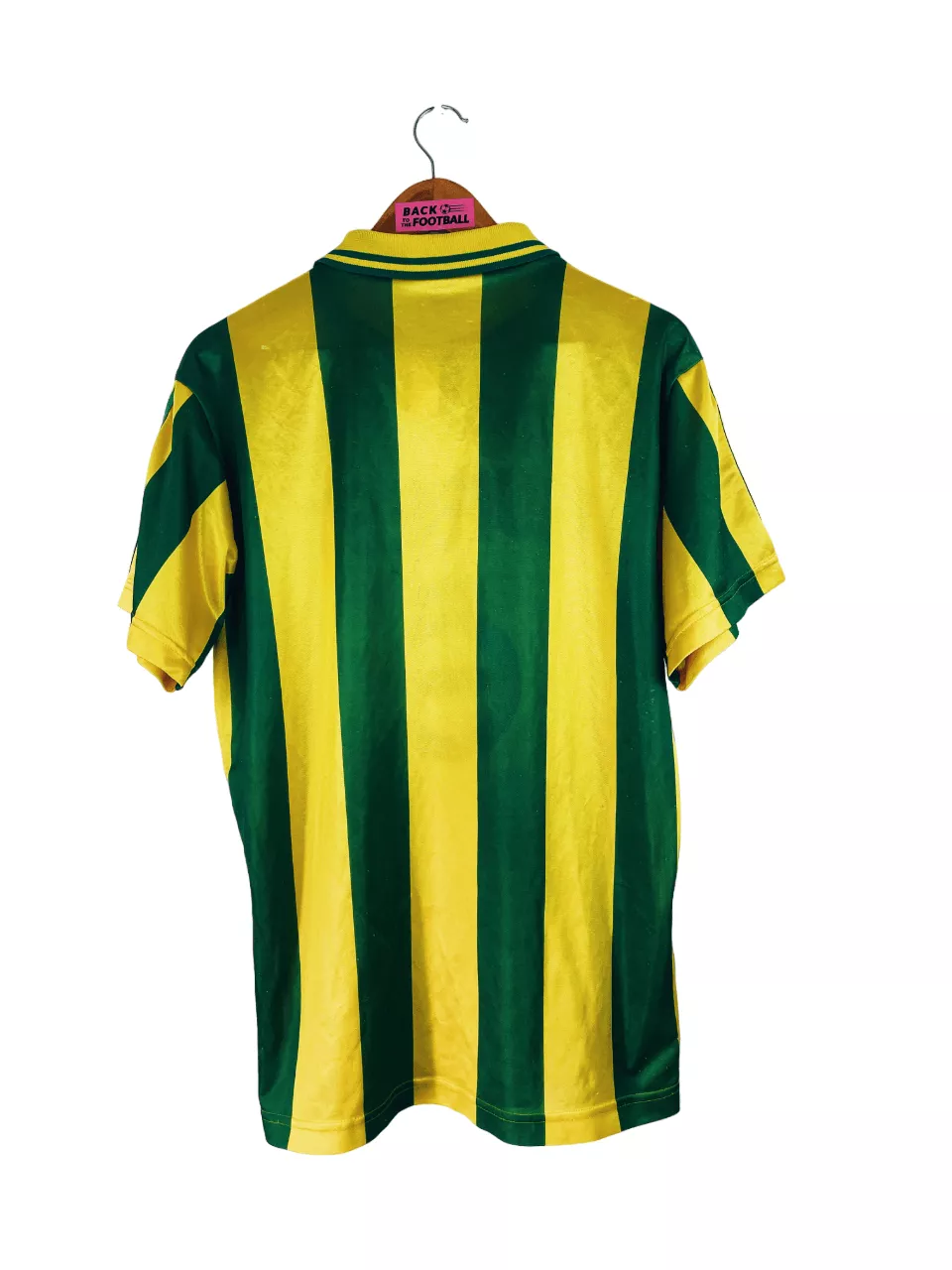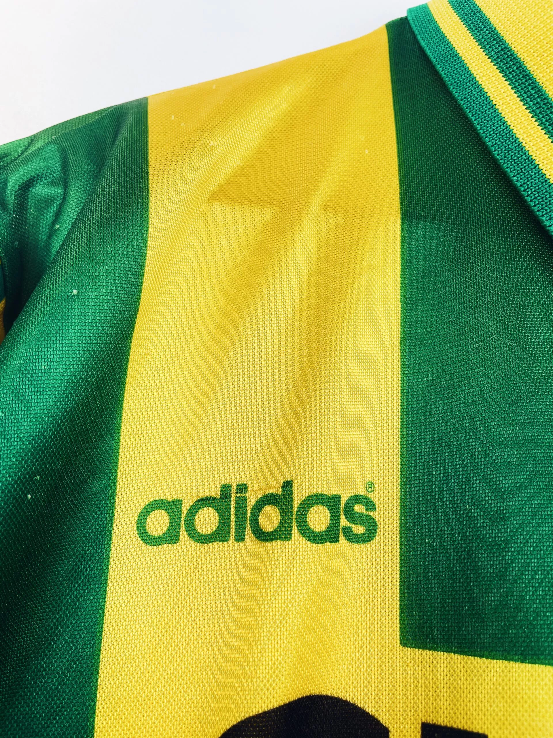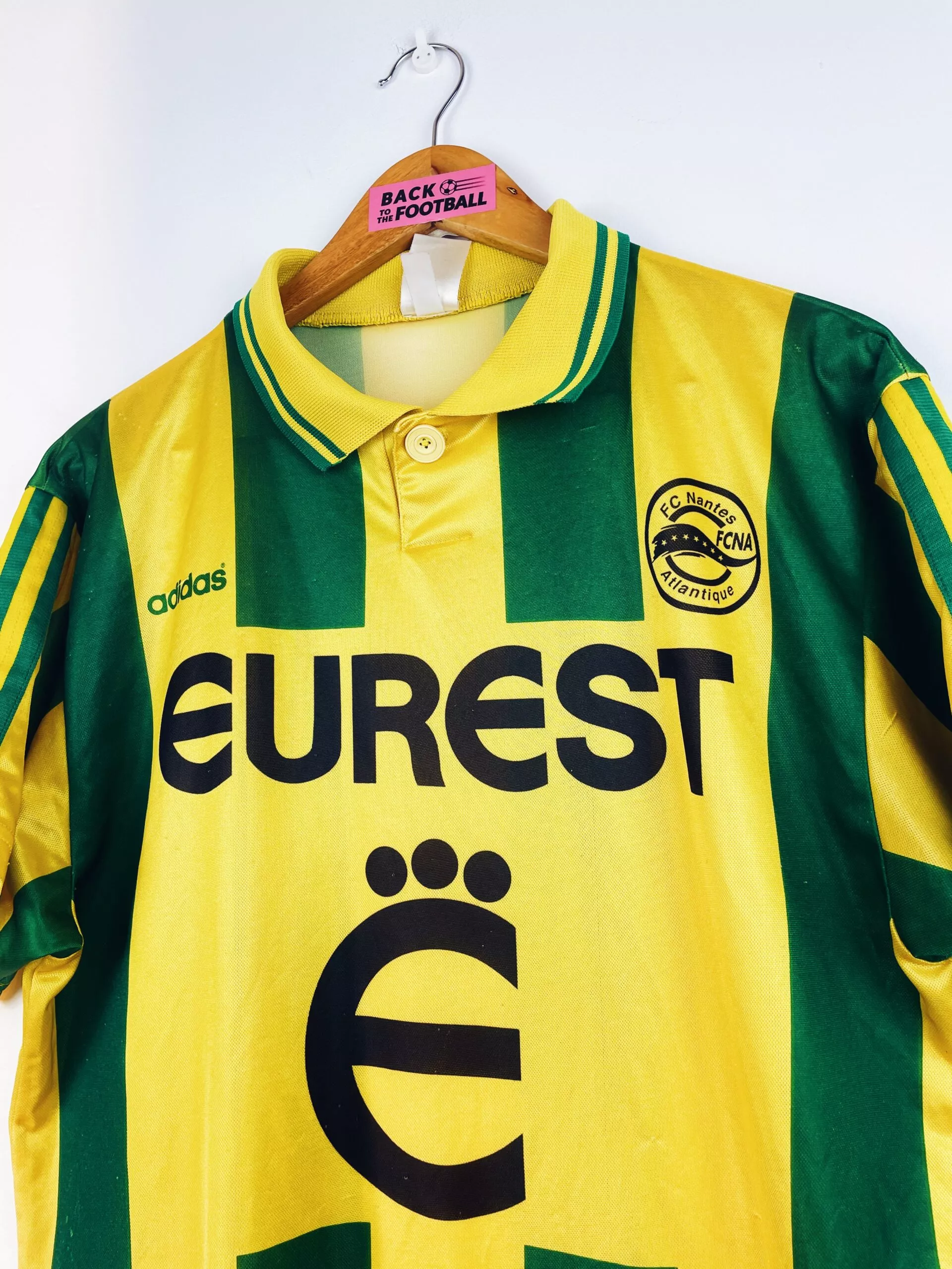Taille : M Si tu veux plus de détails, tu peux nous contacter par mail ou sur les réseaux 😉 Etat : 7/10, bon état général mais des bouloches et accros (voir photos) Le maillot : maillot vintage domicile de Nantes 1995/1996. L’écusson, le logo Adidas et le sponsor Eurest sont incrustés au maillot. Très beau maillot rétro du FC Nantes ! Histoire : champions de France en titre, les Canaris n’arrivent pas à garder leur titre avec une 7ème place en Division 1. En Coupes nationales, ils seront rapidement éliminés, à chaque fois aux tirs au but. Par contre,…
