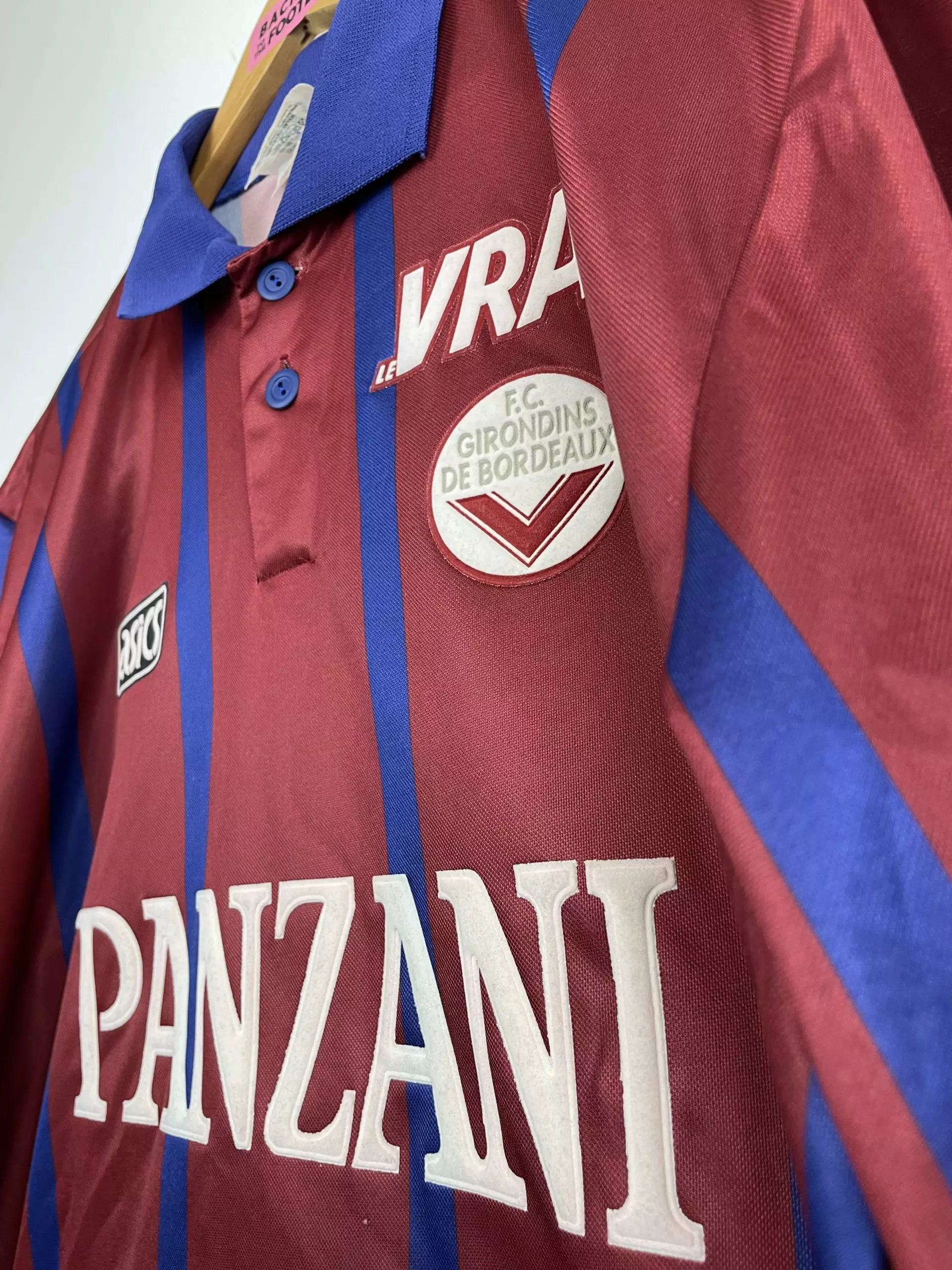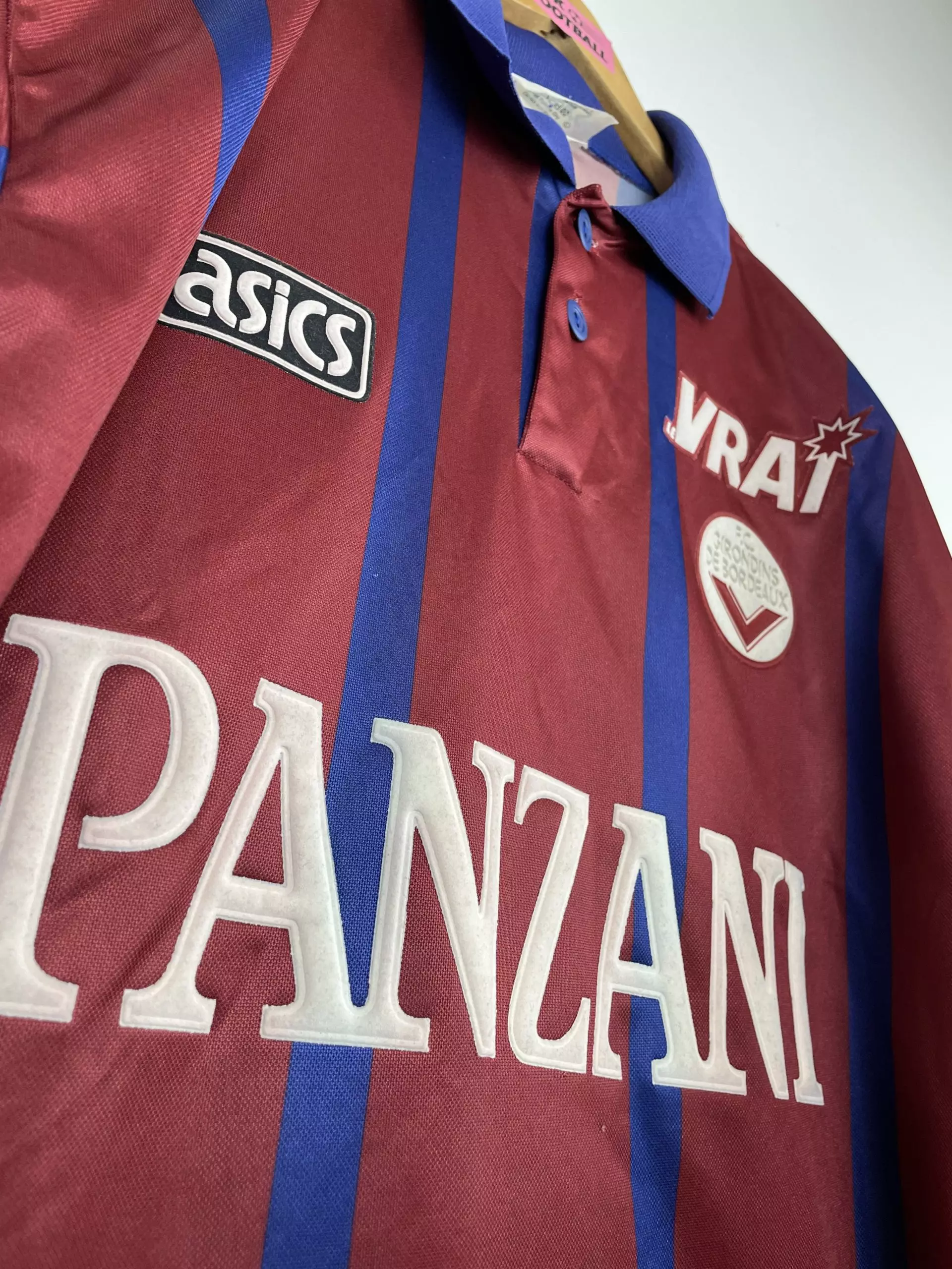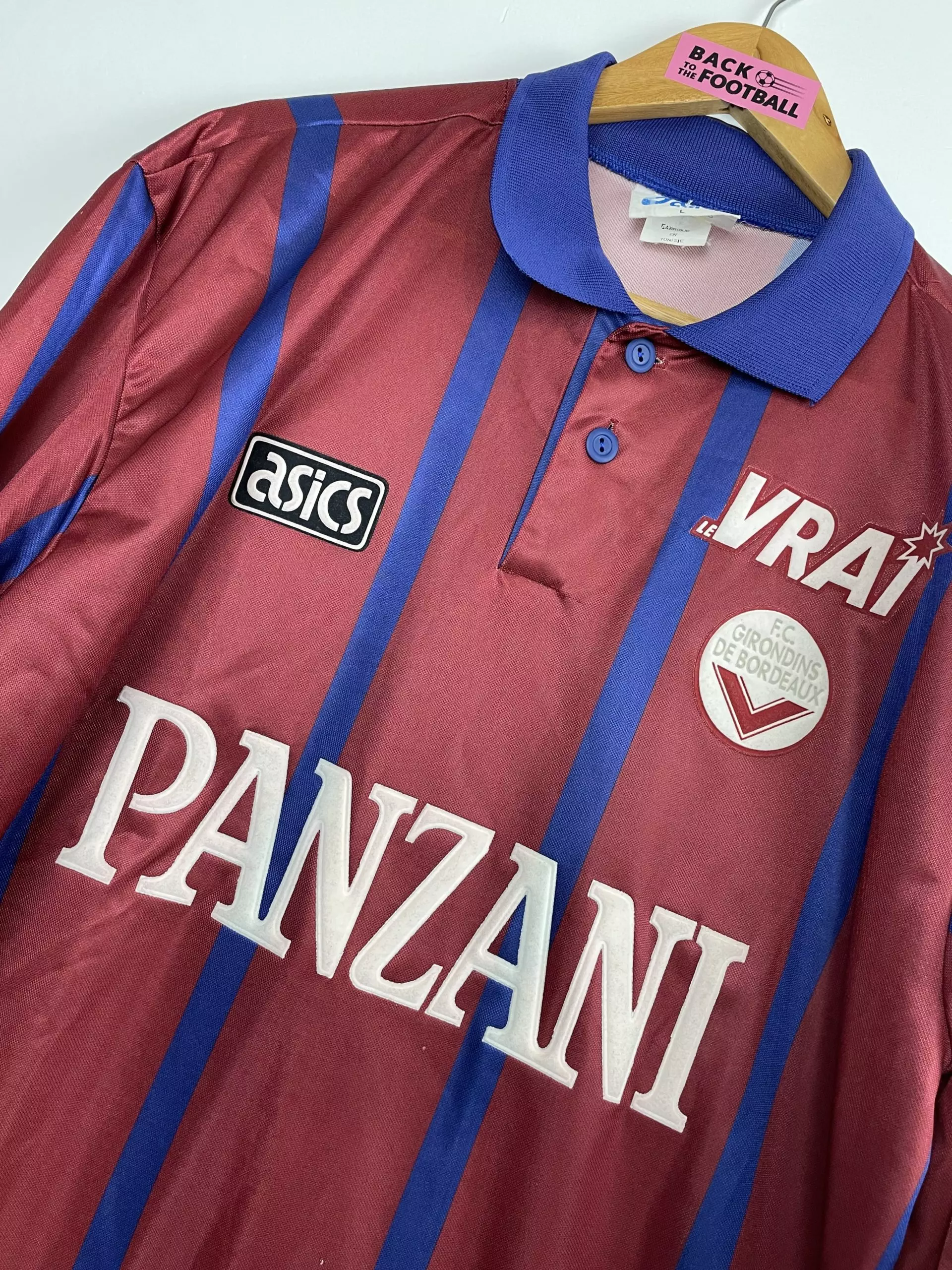 Taille : L Etat : 8/10 très bon état Le maillot : rare maillot vintage des Girondins de Bordeaux 1995/1996, époque Zidane, Lizarazu, Dugarry… L’ancien écusson des Girondins est en feutrine, le logo Asics et le sponsors Panzani et le Vrai aussi. Le maillot domicile abandonne le bleu marine pour le rouge bordeaux cette saison, avec les bandes en bleu marine. Une pépite ! Histoire : les Girondins montrent 2 visages cette saison avec une 16ème place en Ligue 1, à 4 point de la relégation. Par contre, Bordeaux fait une campagne de Coupe d’Europe énorme. Après avoir éliminé le…