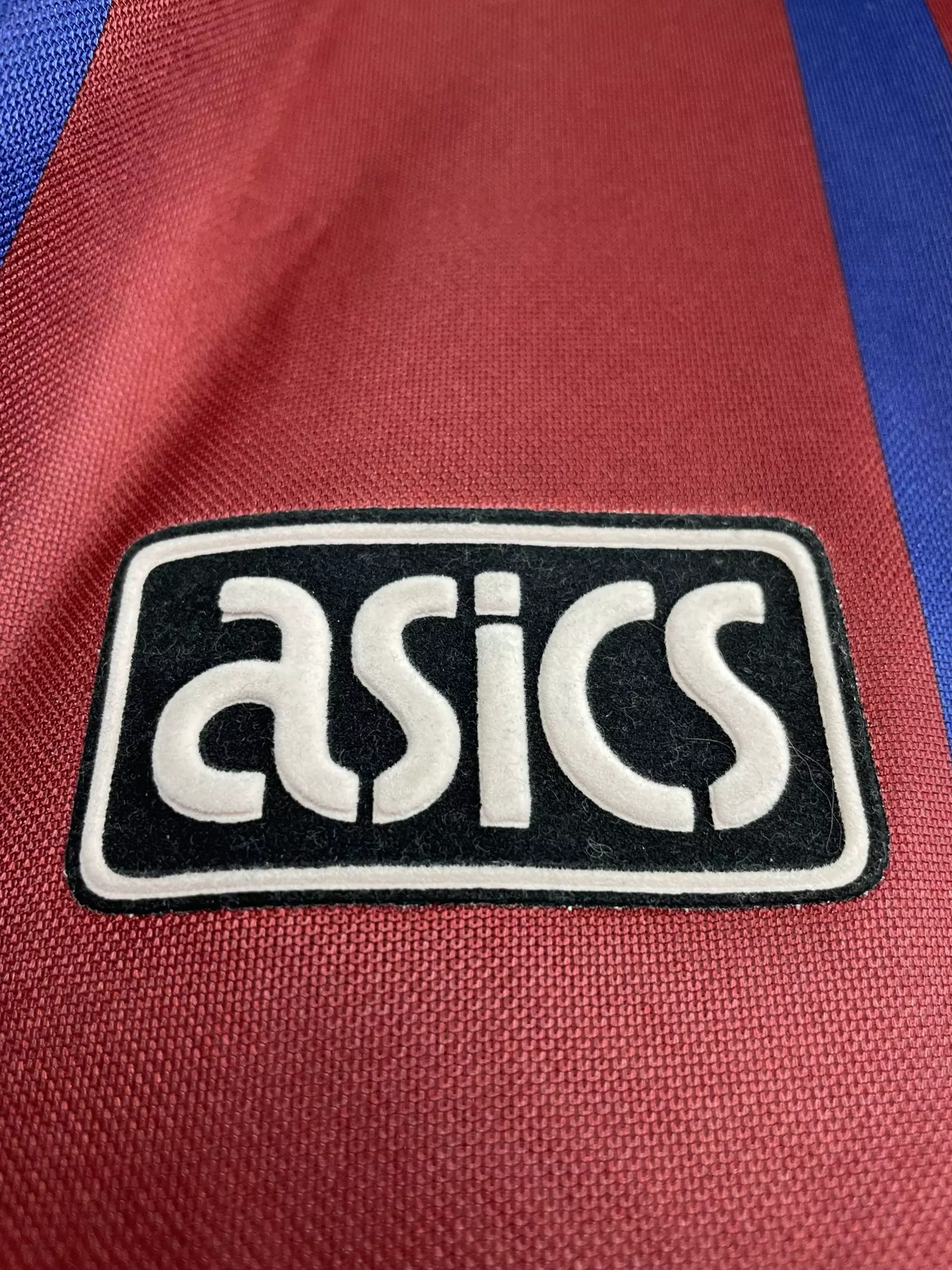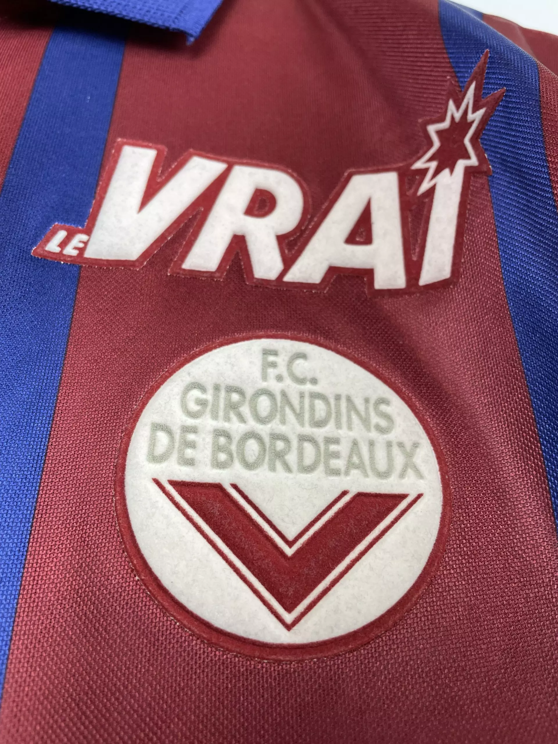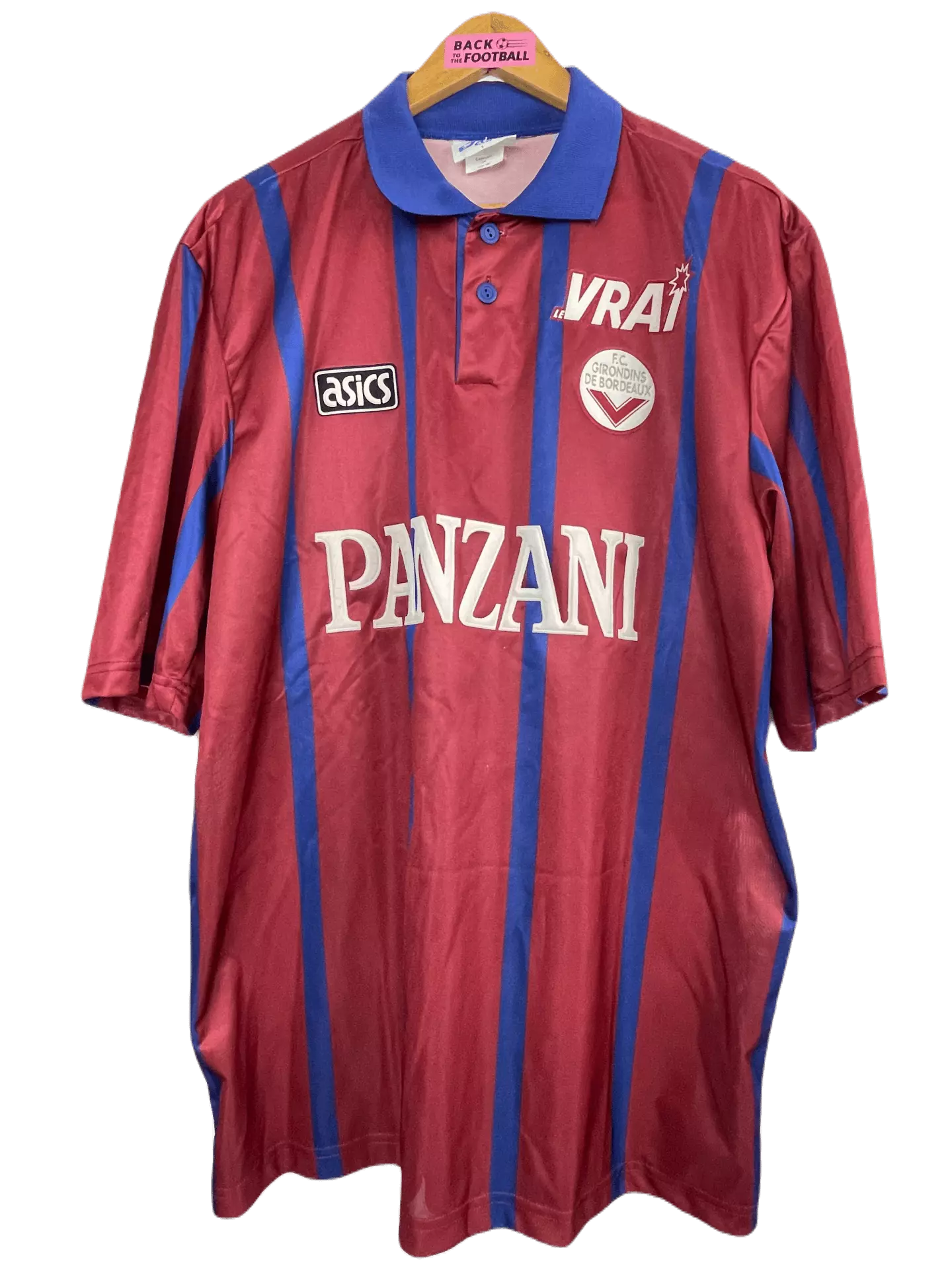 Taille : L Etat : 8/10 très bon état Le maillot : rare maillot vintage des Girondins de Bordeaux 1995/1996, époque Zidane, Lizarazu, Dugarry… L’ancien écusson des Girondins est en feutrine, le logo Asics et le sponsors Panzani et le Vrai aussi. Le maillot domicile abandonne le bleu marine pour le rouge bordeaux cette saison, avec les bandes en bleu marine. Une pépite ! Histoire : les Girondins montrent 2 visages cette saison avec une 16ème place en Ligue 1, à 4 point de la relégation. Par contre, Bordeaux fait une campagne de Coupe d’Europe énorme. Après avoir éliminé le…