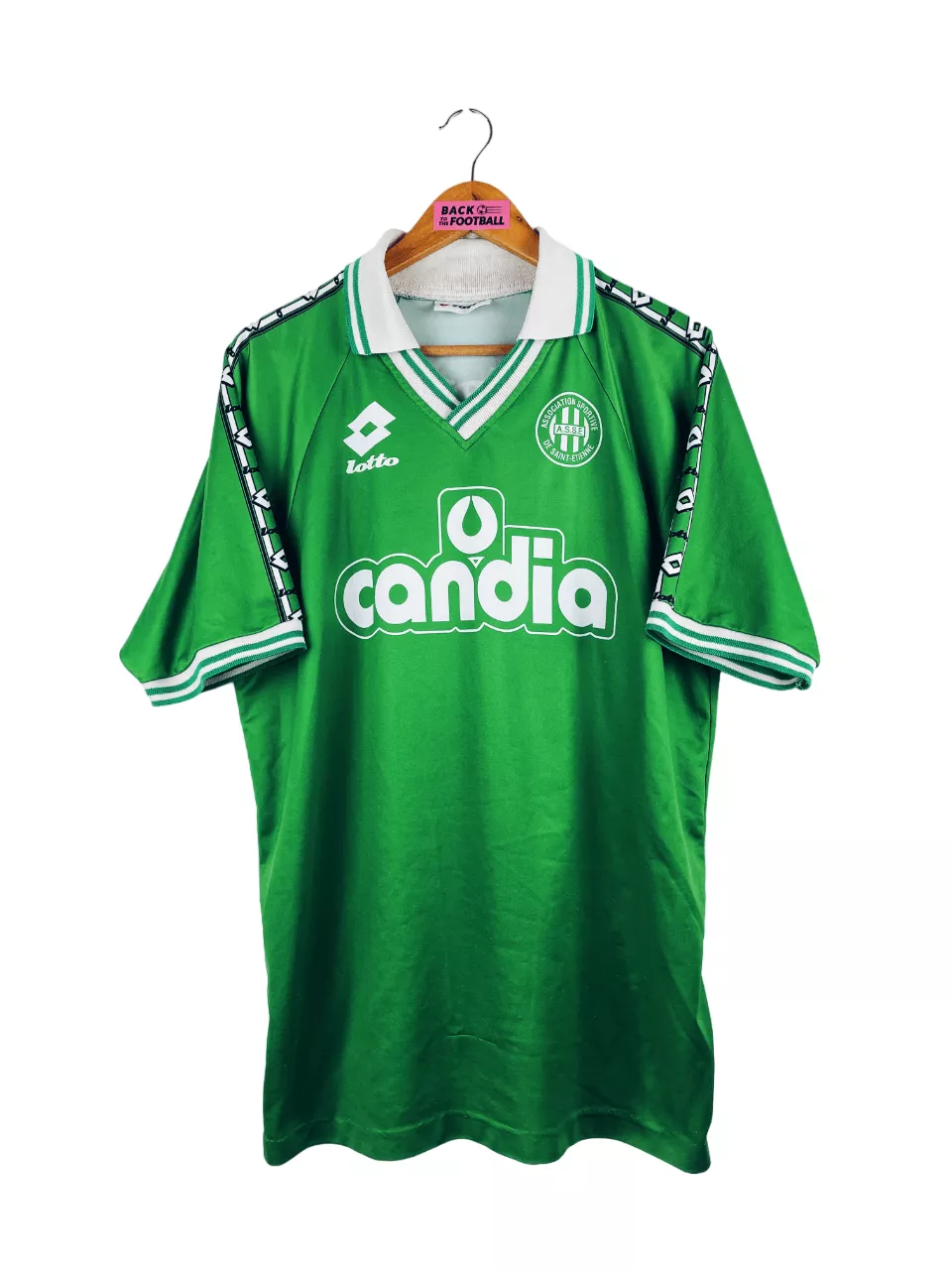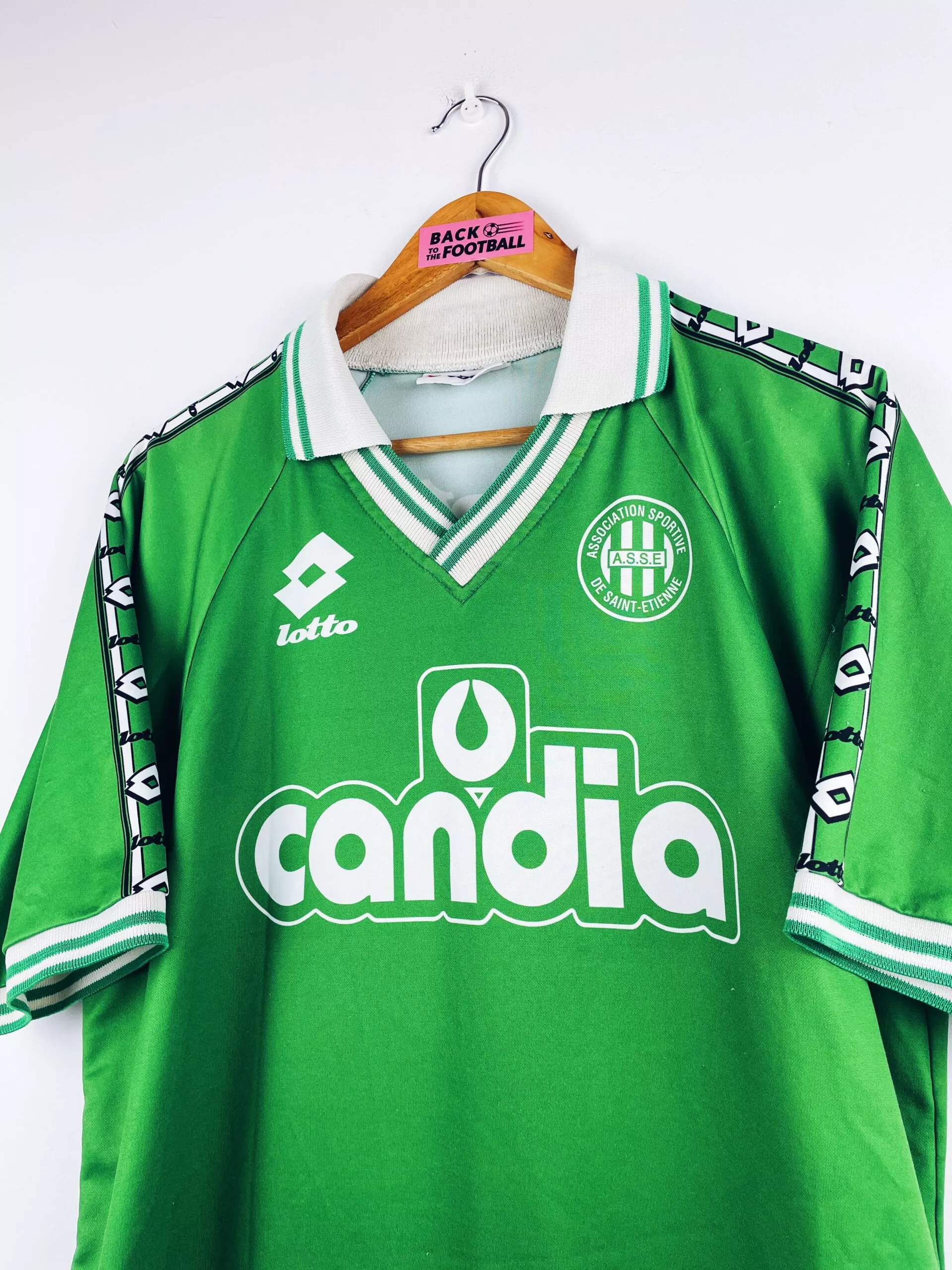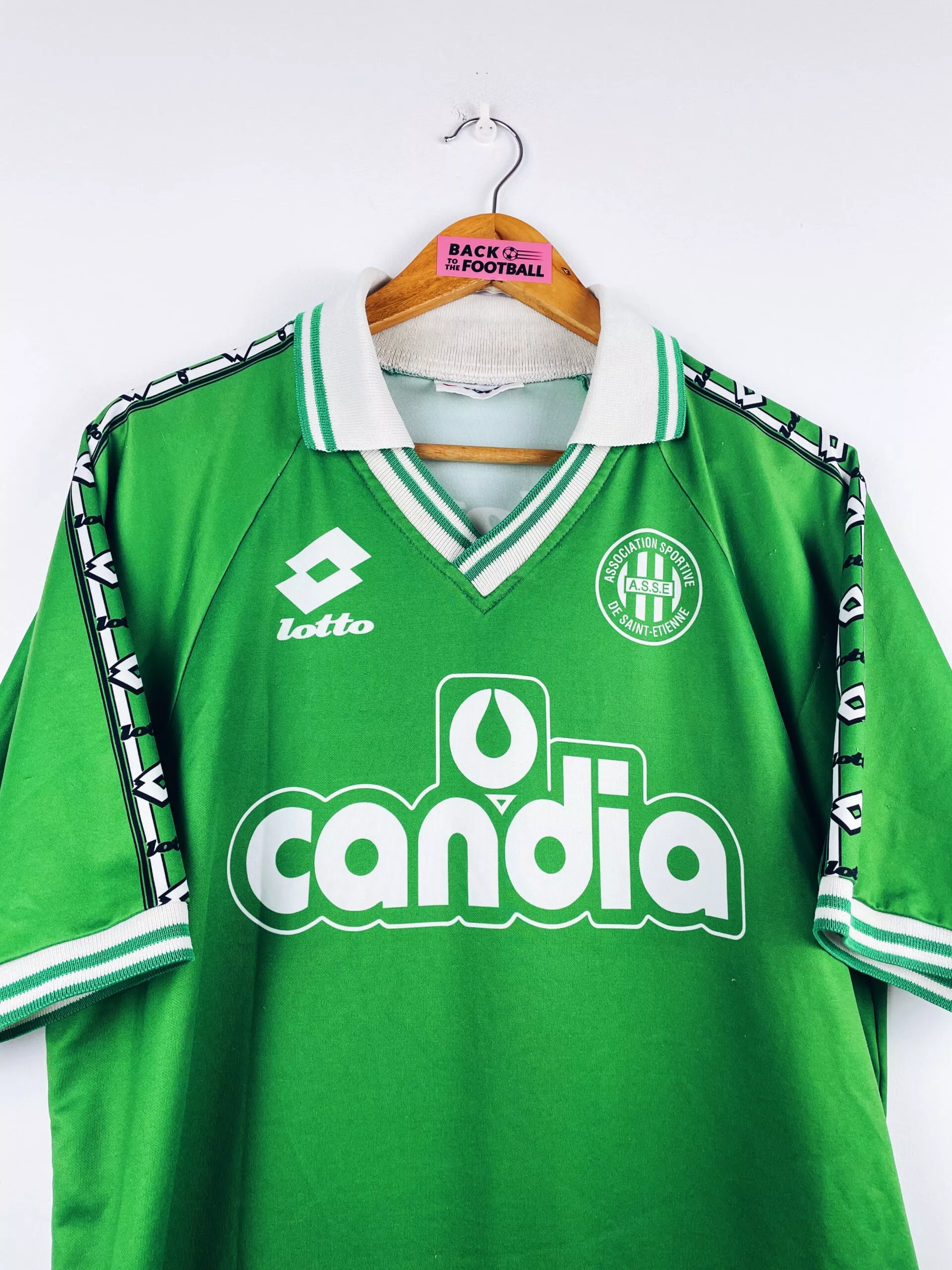 Taille : L Largeur : 54cm (aisselle à aisselle) Longueur : 74cm (base du col au bas) Si tu veux plus de détails, tu peux nous contacter par mail ou sur les réseaux 😉 Etat : 7.5/10, très bon état, bouloches en bas du maillot et un accroc (voir photos) Le maillot : maillot vintage domicile de l’AS Saint-Etienne 1995/1996 issu du stock pro (player issue) de la réserve. L’écusson, le logo Lotto et le sponsor Candia sont incrustés directement au maillot. Le numéro 16 au dos aussi. Très beau maillot rétro de Saint-Etienne ! Histoire : La réserve de…
