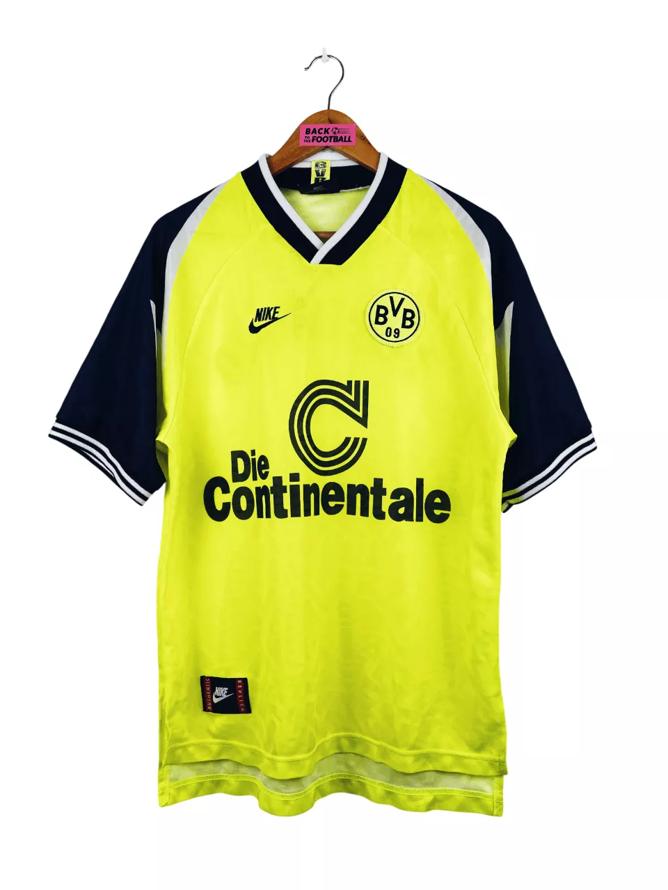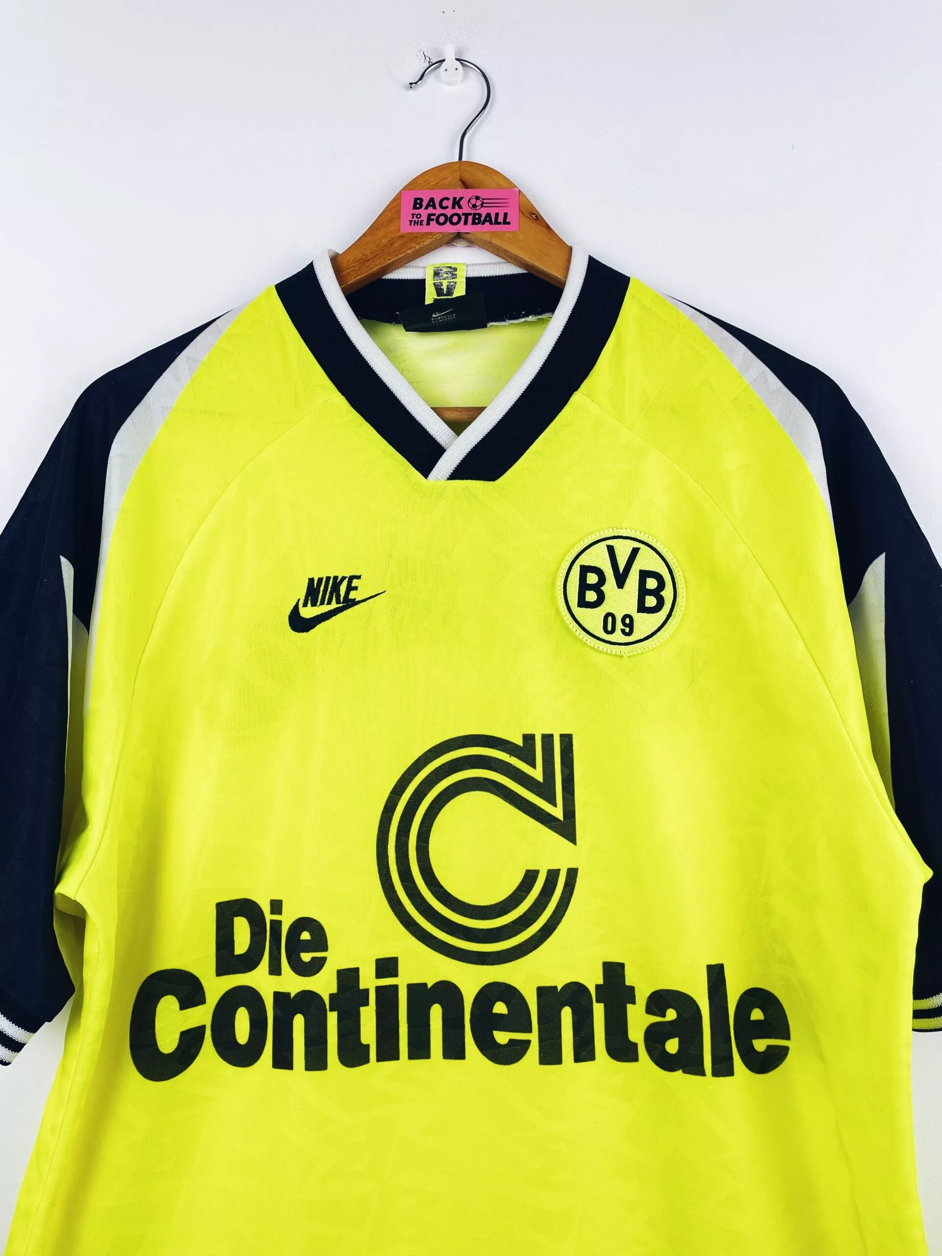 Taille : M Largeur : 52cm (aisselle à aisselle) Longueur : 70cm (base du col au bas) Si tu veux plus d’infos, tu peux nous contacter par mail ou sur les réseaux 😉 Etat : 8/10, très bon état général, une pince à l’arrière de l’épaule, 2 minis traces dans le dos, quelques bouloches (voir photos) Le maillot : maillot vintage domicile du Borussia Dortmund 1995/1996. L’écusson du Borussia est brodé, comme le logo Nike. Le sponsor iconique Die Continale est incrusté. Très beau maillot rétro du Borussia Dortmund ! Histoire : le BVB sera sacré champion de Bundesliga, devant…