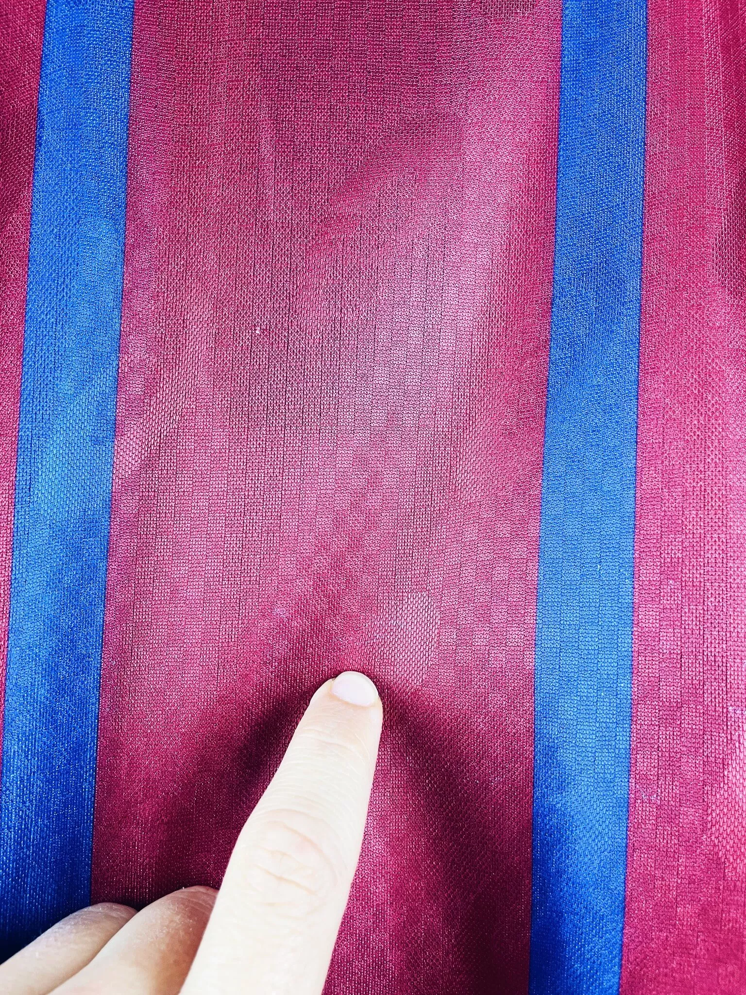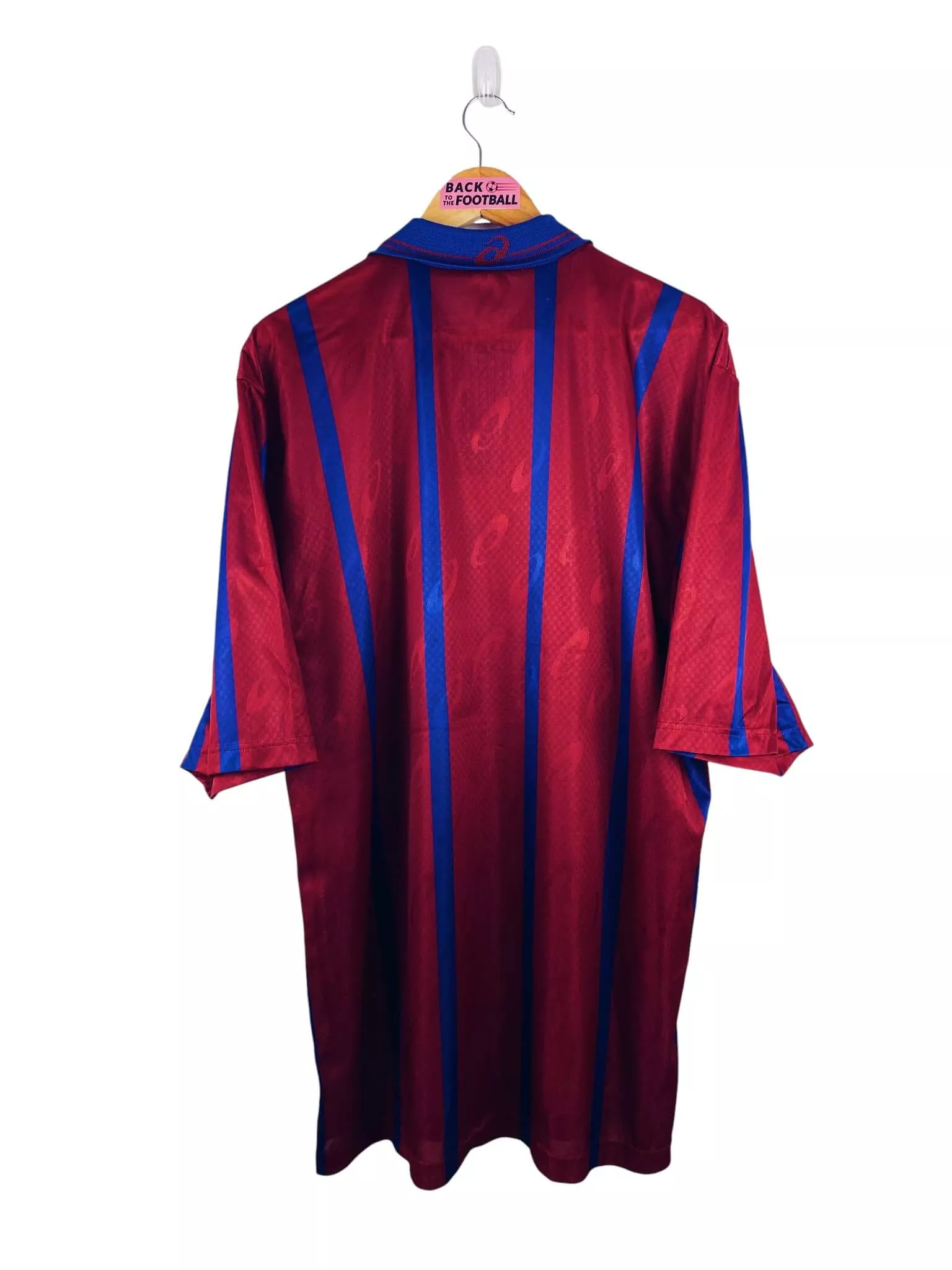 Taille : XL – taille large Largeur : 62cm (aisselle à aisselle) Longueur : 82cm (base du col au bas) Si tu veux plus de détails, tu peux nous contacter par mail ou sur les réseaux 😉 Etat : 9/10, excellent état, minis traces dans le dos, quasi invisibles (voir photo) Le maillot : maillot vintage domicile des Girondins de Bordeaux 1995/1996. L’écusson, le logo Asics, les sponsors Alain Afflelou sont en feutrine. On peut voir le logo Asics en tramé. Quel maillot rétro des Girondins ! Histoire : les Girondins montrent 2 visages cette saison avec une 16ème place…