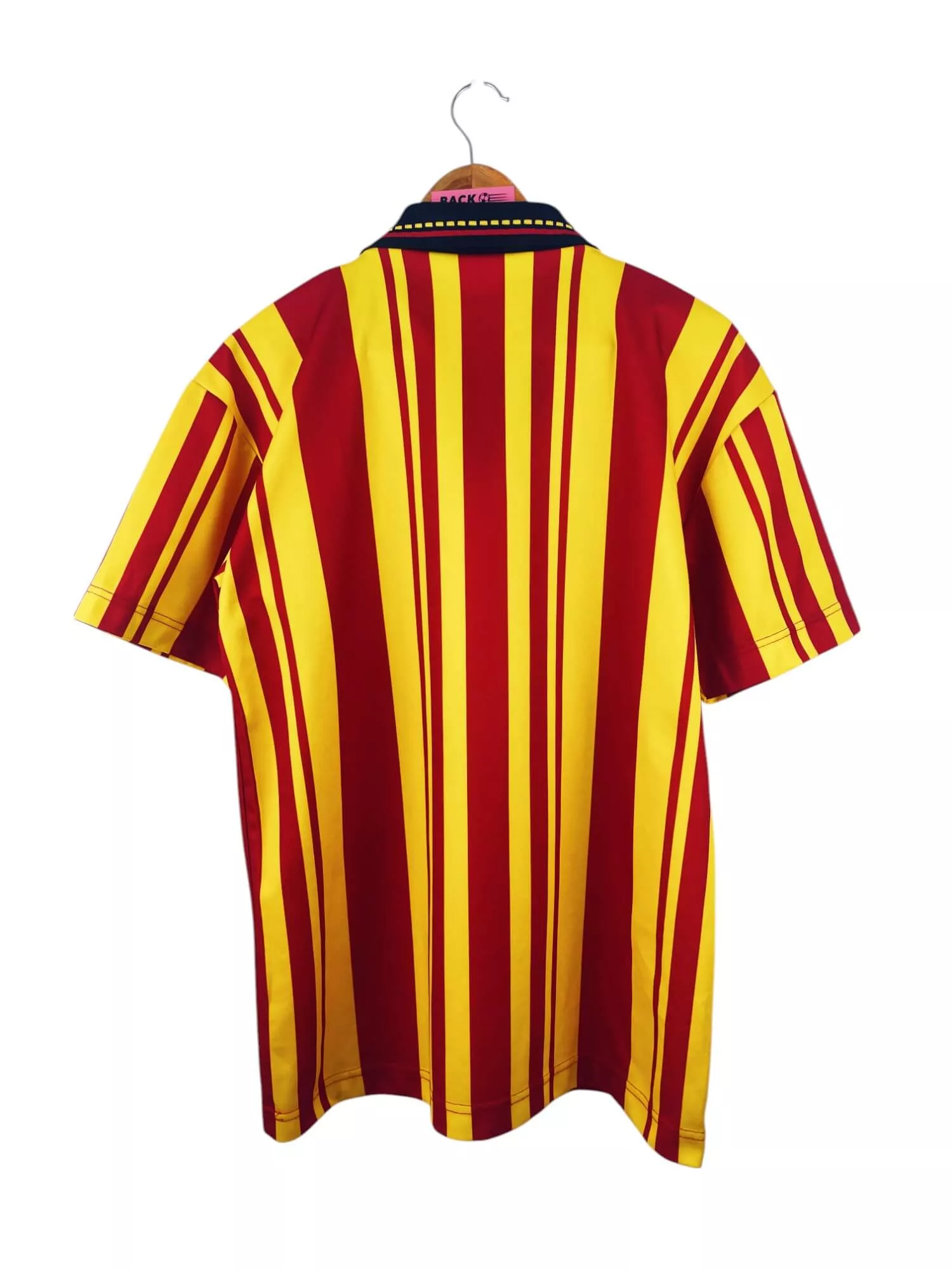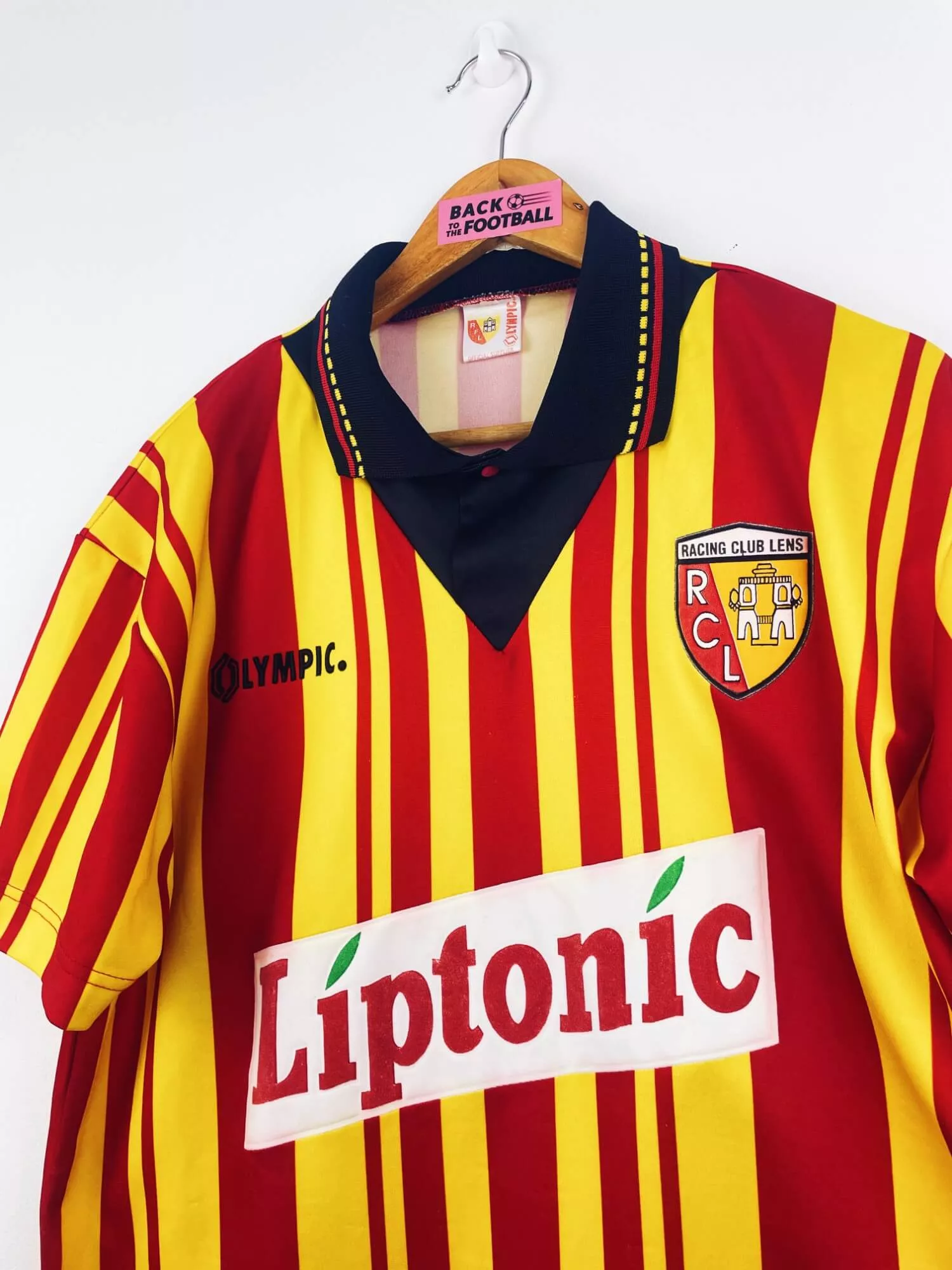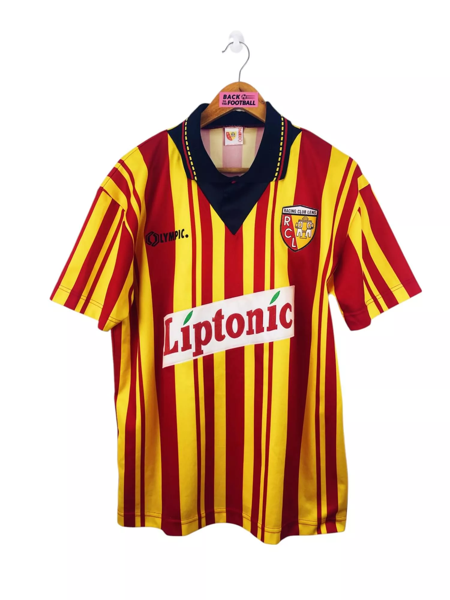 Taille : M Largeur : 52cm (aisselle à aisselle) Longueur : 70cm (base du col au bas) Si tu veux plus de détails, tu peux nous contacter par mail ou sur les réseaux 😉 Etat : 9/10, excellent état Le maillot : maillot vintage Coupe UEFA du RC Lens 1995/1996. L’écusson, le logo Olympic et le sponsor Liptonic sont en feutrine. Très beau maillot rétro du RC Lens ! Histoire : belle saison des Sang et Or qui terminent à la 5ème place du championnat. En Coupe UEFA, ils passent les 2 premiers tours mais sont éliminés lors du 3ème…