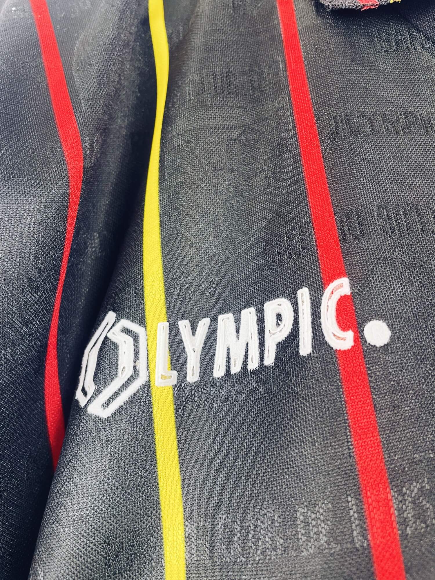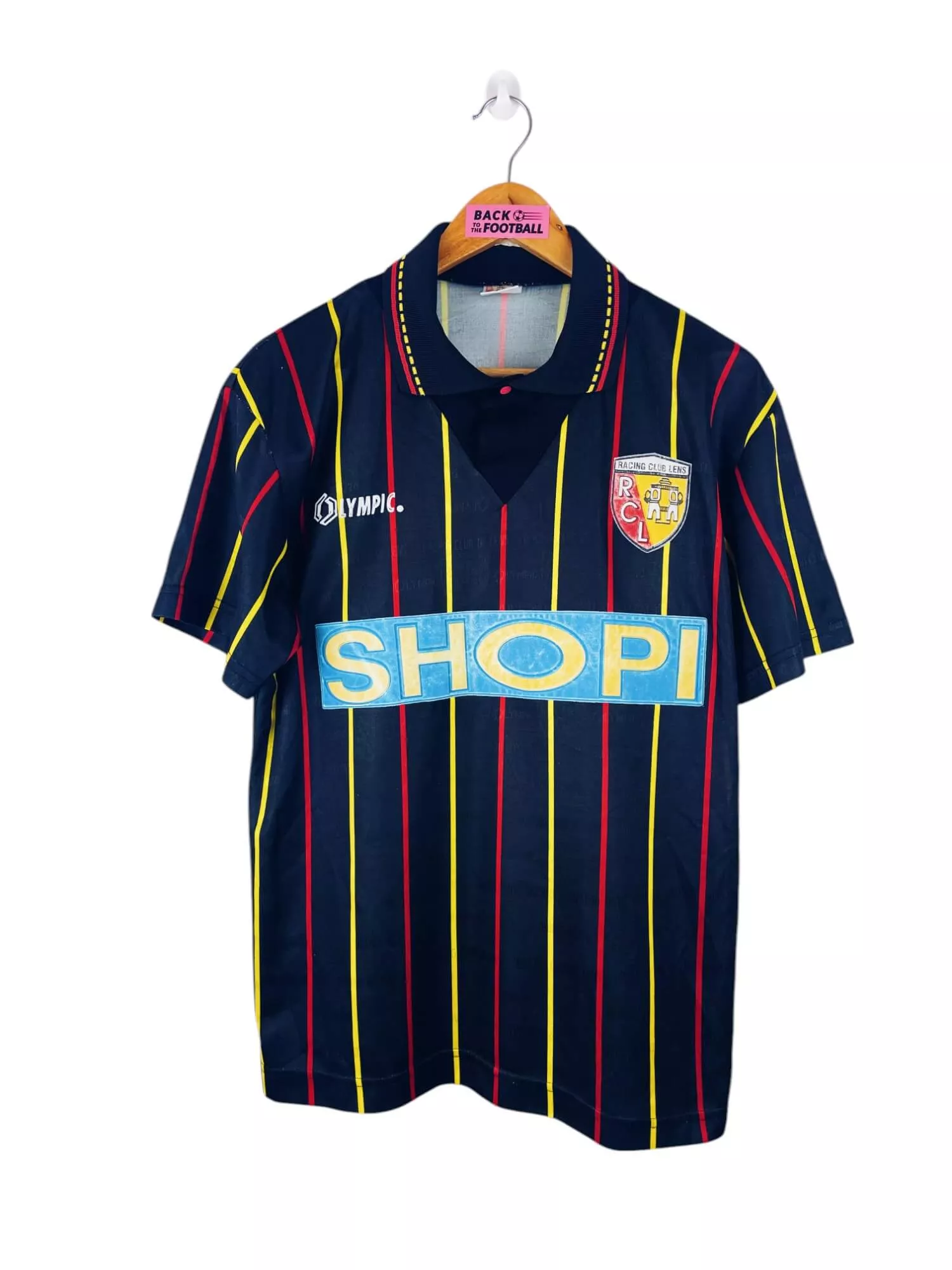 Taille : M Largeur : 50cm (aisselle à aisselle) Longueur : 69cm (base du col au bas) Si tu veux plus de détails, tu peux nous contacter par mail ou sur les réseaux 😉 Etat : 8/10, très bon état général. A noter : feutrine Olympic abimée, feutrine moins brillante sur l’écusson et le sponsor, quelques bouloches (voir photos) Le maillot : maillot vintage extérieur du RC Lens 1995/1996. L’écusson, le logo Olympic et le sponsor Shopi sont en feutrine. Très beau maillot rétro du RC Lens ! Histoire : belle saison des Sang et Or qui terminent à la…