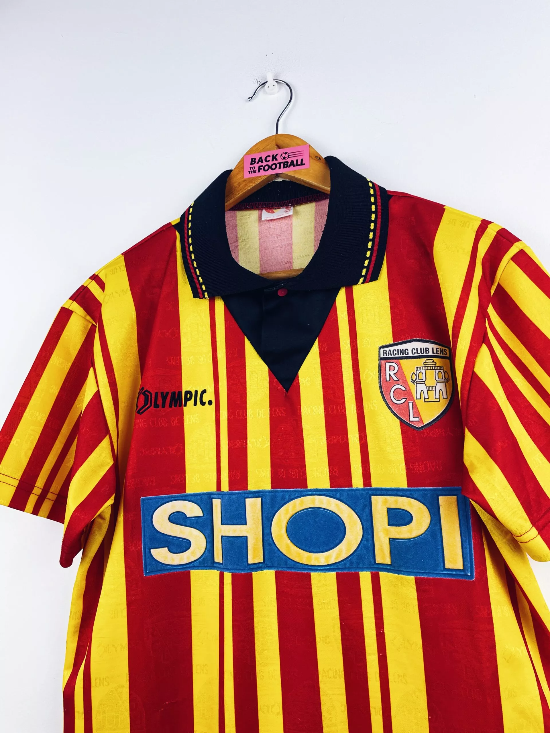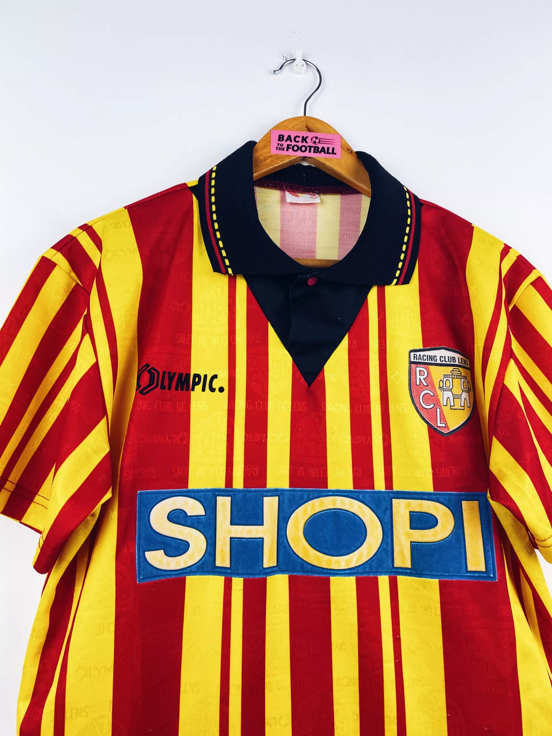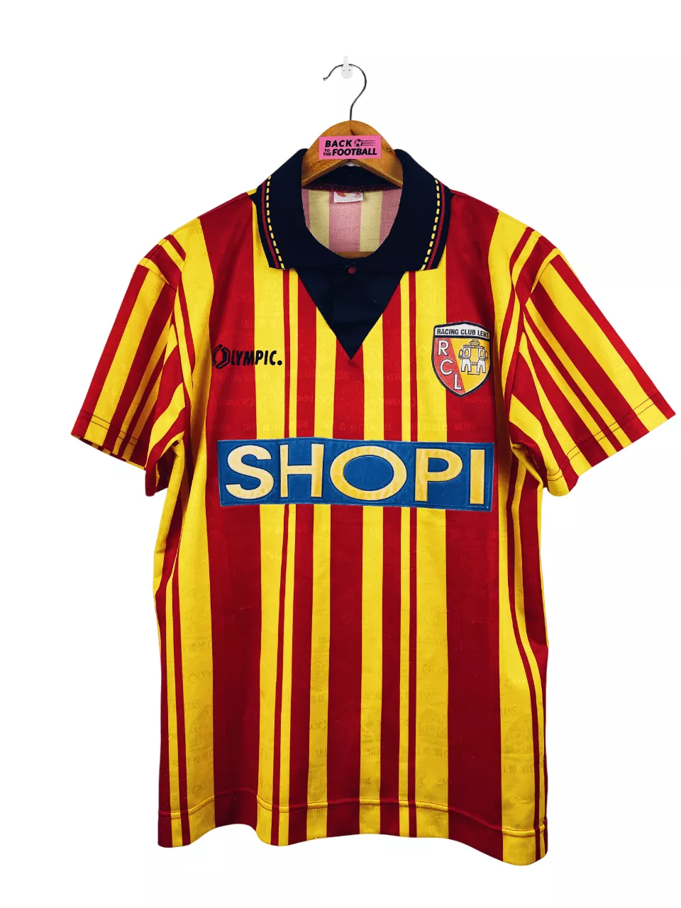 Taille : S Si tu veux plus de détails, tu peux nous contacter par mail ou sur les réseaux 😉 Etat : 8/10, très bon état, quelques bouloches, mini trace sur la manche (voir photos) Le maillot : maillot vintage domicile du RC Lens 1995/1996. L’écusson, logo Olympic et le sponsor Shopi sont en feutrine. Très beau maillot rétro du RC Lens ! Histoire : belle saison des Sang et Or qui terminent à la 5ème place du championnat. En Coupe UEFA, ils passent les 2 premiers tours mais sont éliminés lors du 3ème tour face au Slavia Prague. Ils…