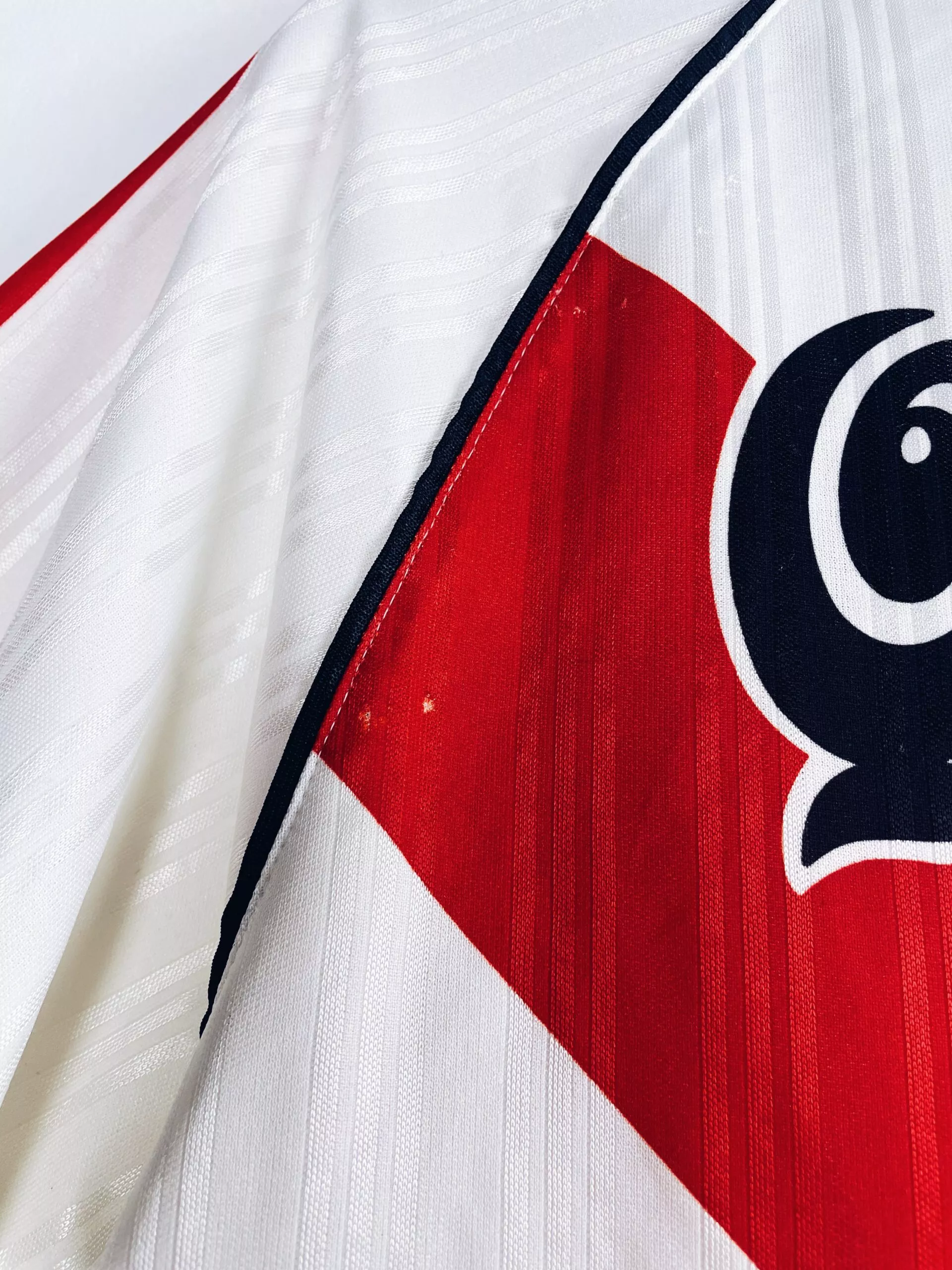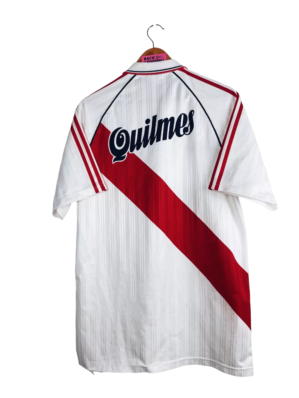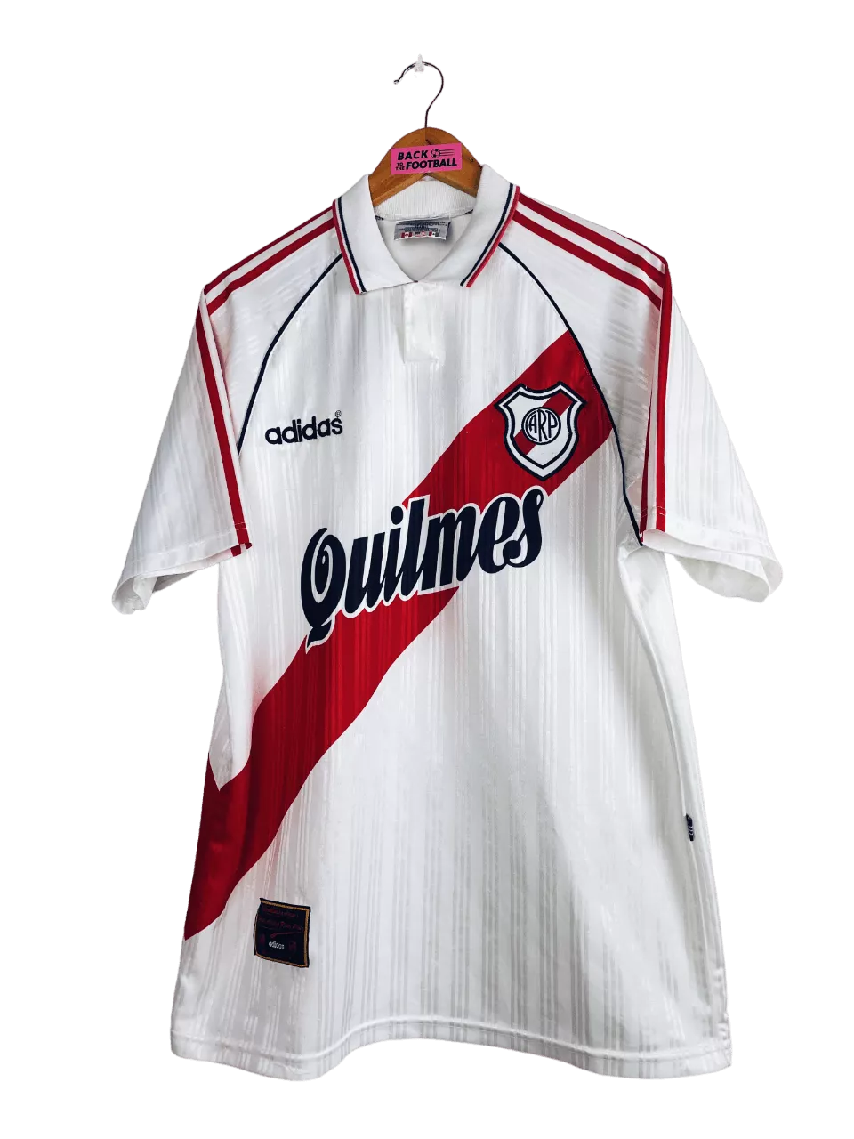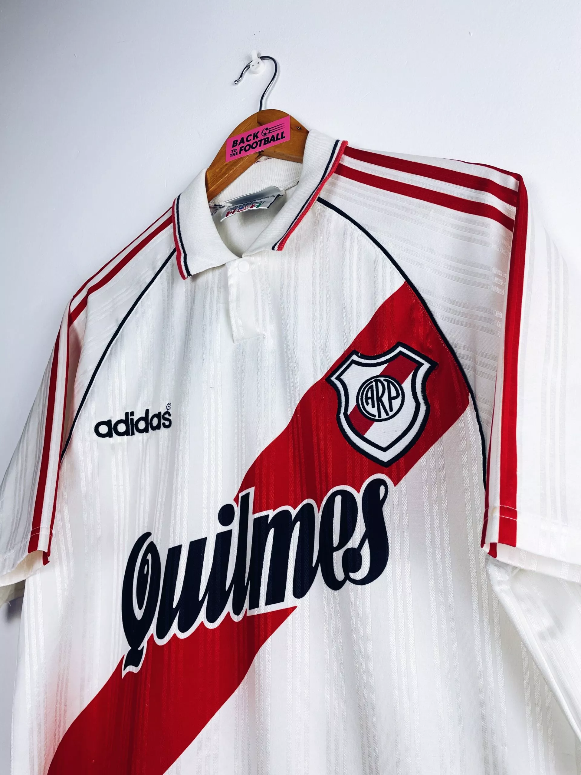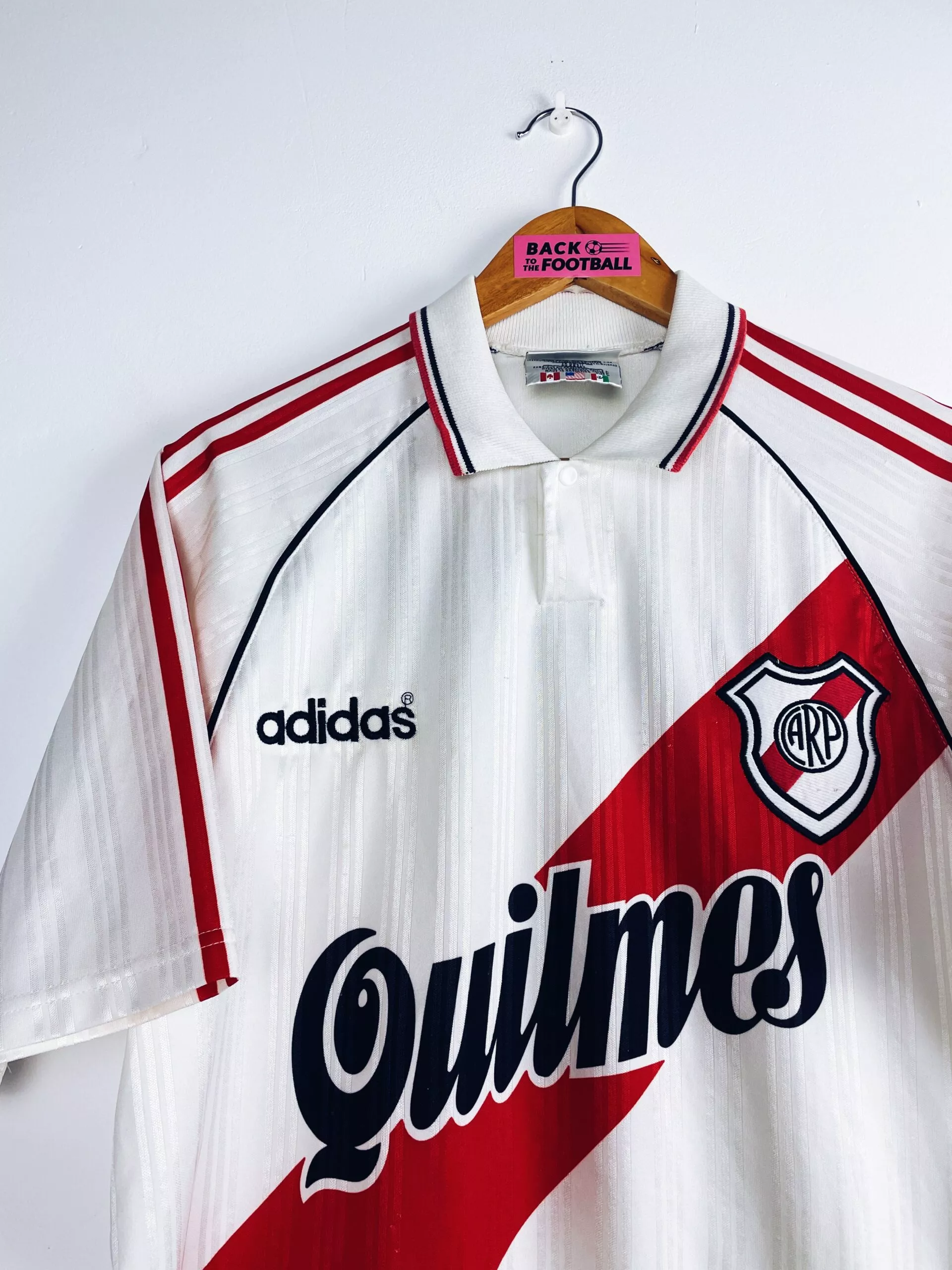 Taille : L Etat : 8/10, très bon état hormis quelques très légers accros dans le dos (voir photo) Le maillot : maillot vintage domicile de River Plate 1995/1996. L’écusson et le logo Adidas sont brodés, le sponsor Quilmes est incrusté au maillot. On peut voir des bandes verticales en tramé sur tout le maillot. Très beau maillot rétro de River Plate ! Histoire : les joueurs de River Plate termineront 7èmes et 14èmes des tournois d’ouverture et fermeture de la première division argentine. Ils iront jusqu’en demi finale de Copa Libertadores 1995 mais seront éliminés aux tirs au but…
