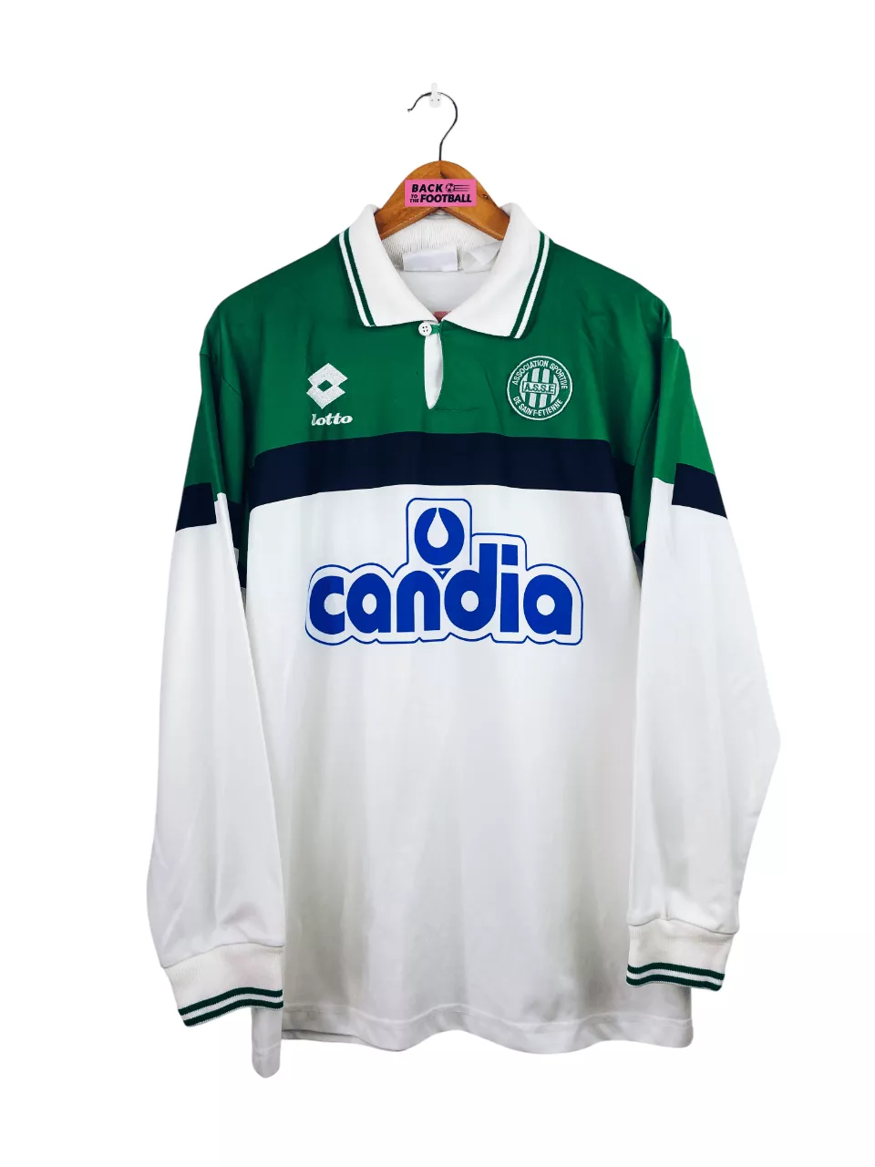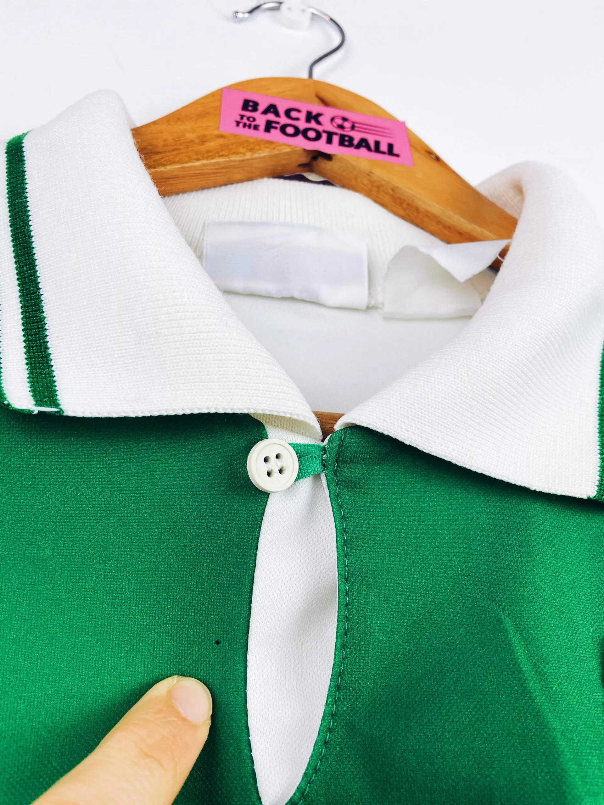 Taille : L/XL Largeur : 54cm (aisselle à aisselle) Longueur : 73cm (base du col au bas) Si tu veux plus de détails, tu peux nous contacter par mail ou sur les réseaux 😉 Etat : 8/10, excellent état hormis un petit point au niveau du col et de légères traces à l’arrière du col (voir photos) Le maillot : maillot vintage domicile de l’AS Saint-Etienne 1995/1997 manches longues issu du stock pro (player issue) : sponsors Candia et Despinasse. L’écusson et le logo Lotto sont brodés. Les sponsors et le numéro 9 sont incrustés. Très beau maillot rétro de…