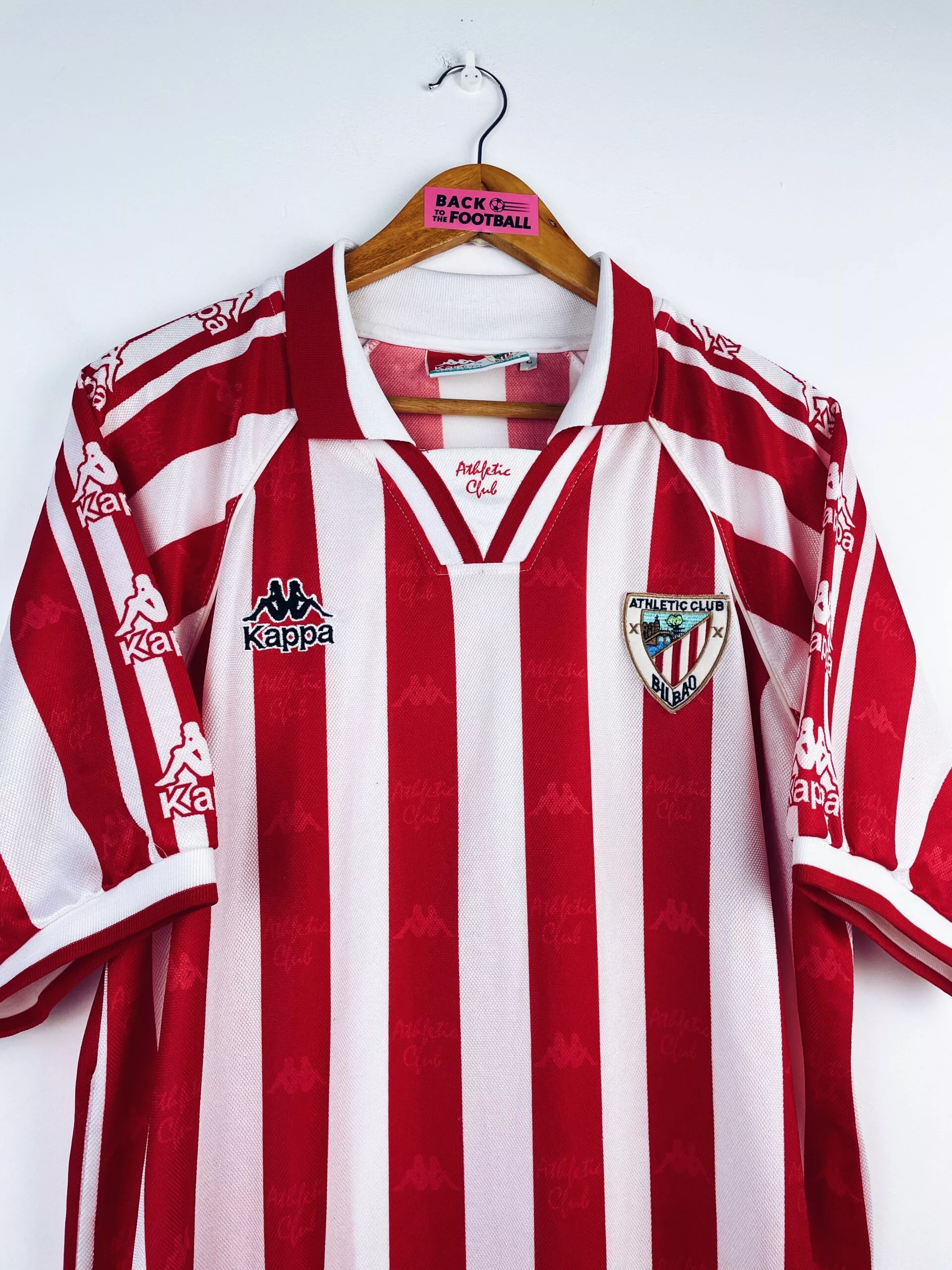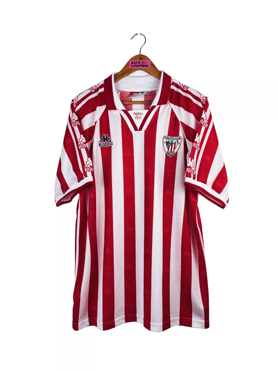 Taille : L Si tu veux plus d’infos, tu peux nous contacter par mail ou sur les réseaux 😉 Etat : 8/10, très bon état Le maillot : maillot vintage domicile de l’Athletic Bilbao 1995/1997. L’écusson et le logo Kappa sont brodés. Les logos Kappa sur les manches sont incrustés. On peut voir en tramé l’écusson et le logo Kappa sur tout le maillot. Très beau maillot rétro de l’Athletic Bilbao ! Histoire : la première saison, les basques terminent à la 15ème place de Liga, 4 points devant le premier relégable. Ils seront éliminés en seizièmes de finale de…