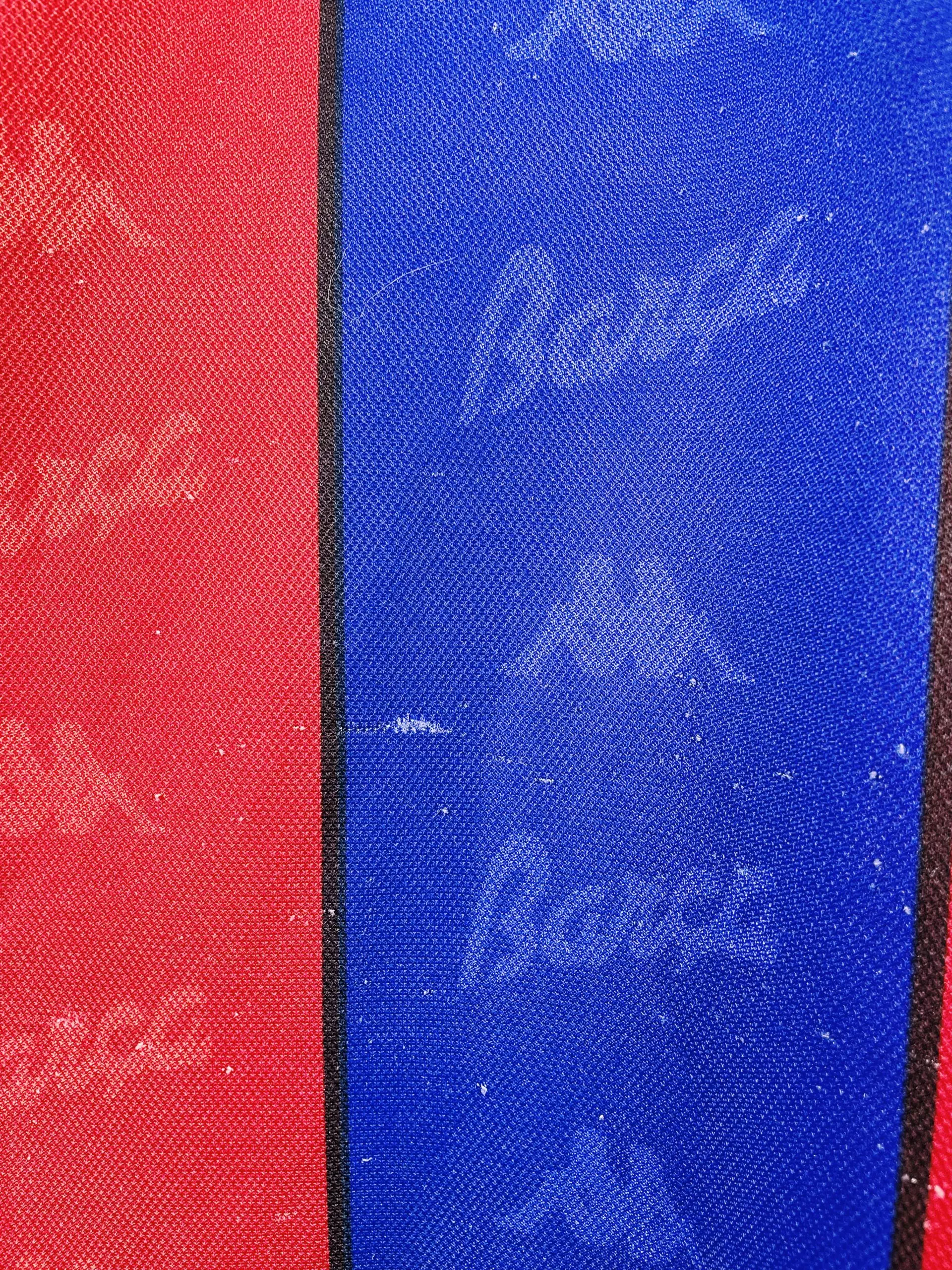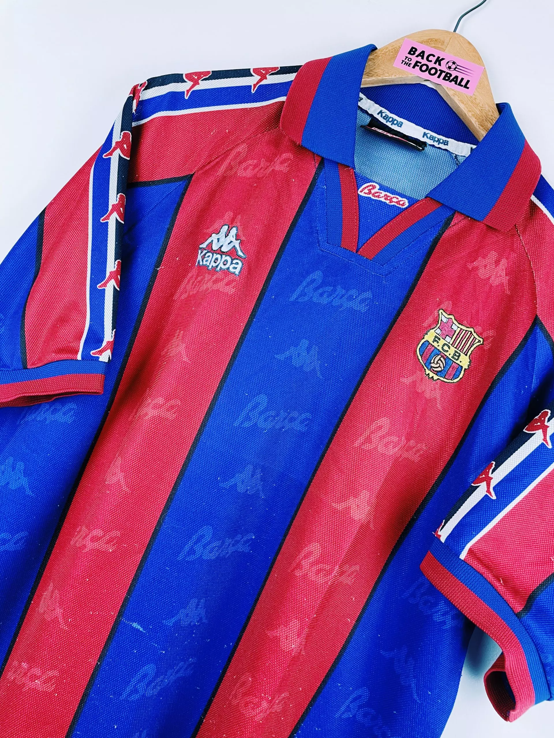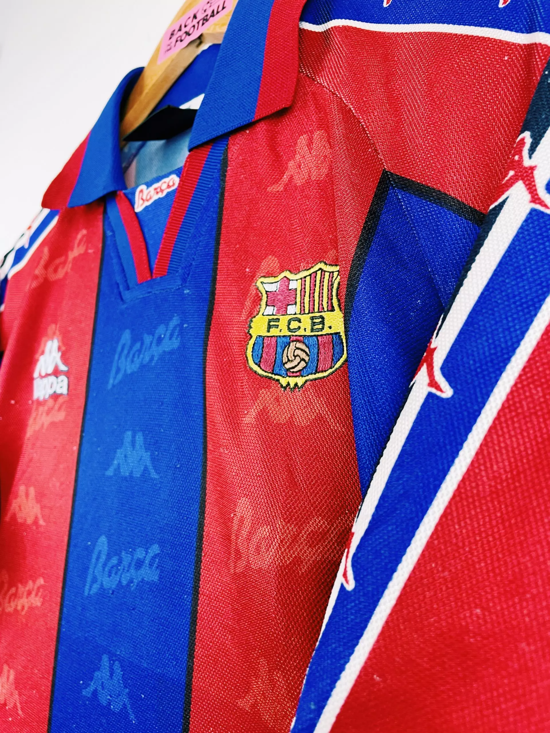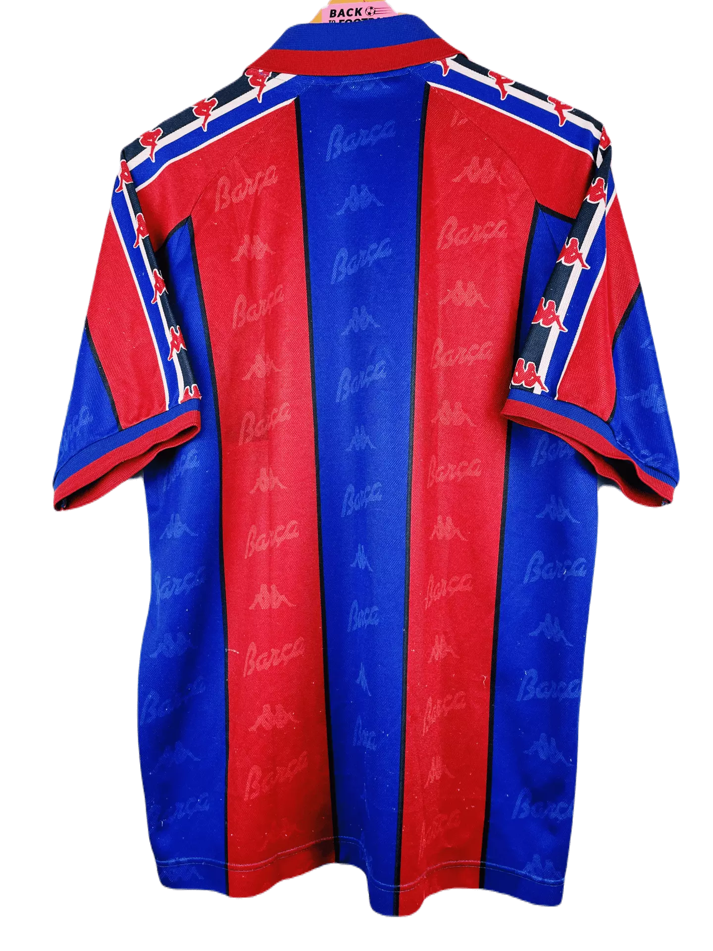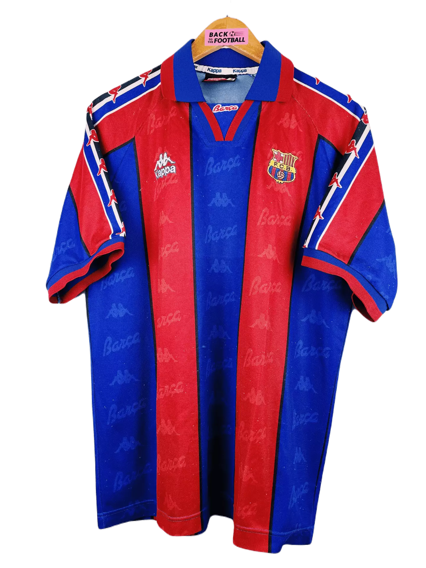 Taille : L Etat : il y a beaucoup de petites bouloches, un accroc et une légère trace noire dans le dos (voir photos). D’où le petit prix Le maillot : magnifique maillot vintage domicile Kappa du FC Barcelone saisons 1995/1997. Le maillot reprend les couleurs classiques du club. L’écusson et le logo Kappa sont brodés. Les manches Kappa sont superbes. Et on peut voir en tramé sur tout le maillot le logo de l’équipementier. Histoire : dernière saison sur le banc pour Johan Cruyff, la première saison. Les Blaugrana finiront sur le podium de Liga, derrière l’Atlético et Valence.…