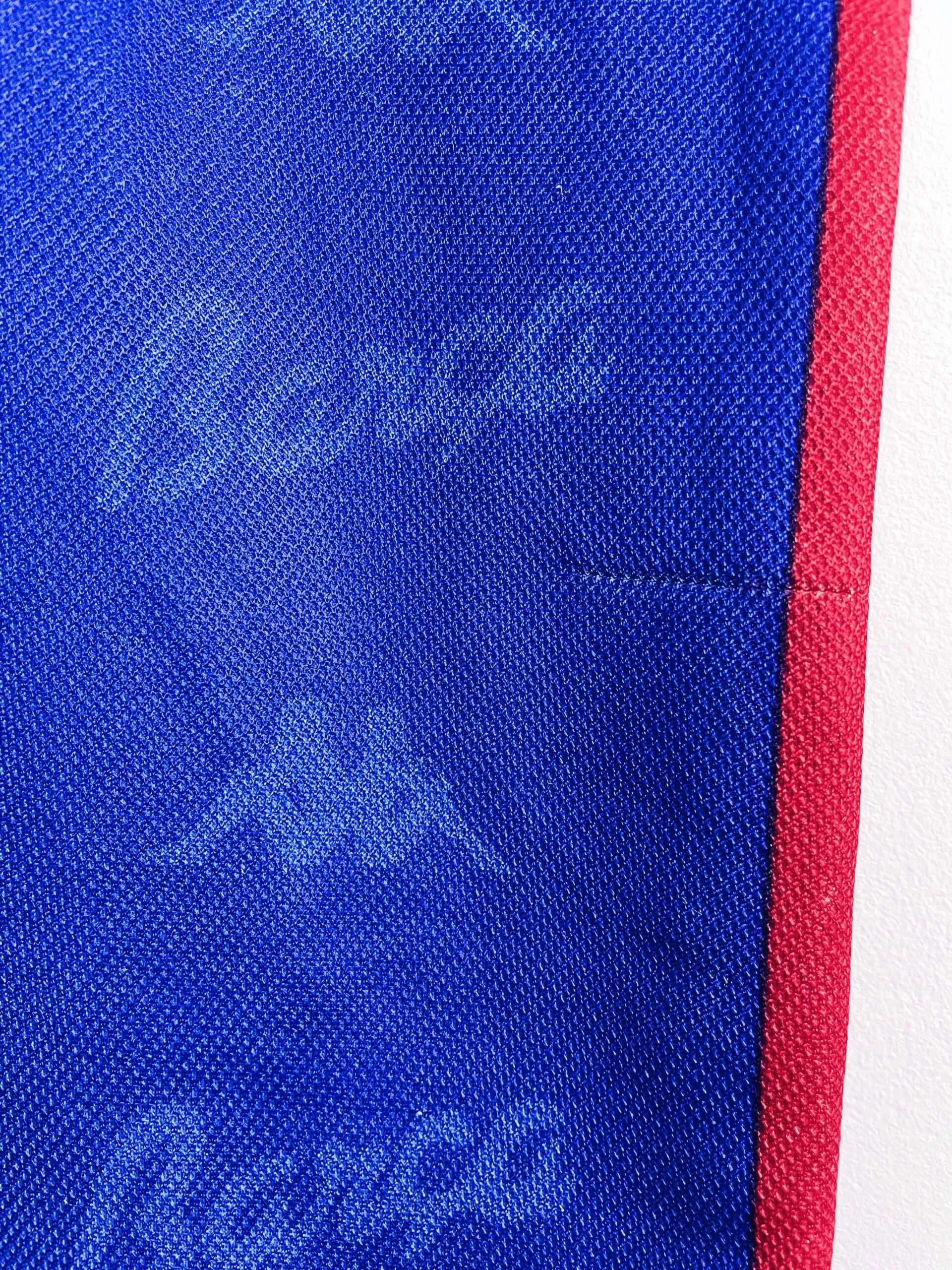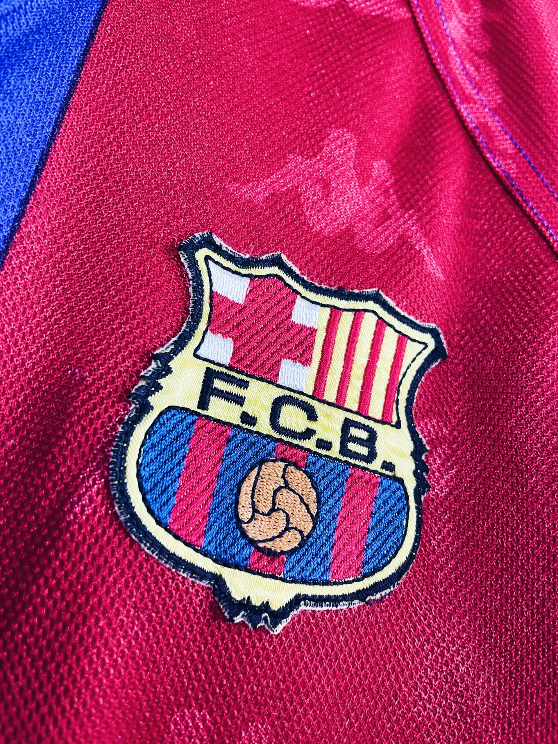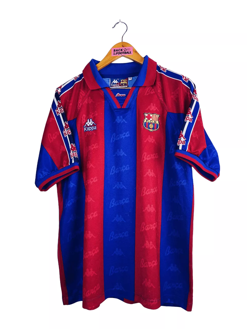 Taille : M Si tu veux plus d’infos, tu peux nous contacter par mail ou sur les réseaux 😉 Etat : 8/10, très bon état mais des bouloches et un accro sont à noter (voir photos) Le maillot : maillot vintage domicile du FC Barcelone 1995/1997. Le maillot reprend les couleurs classiques du club. L’écusson et le logo Kappa sont brodés. Les manches Kappa sont superbes. Et on peut voir en tramé sur tout le maillot le logo de l’équipementier. Très beau maillot rétro de Barcelone ! Histoire : dernière saison sur le banc pour Johan Cruyff, la première saison.…