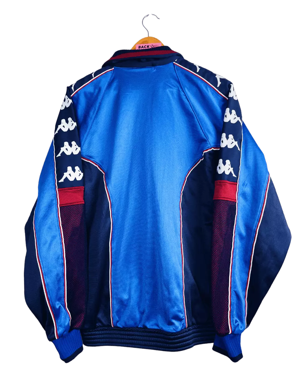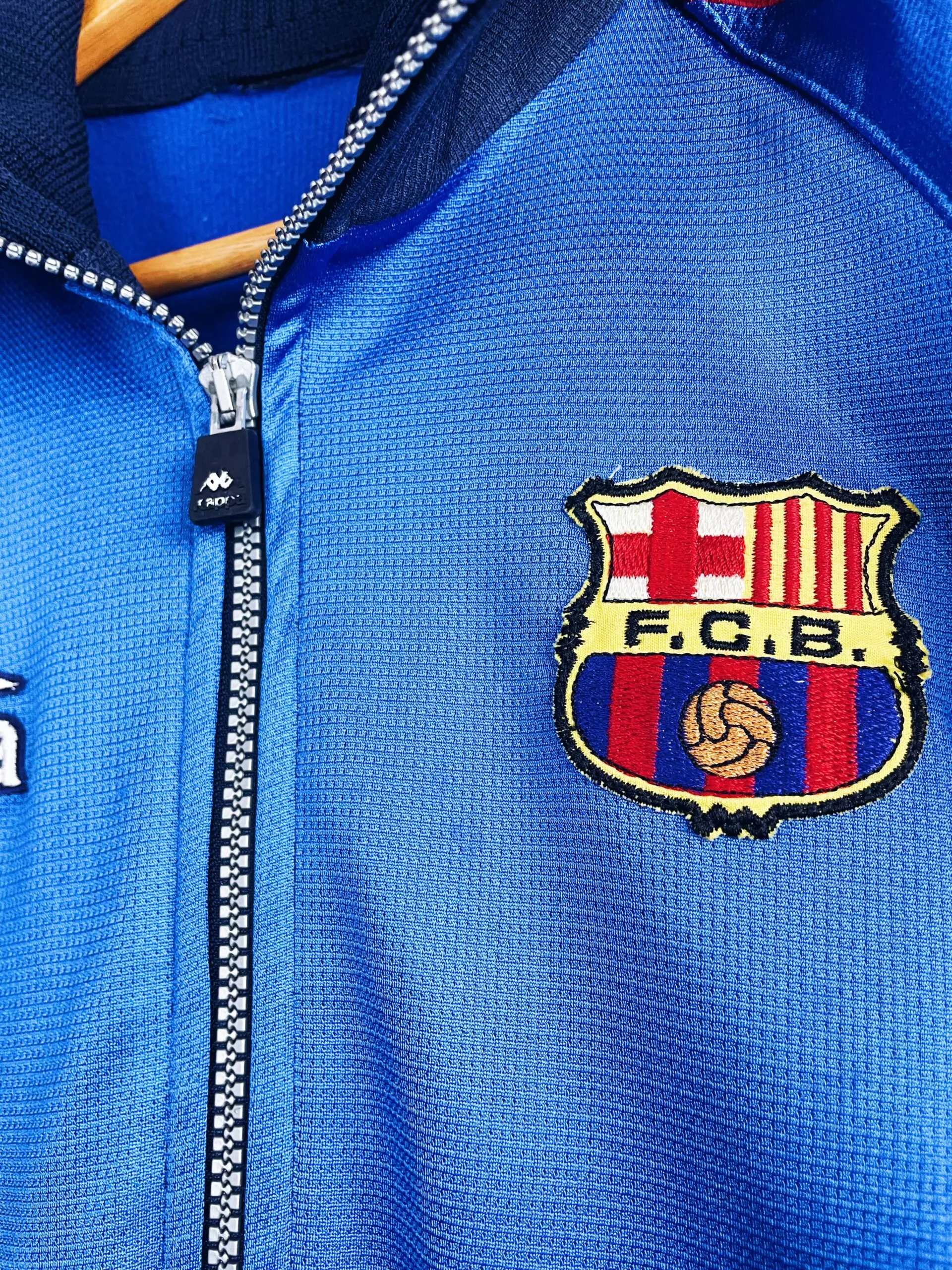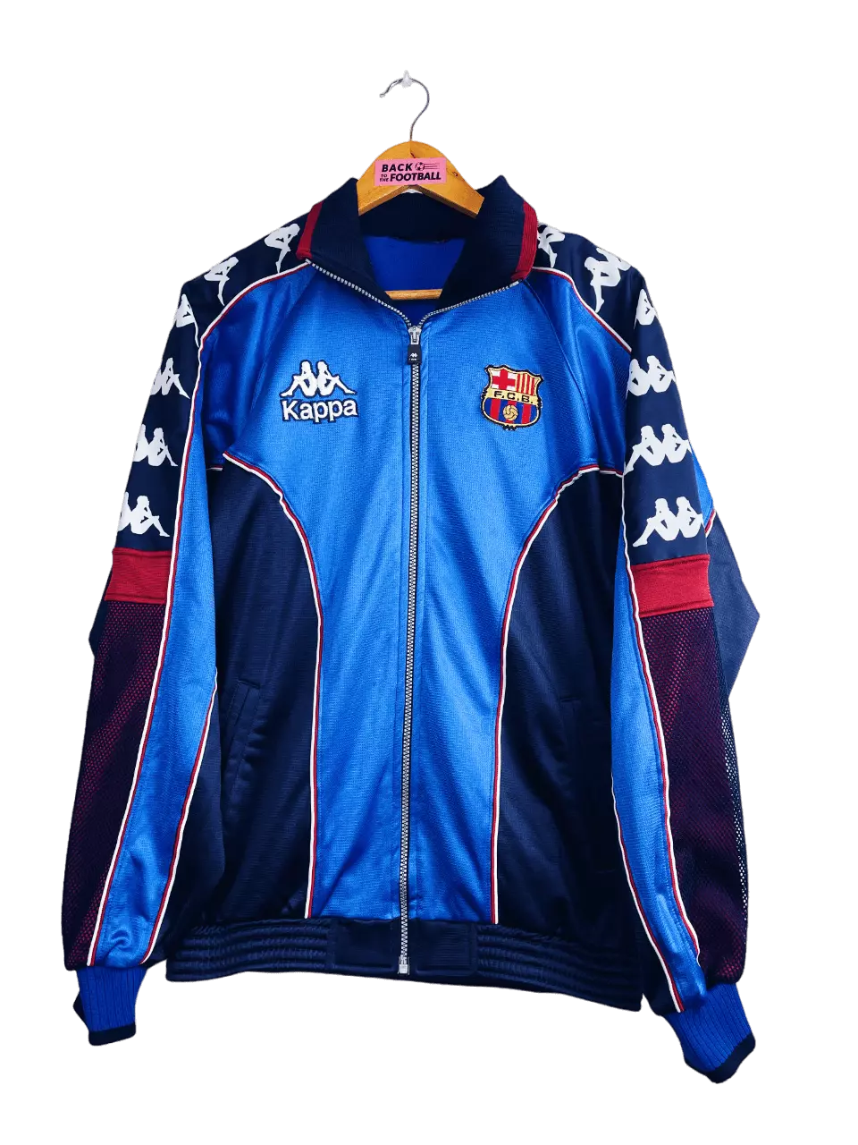 Taille : L mais peut aussi convenir à un M Etat : 8/10, très bon état La veste : veste vintage du FC Barcelone saisons 1995/1997. L’écusson et le logo Kappa sont brodés. Les manches Kappa sont superbes. Il y a 2 poches latérales. Très belle veste rétro du FC Barcelone ! Histoire : dernière saison sur le banc pour Johan Cruyff, la première saison. Les Blaugrana finiront sur le podium de Liga, derrière l’Atlético et Valence. Ils perdront en finale de Coupe du Roi contre l’Atlético encore une fois… Ils s’inclinent en demis de Coupe UEFA face au Bayern,…