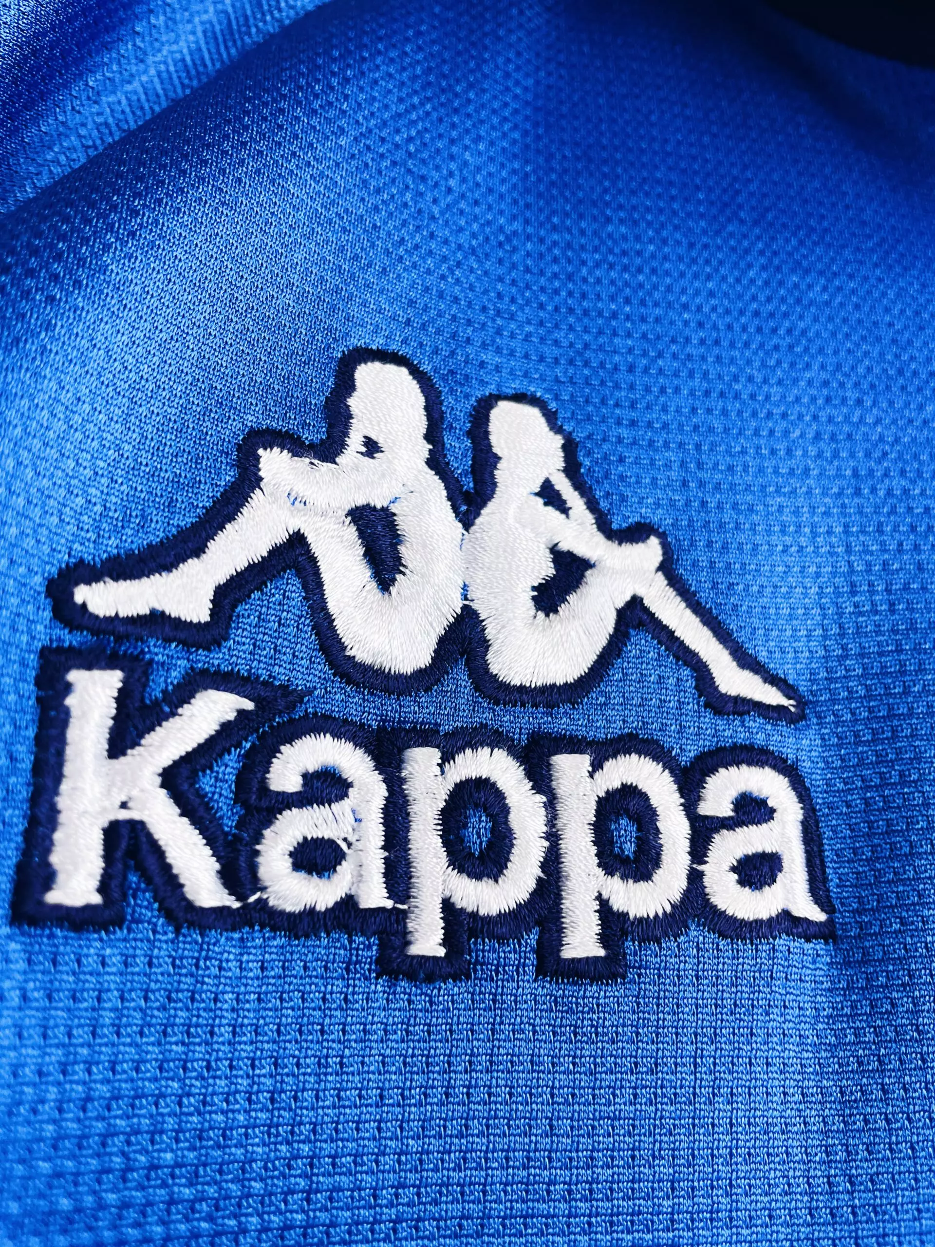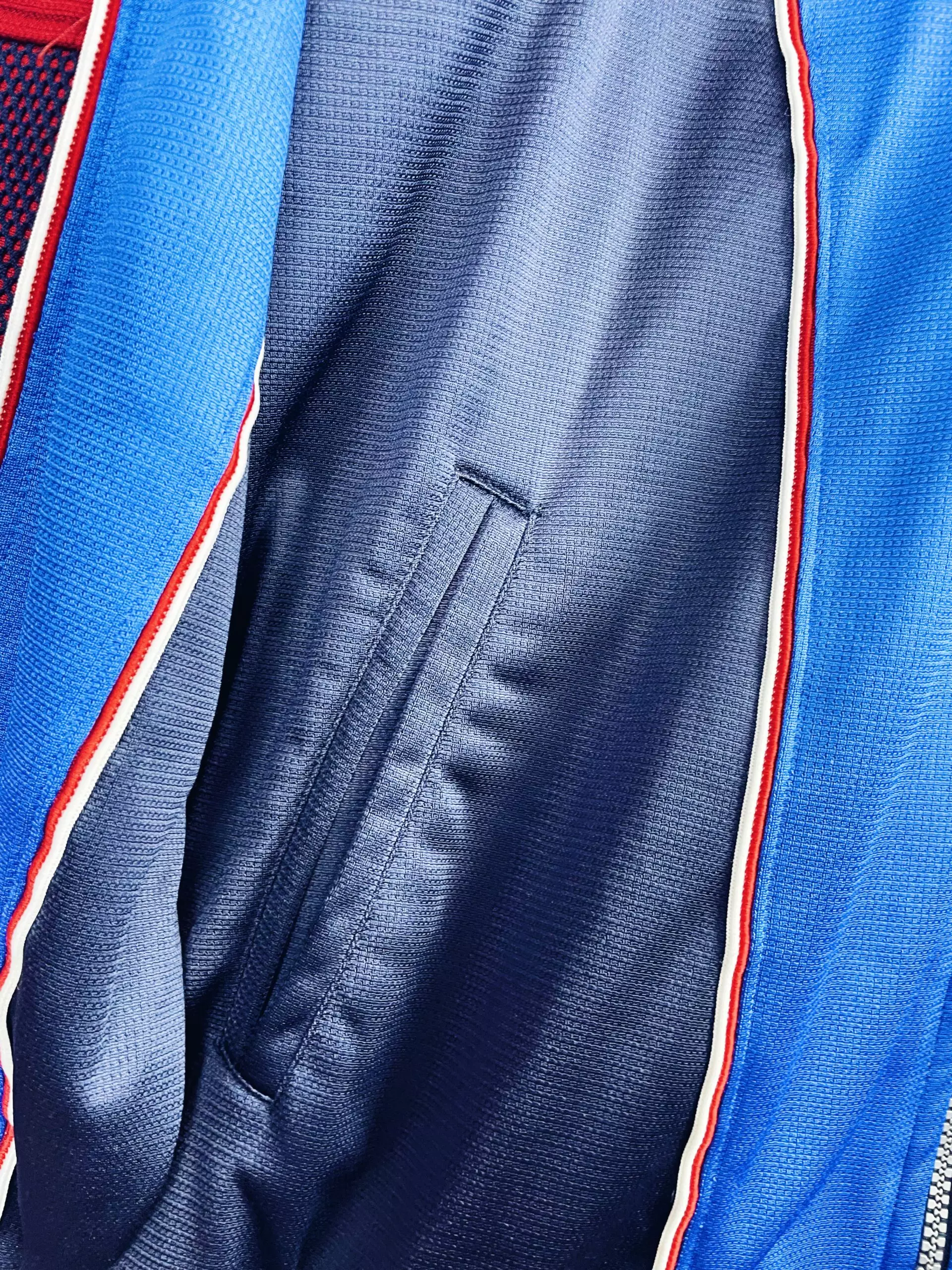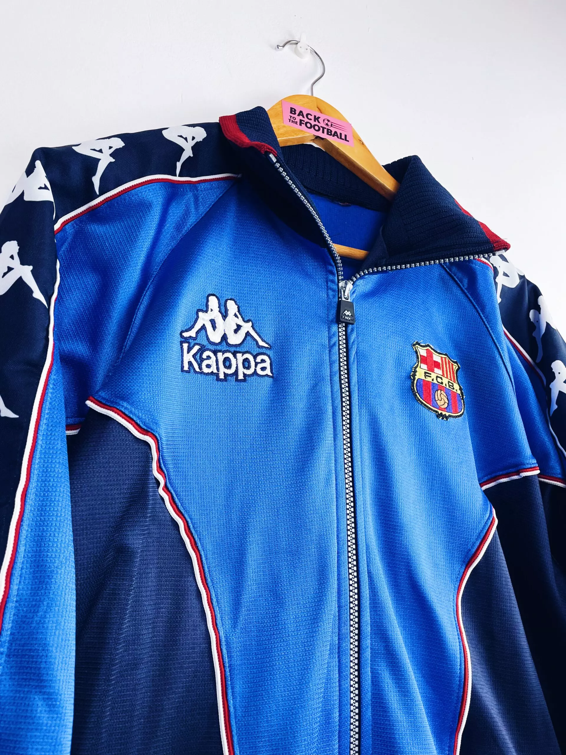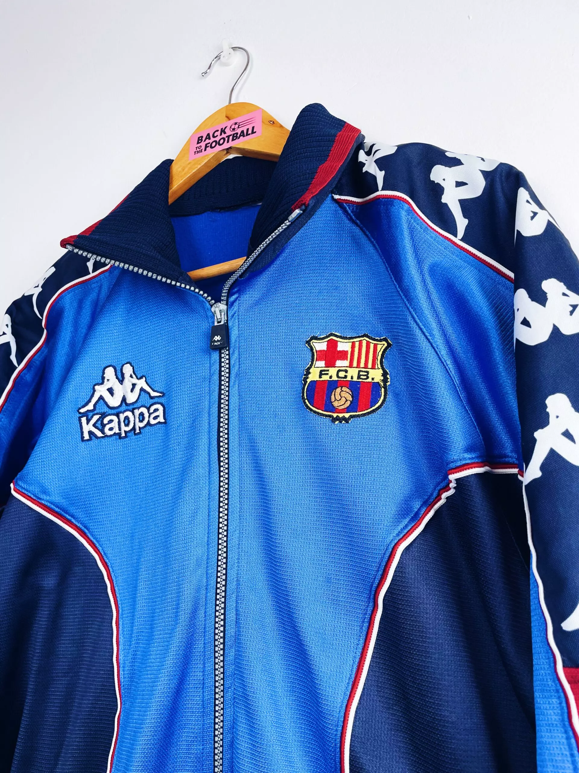 Taille : L mais peut aussi convenir à un M Etat : 8/10, très bon état La veste : veste vintage du FC Barcelone saisons 1995/1997. L’écusson et le logo Kappa sont brodés. Les manches Kappa sont superbes. Il y a 2 poches latérales. Très belle veste rétro du FC Barcelone ! Histoire : dernière saison sur le banc pour Johan Cruyff, la première saison. Les Blaugrana finiront sur le podium de Liga, derrière l’Atlético et Valence. Ils perdront en finale de Coupe du Roi contre l’Atlético encore une fois… Ils s’inclinent en demis de Coupe UEFA face au Bayern,…