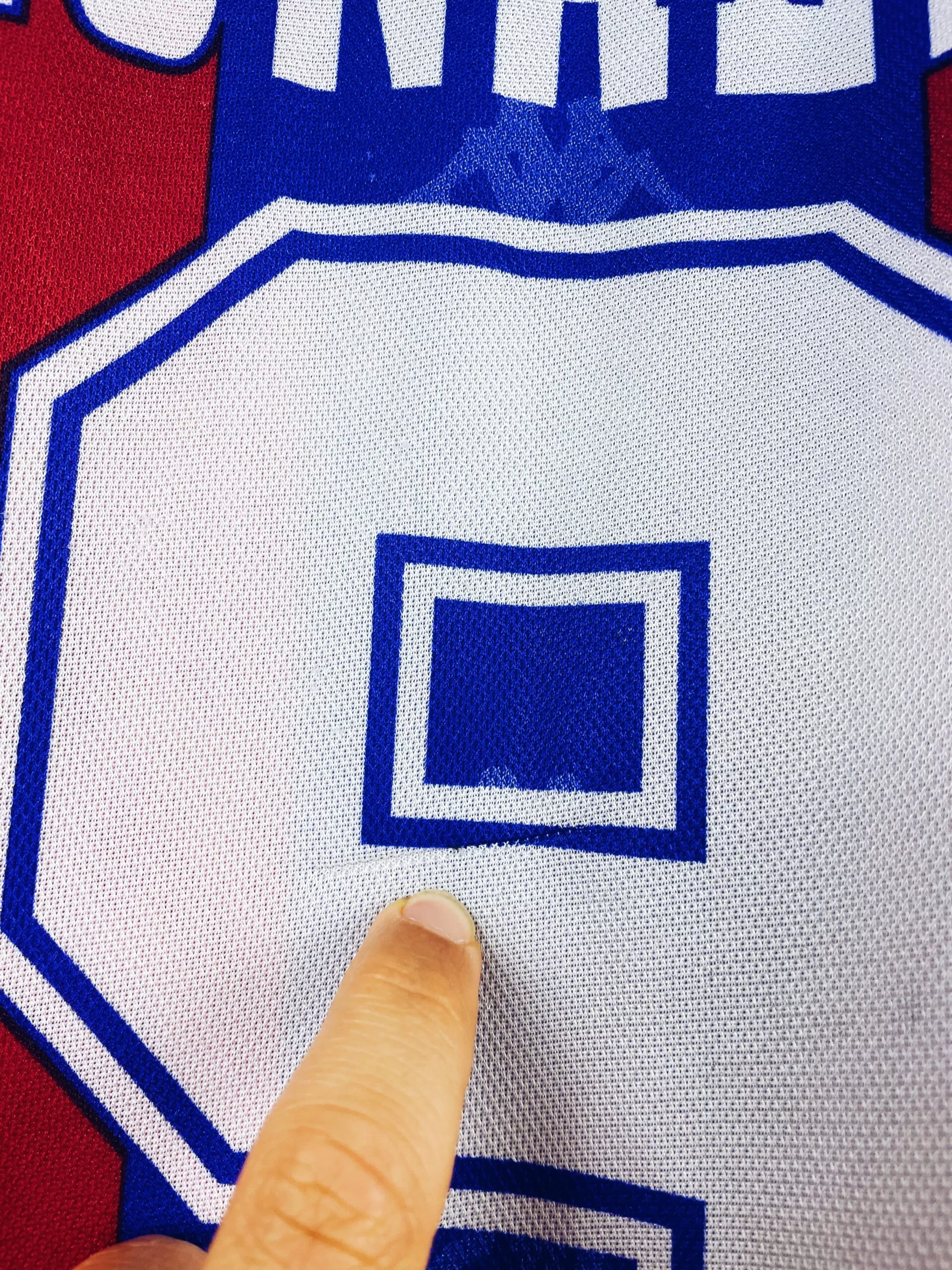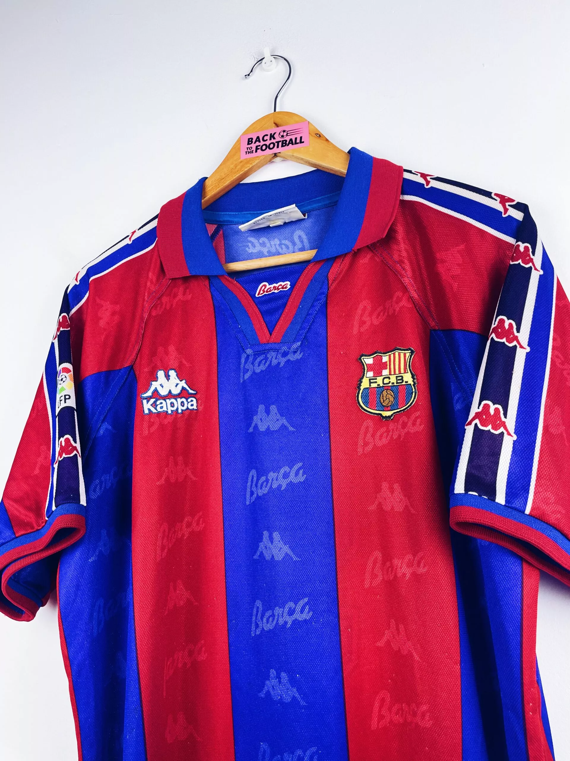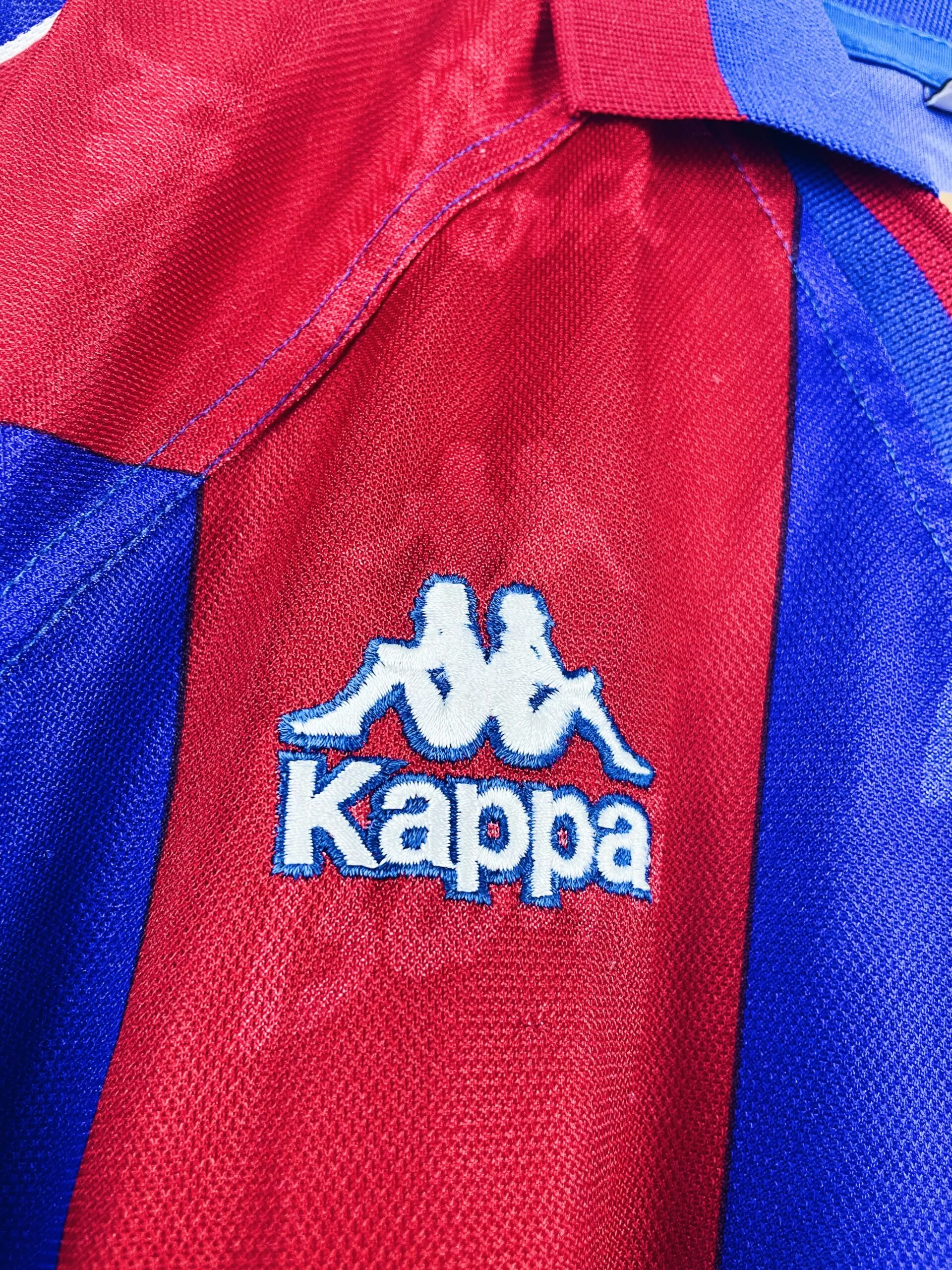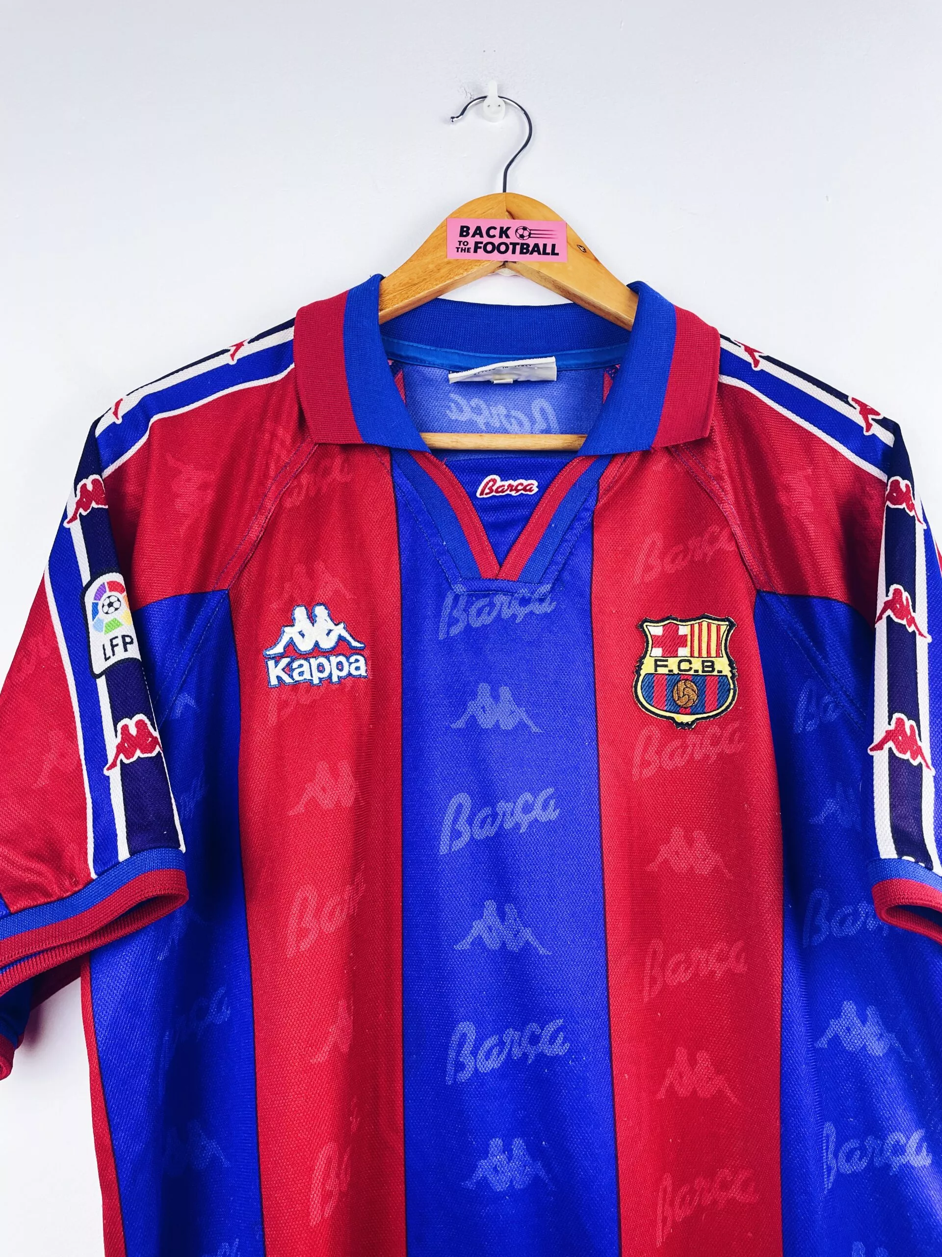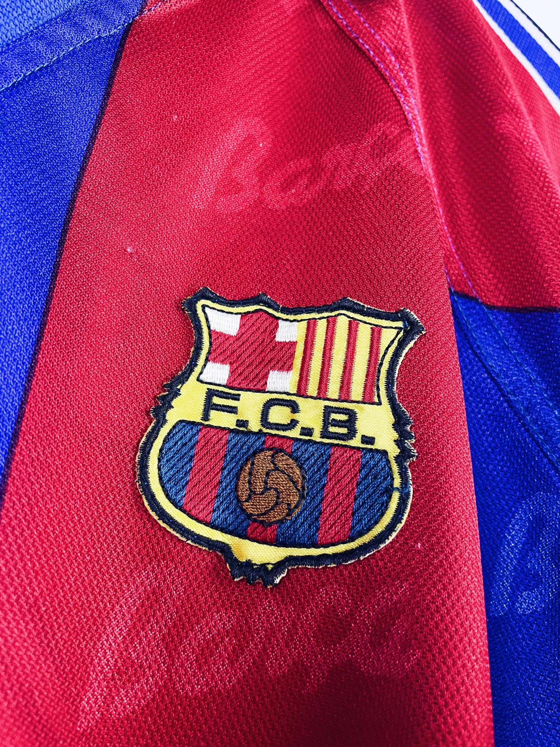 Taille : M Si tu veux plus d’infos, tu peux nous contacter par mail ou sur les réseaux 😉 Etat : 8/10, très bon état mais des bouloches et un accro au niveau du numéro 9 (voir photos) Le maillot : maillot vintage domicile du FC Barcelone 1996/1997 floqué Ronaldo #9. C’est un maillot issu du stock pro (player issue) : Ronaldo #9 incrusté et patch Liga. L’écusson et le logo Kappa sont brodés. On peut voir en tramé sur tout le maillot le logo de l’équipementier. Très beau maillot rétro de Barcelone ! Histoire : Ronaldo débarque du PSV.…