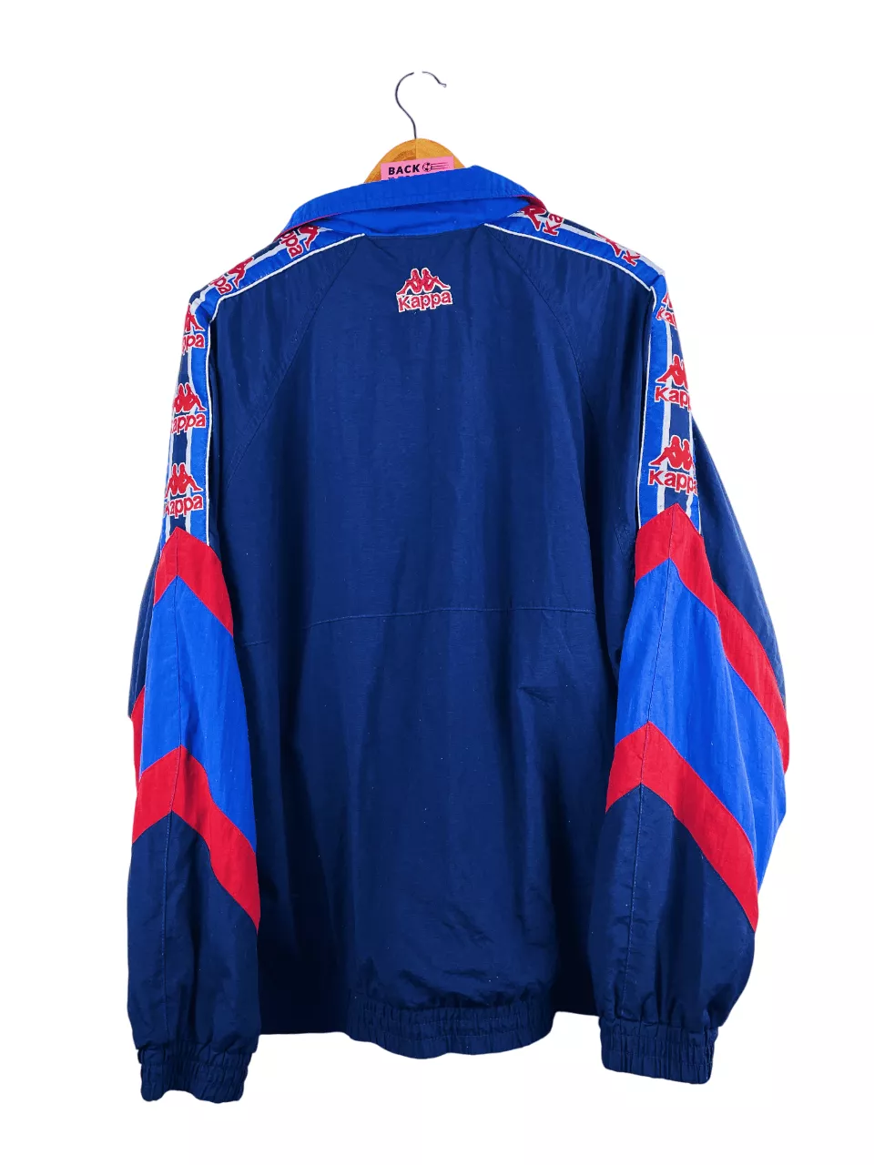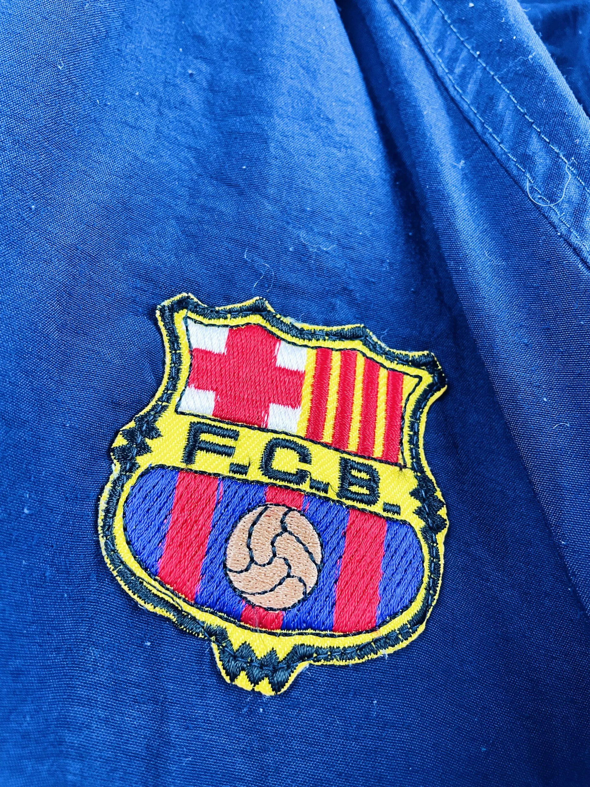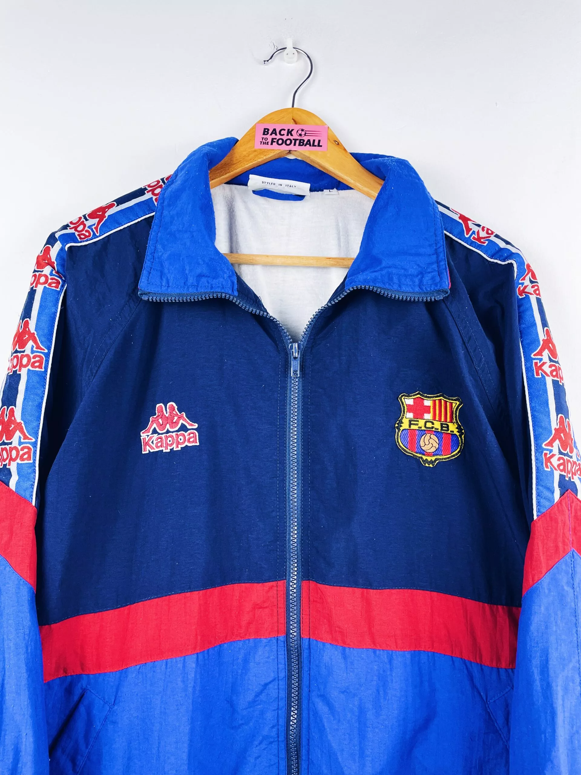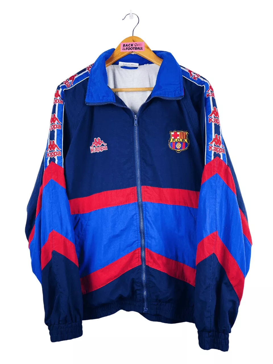 Taille : L Etat : 8.5/10, très bon état, quelques peluches La veste : veste vintage du FC Barcelone 1995/1997. L’écusson et le logo Kappa sont brodés. Les manches Kappa sont superbes. Il y a 2 poches latérales. Très belle veste rétro du FC Barcelone ! Histoire : dernière saison sur le banc pour Johan Cruyff, la première saison. Les Blaugrana finiront sur le podium de Liga, derrière l’Atlético et Valence. Ils perdront en finale de Coupe du Roi contre l’Atlético encore une fois… Ils s’inclinent en demis de Coupe UEFA face au Bayern, futur vainqueur. La saison suivante, Ronaldo…