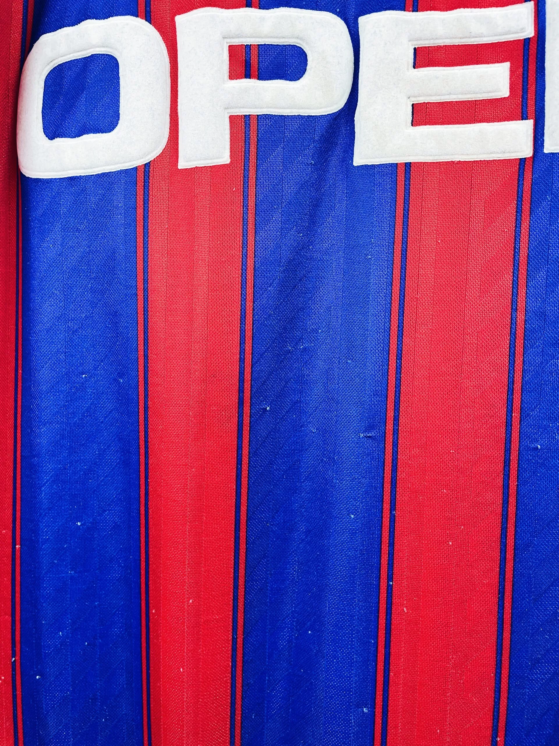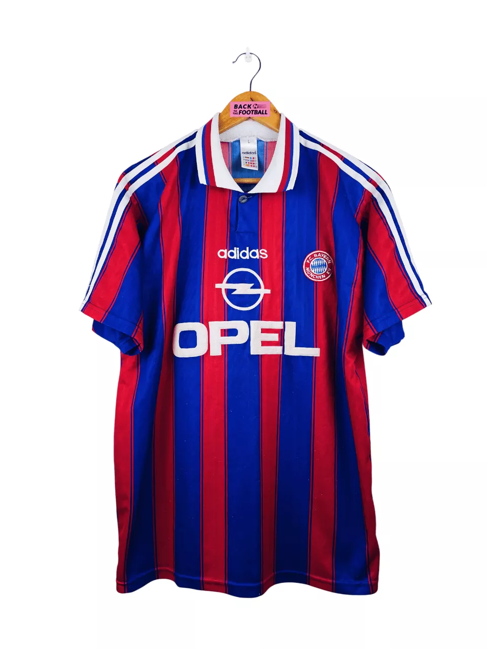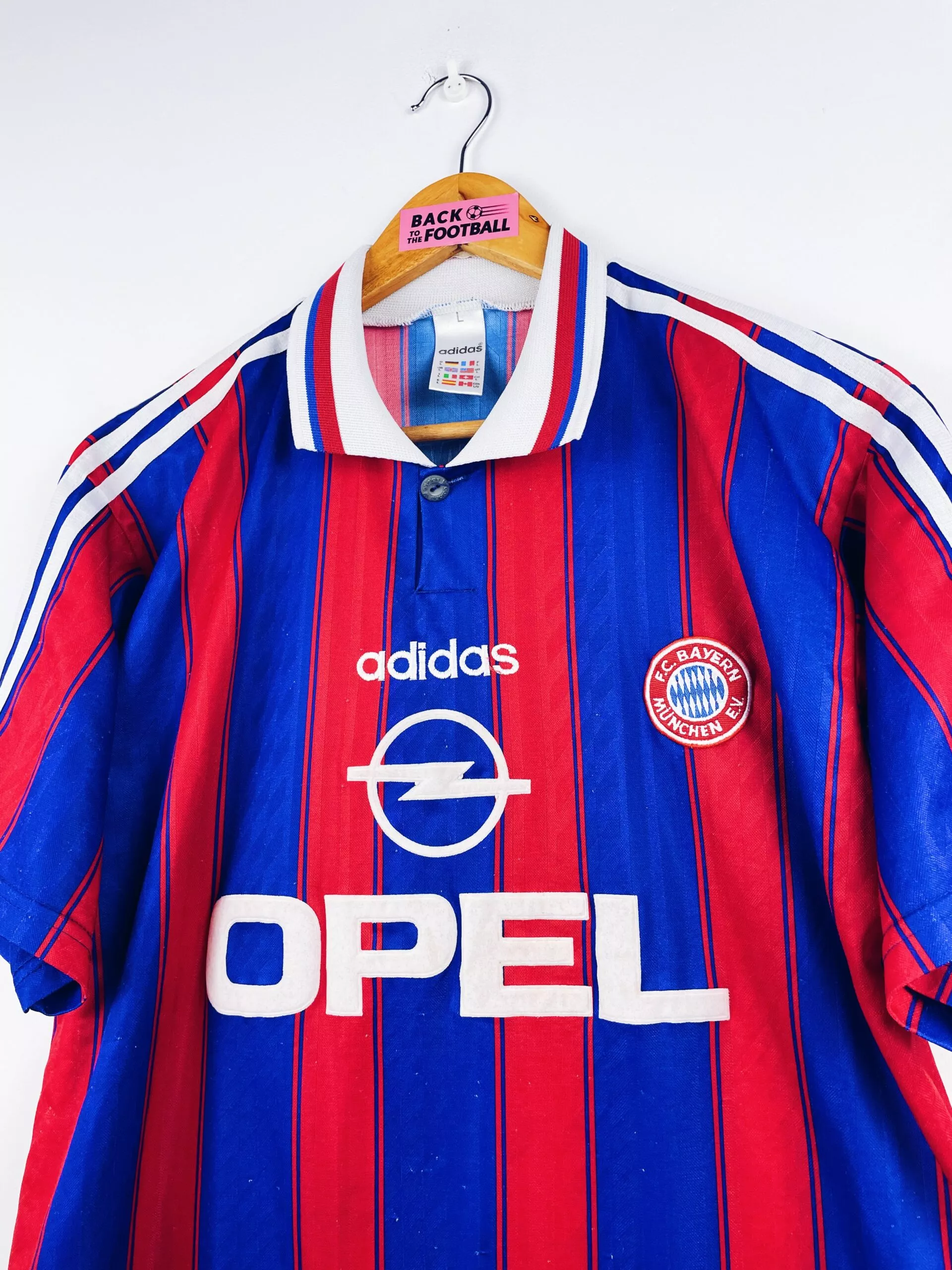 Taille : L Si tu veux plus de détails, tu peux nous contacter par mail ou sur les réseaux 😉 Etat : 7.5/10, très bon état mais des bouloches (voir photos) Le maillot : maillot vintage domicile du Bayern Munich 1995/1997. L’écusson du club et le logo Adidas sont brodés, le sponsor Opel est en feutrine. Très beau maillot rétro du Bayern Munich ! Histoire : les bavarois termineront le championnat à la deuxième place la première saison, derrière le Borussia Dortmund. Ils gagneront la coupe de l’UEFA face aux Girondins de Bordeaux, avec notamment deux buts de Scholl sur…