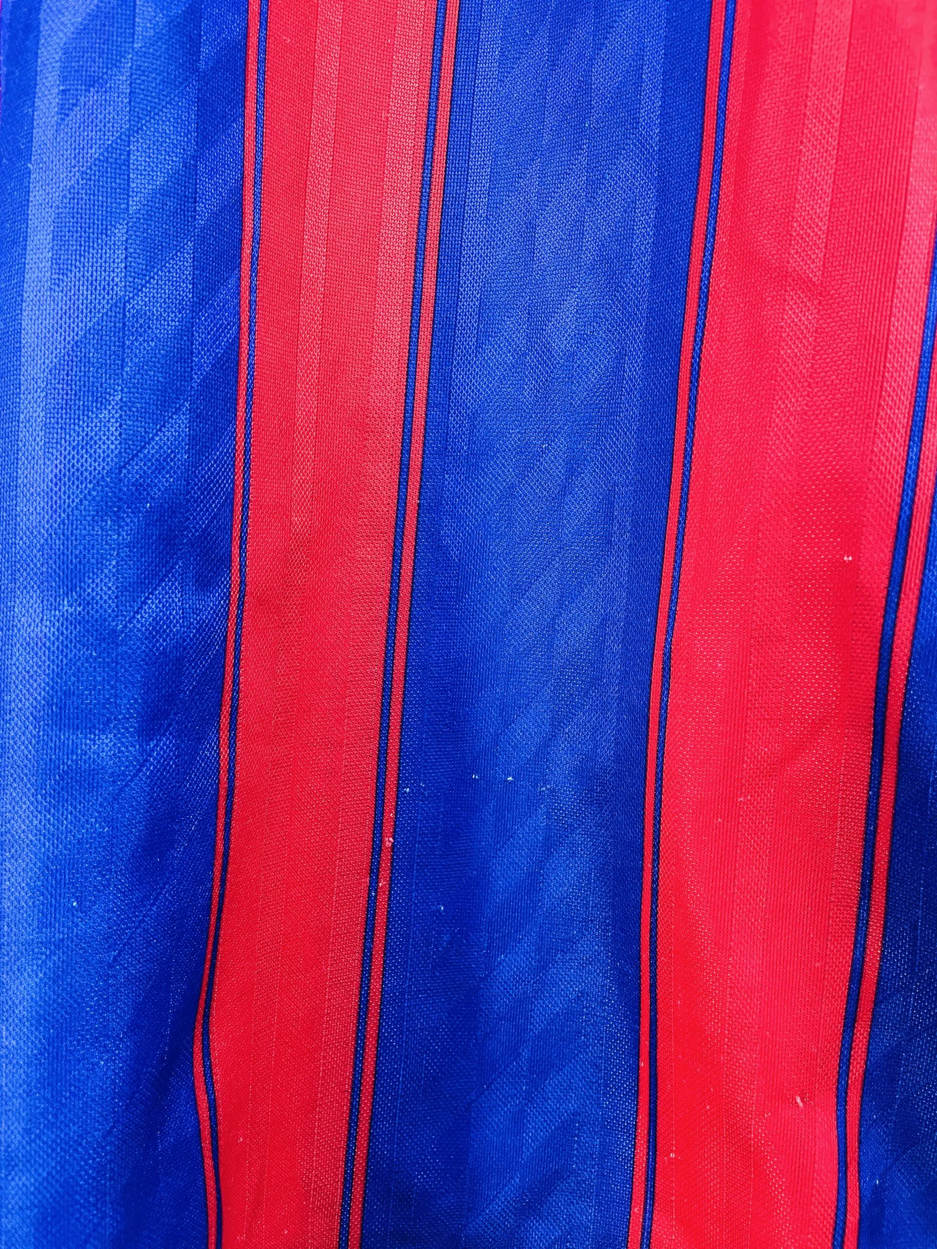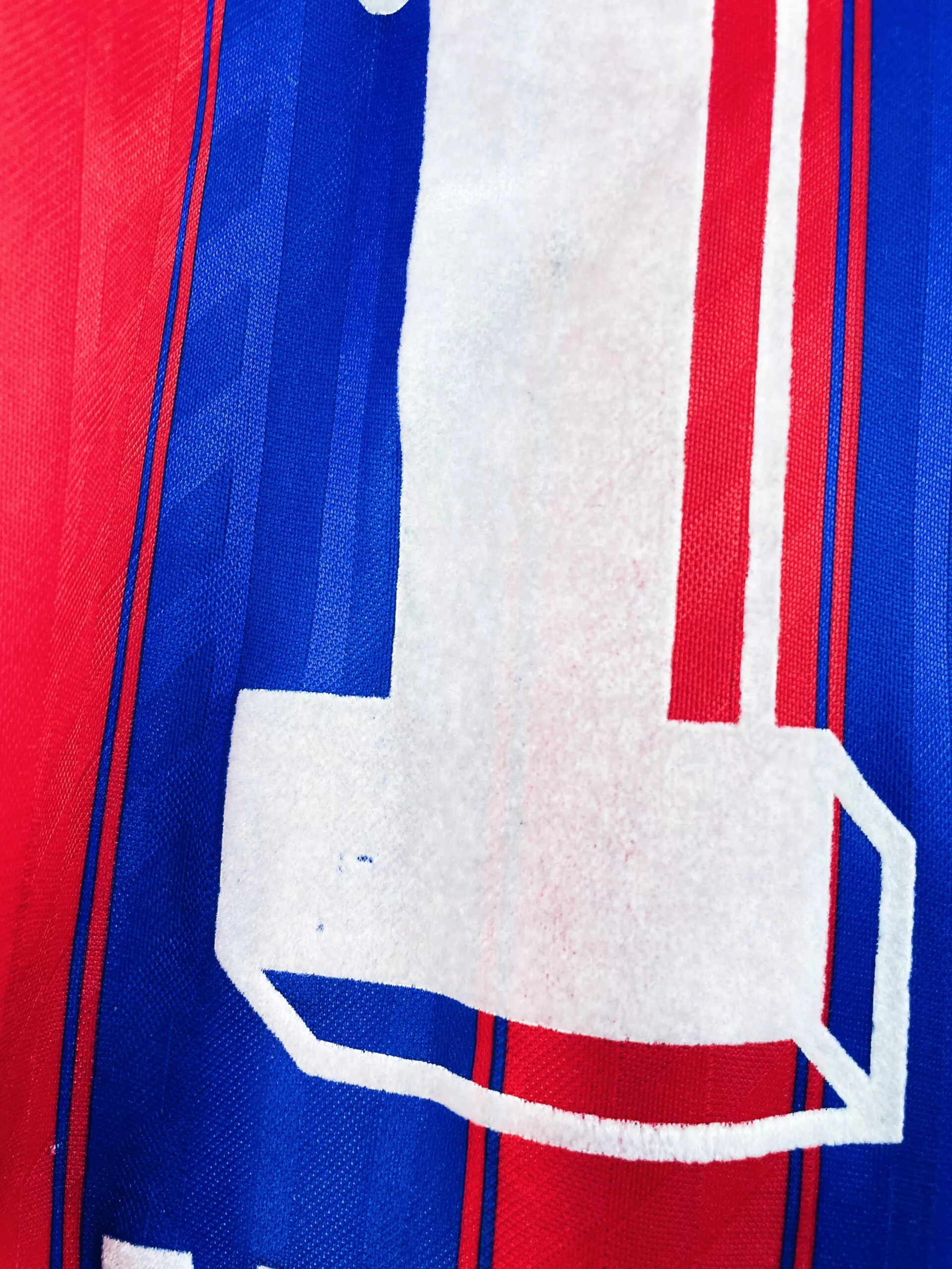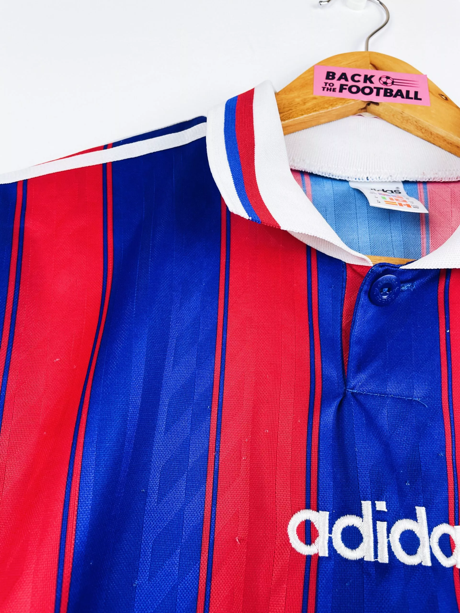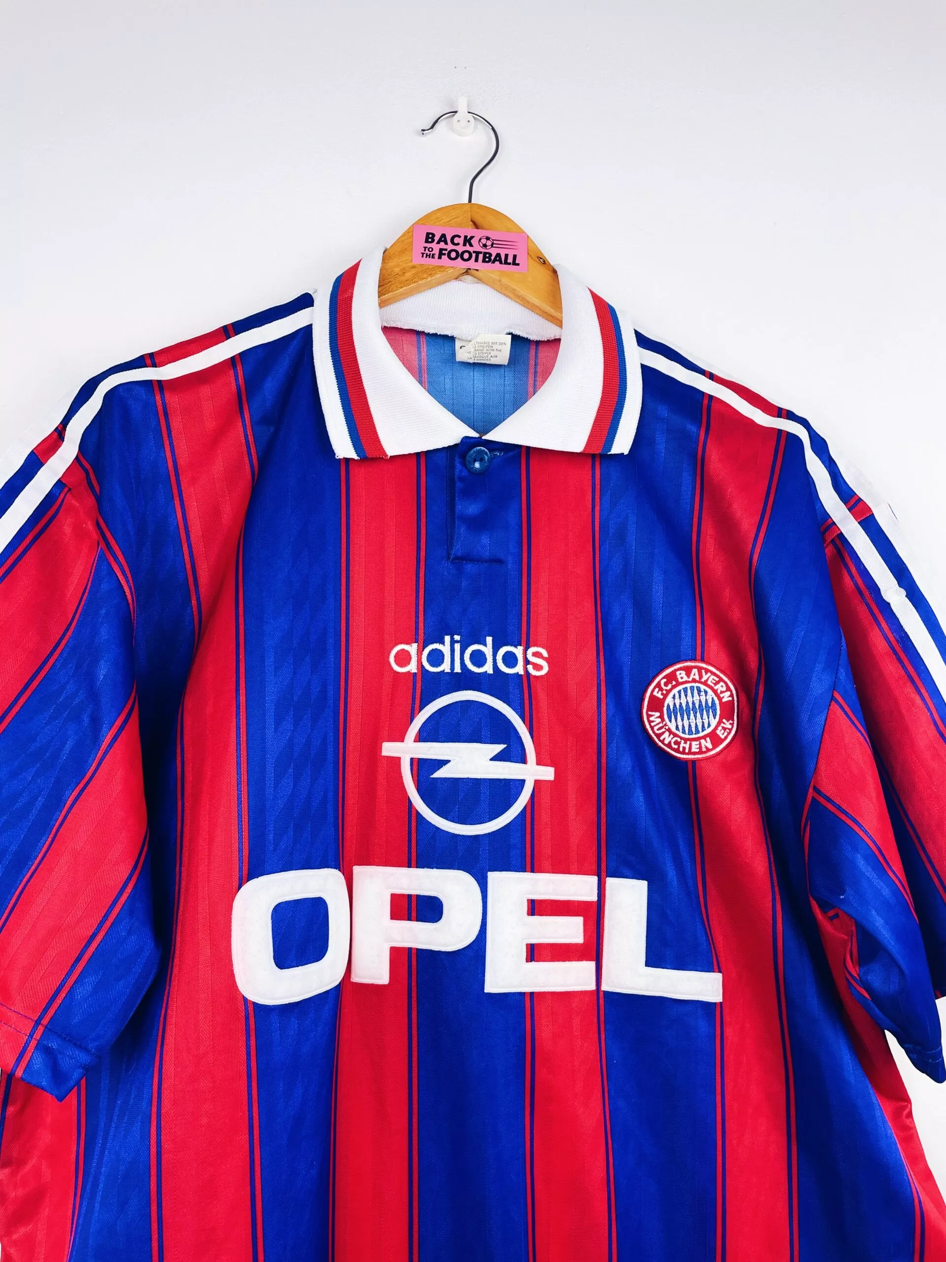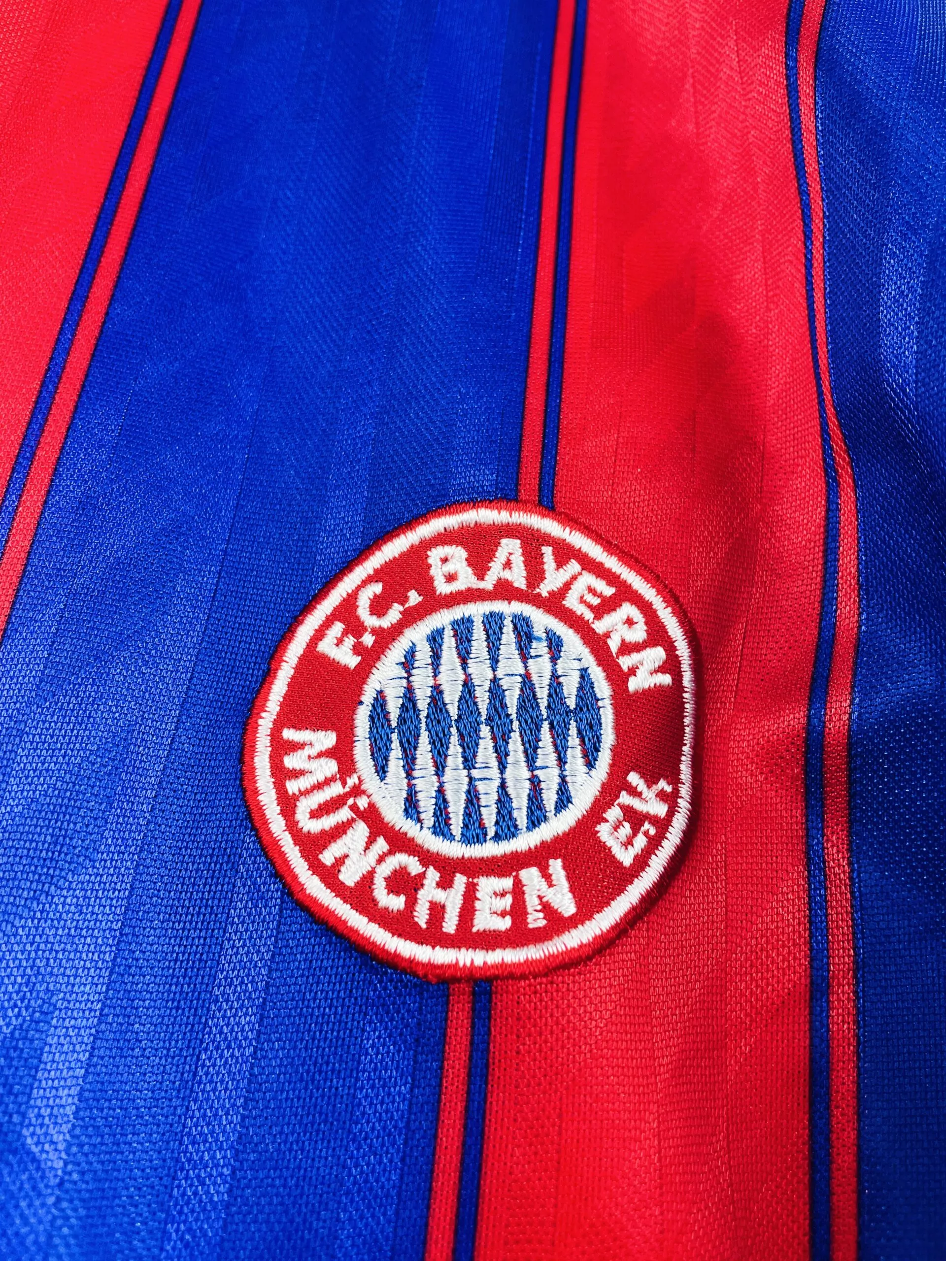 Taille : M Si tu veux plus de détails, tu peux nous contacter par mail ou sur les réseaux 😉 Etat : 7.5/10, très bon état général mais des petites bouloches, la feutrine dans le dos est usée et la feutrine Opel un peu noircie sur un endroit (voir photos) Le maillot : maillot vintage domicile du Bayern Munich 1995/1997 floqué Matthaüs. L’écusson du club et le logo Adidas sont brodés, le sponsor Opel est en feutrine, Matthaüs #10 est aussi en feutrine. Très beau maillot rétro du Bayern Munich ! Histoire : les bavarois termineront le championnat à la…