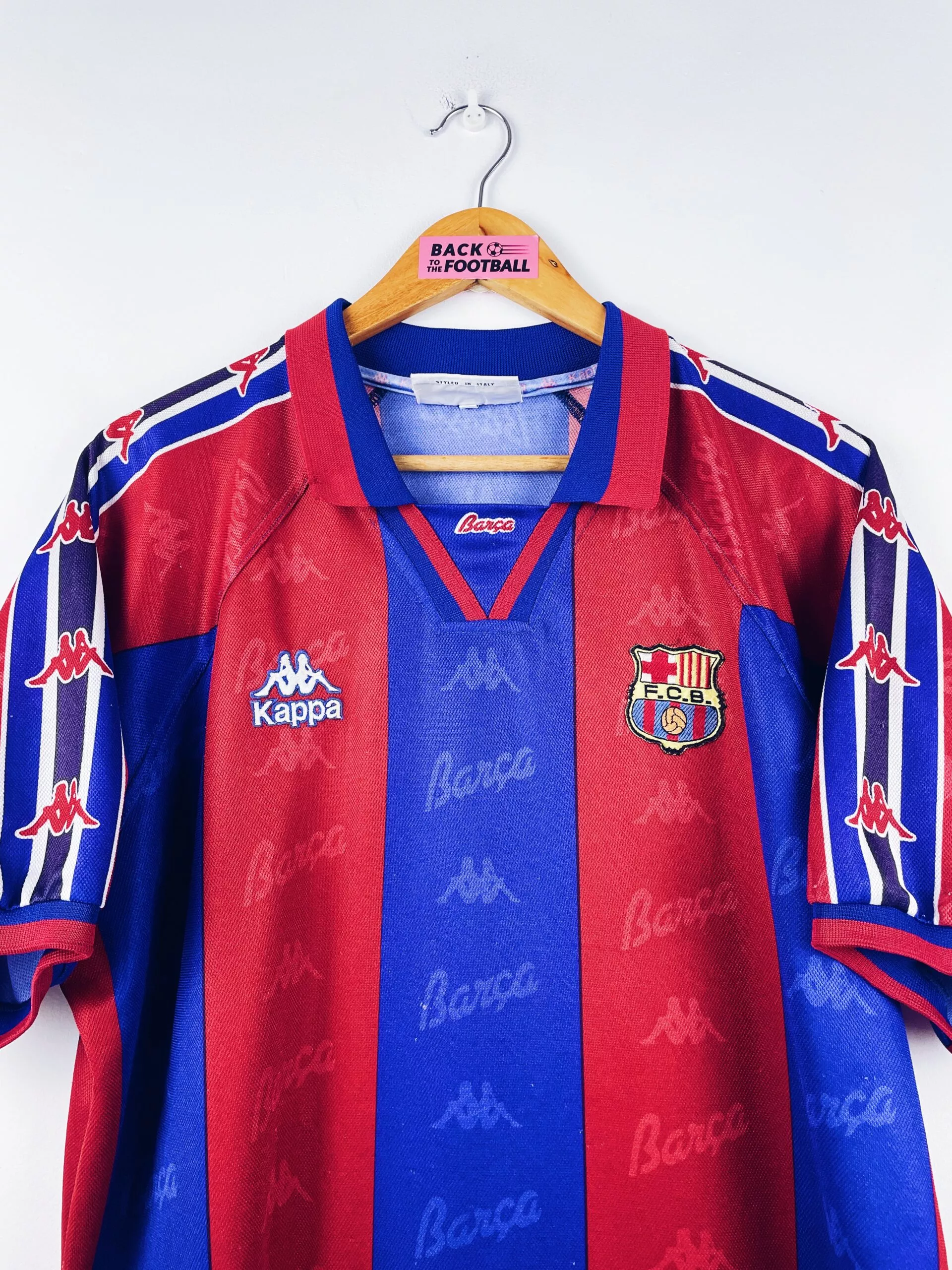 Taille : L Largeur : 57cm (aisselle à aisselle) Longueur : 73cm (base du col au bas) Si tu veux plus d’infos, tu peux nous contacter par mail ou sur les réseaux 😉 Etat : 8/10, très bon état. Petites bouloches (voir photo) Le maillot : maillot vintage domicile du FC Barcelone 1995/1997. L’écusson et le logo Kappa sont brodés. On peut voir en tramé sur tout le maillot le logo de l’équipementier. Très beau maillot rétro de Barcelone ! Histoire : dernière saison sur le banc pour Johan Cruyff, la première saison. Les Blaugrana finiront sur le podium de…