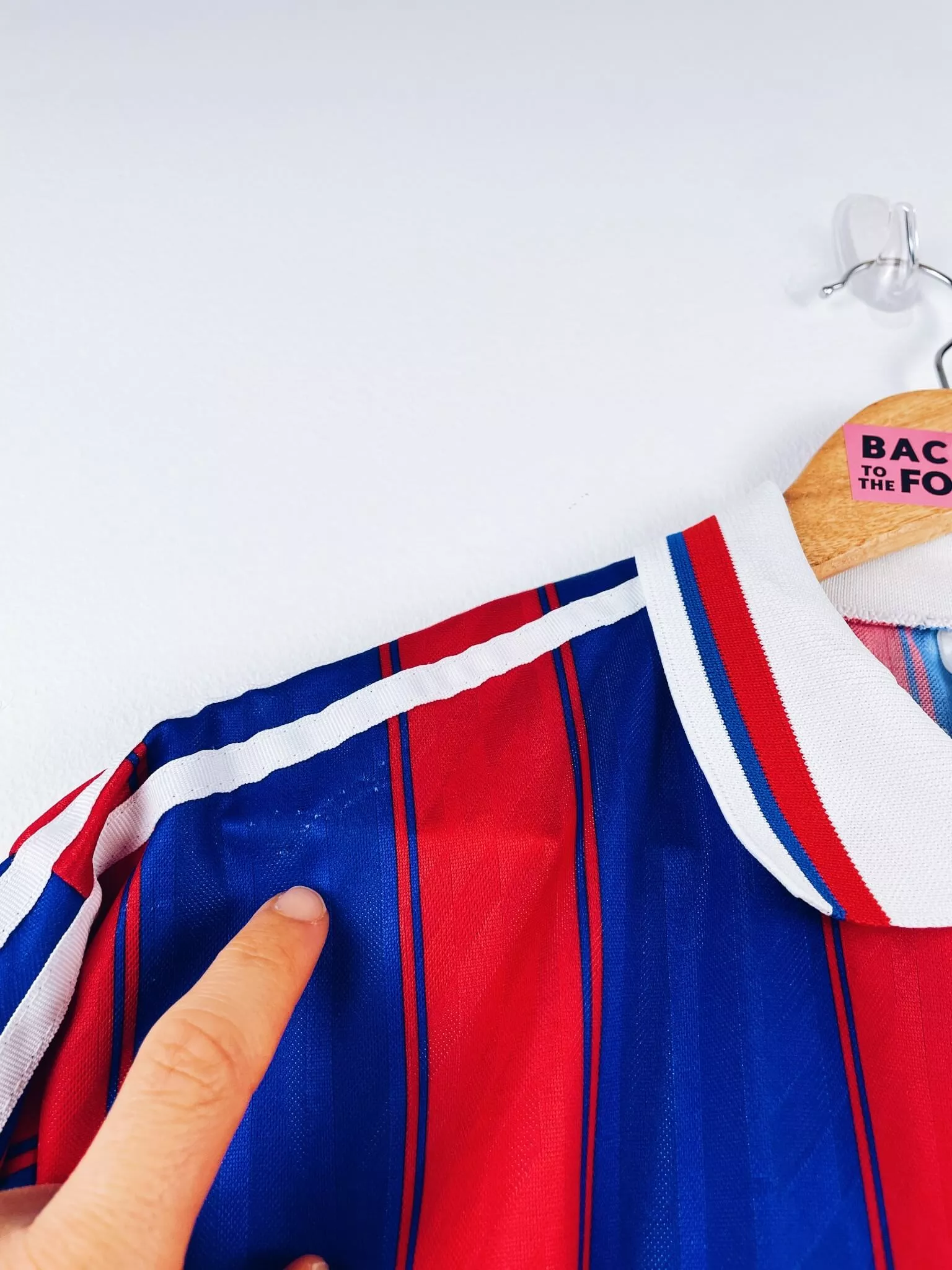 Taille : L Largeur : 55cm (aisselle à aisselle) Longueur : 74cm (base du col au bas) Si tu veux plus de détails, tu peux nous contacter par mail ou sur les réseaux 😉 Etat : 8.5/10, excellent état hormis des bouloches en haut du dos (voir photo) Le maillot : maillot vintage domicile du Bayern Munich 1995/1997. L’écusson du club et le logo Adidas sont brodés, le sponsor Opel est en feutrine. Très beau maillot rétro du Bayern Munich ! Histoire : les bavarois termineront le championnat à la deuxième place la première saison, derrière le Borussia Dortmund. Ils…